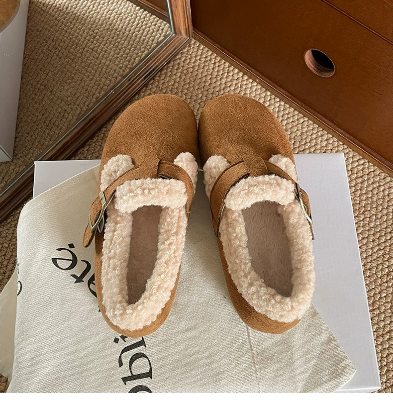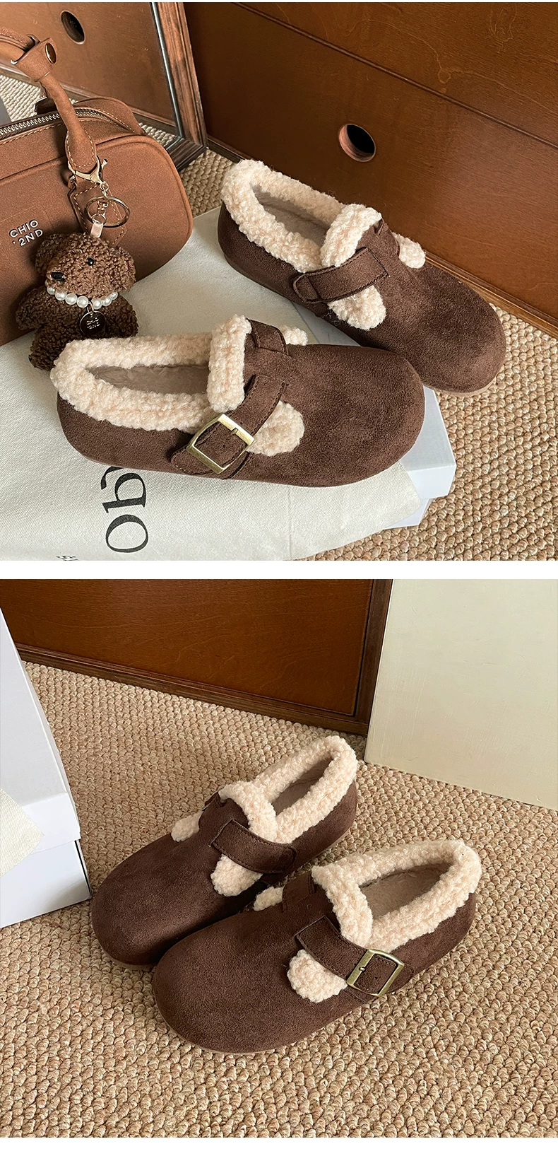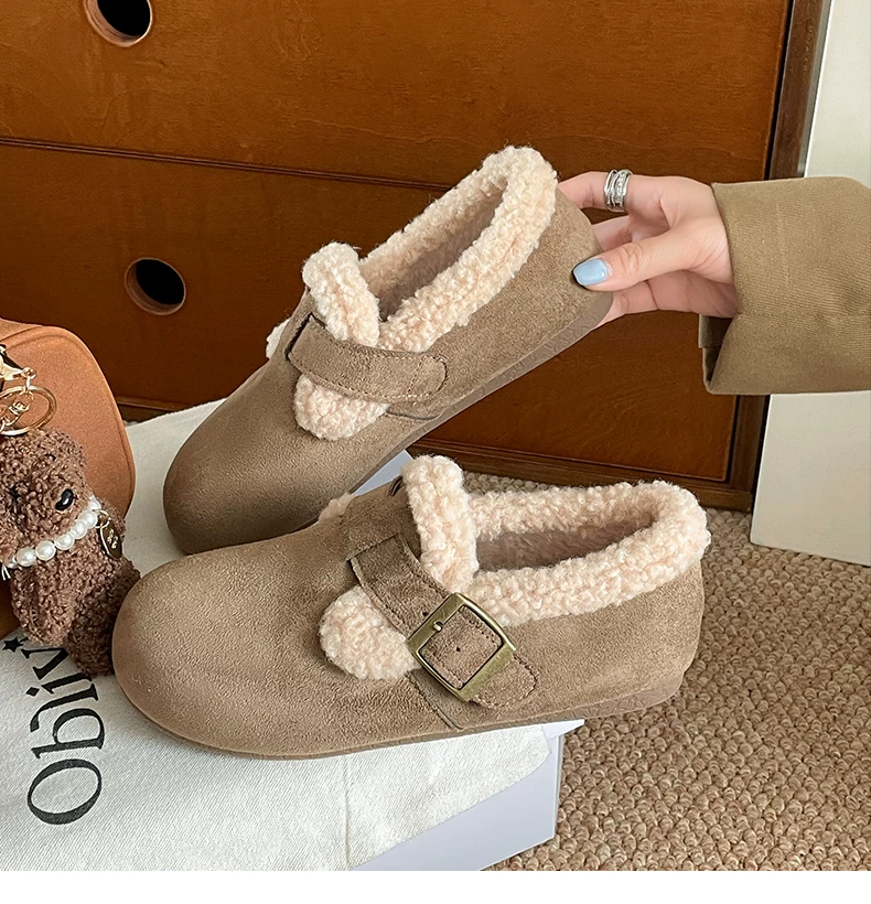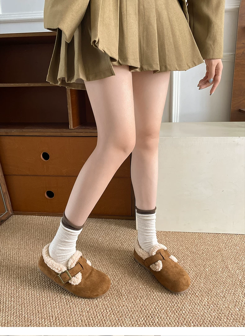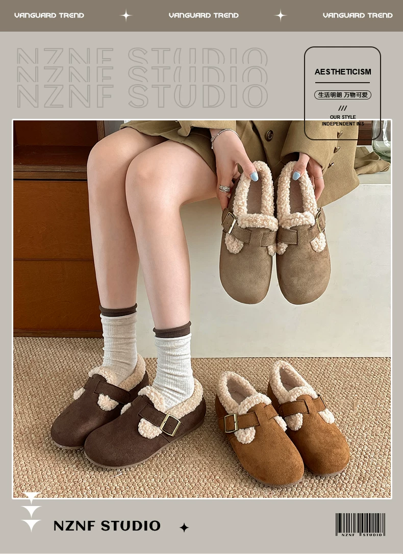 - Giày Birkenstock nhung đế bằng màu nâu cổ điển dành cho nữ, kiểu dáng thu đông 2025 mới, phối cùng chân váy và giày bông giữ ấm đi tuyết