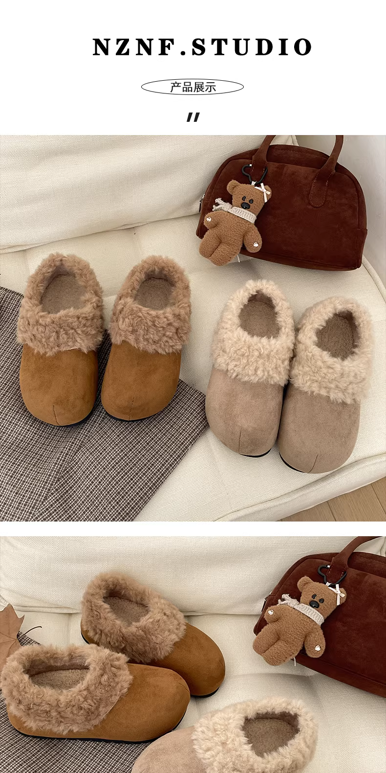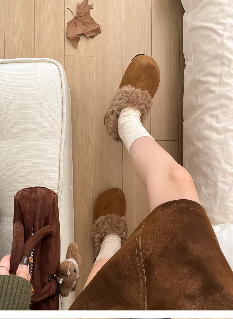 • Giày bông giữ ấm lót lông dày đế dày màu trắng cổ điển dành cho nữ mùa đông 2025, kiểu dáng mới, ấm áp, kiểu Birkenstock