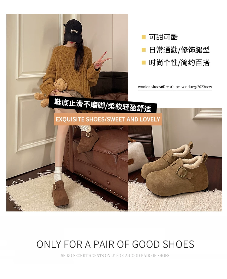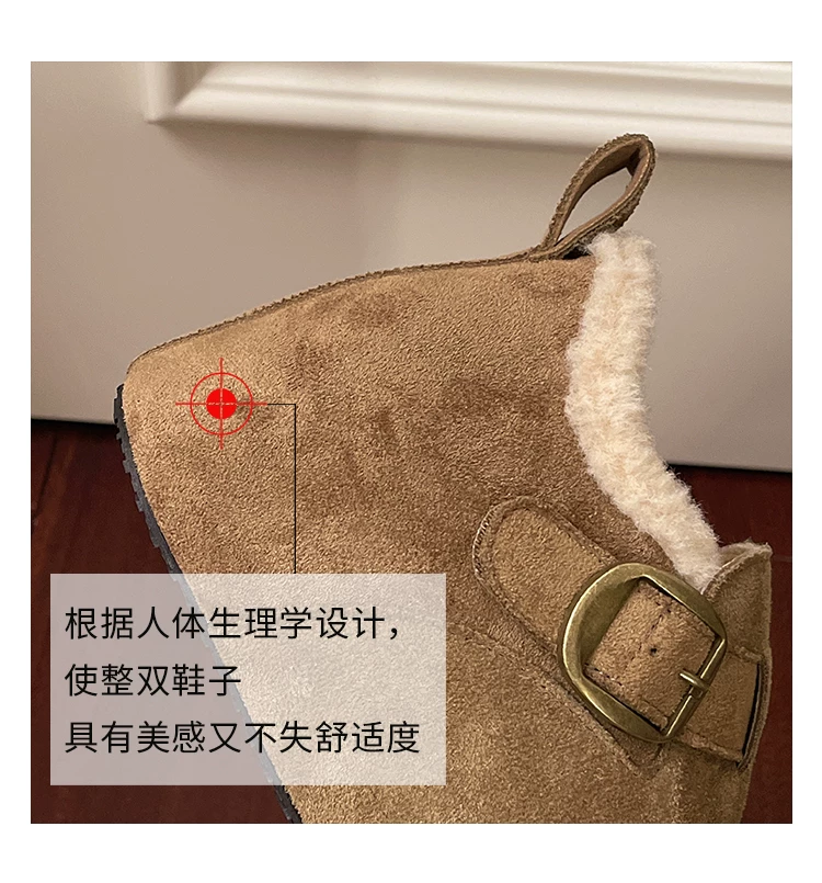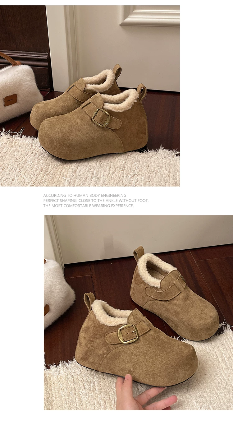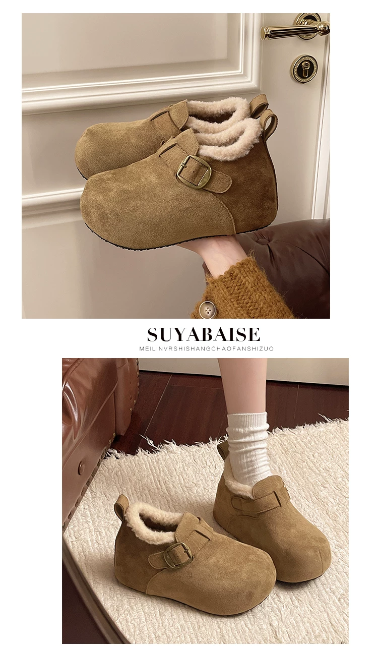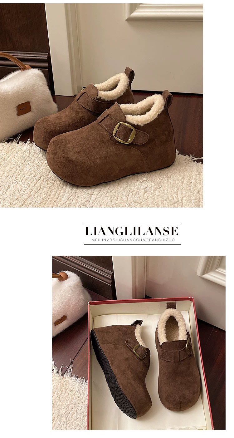• Giày bông tuyết đế dày kiểu Pháp màu nâu cổ điển dành cho nữ mùa đông 2025 kiểu mới, giữ ấm, lót lông cừu, dày dặn, kiểu Birkenstock
