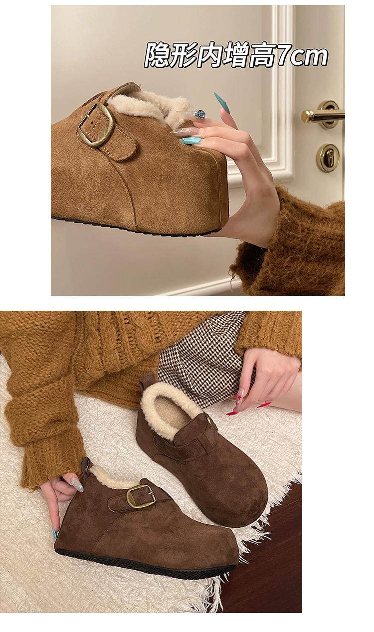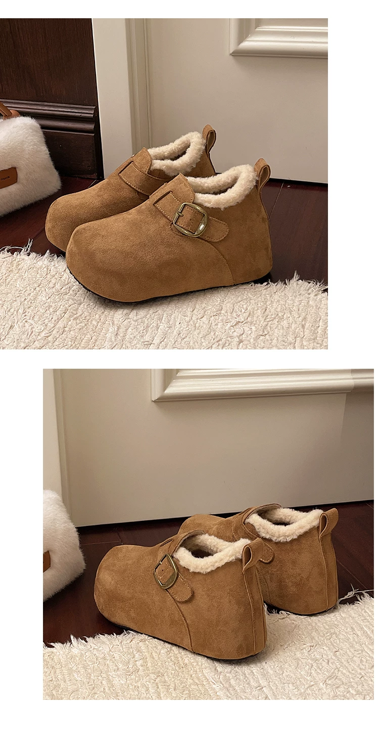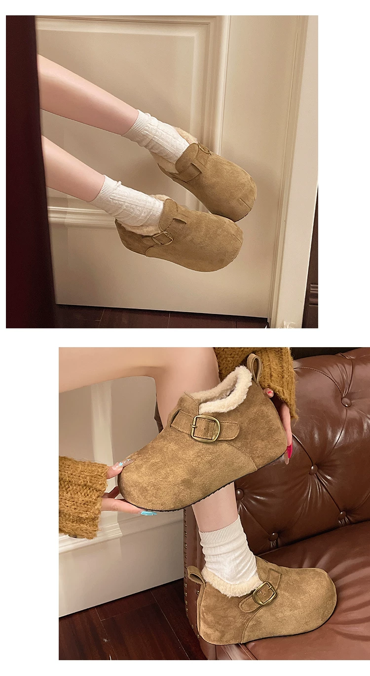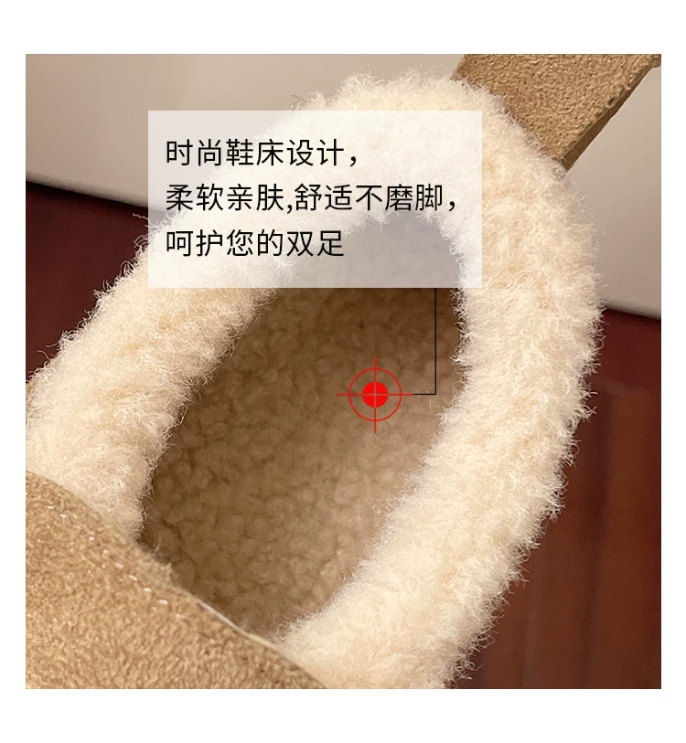 Giày bông tuyết đế dày kiểu Pháp màu nâu cổ điển dành cho nữ mùa đông 2025 kiểu mới, giữ ấm, lót lông cừu, dày dặn, kiểu Birkenstock