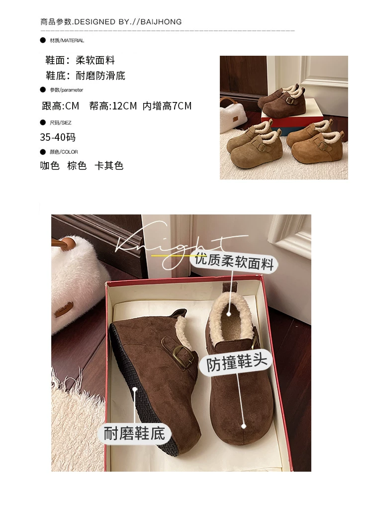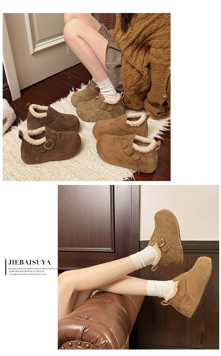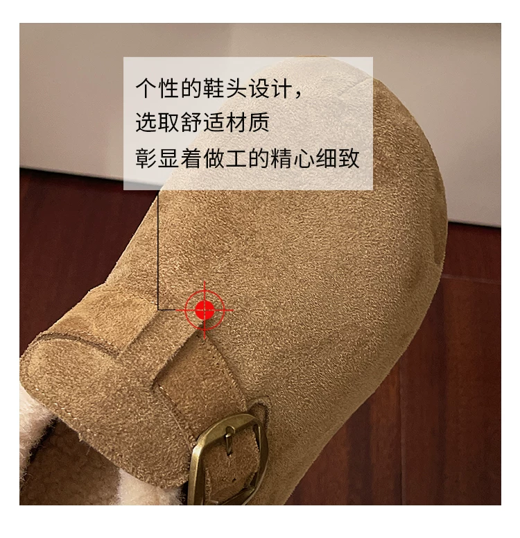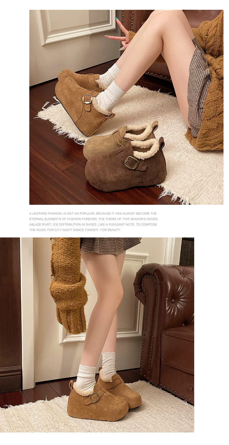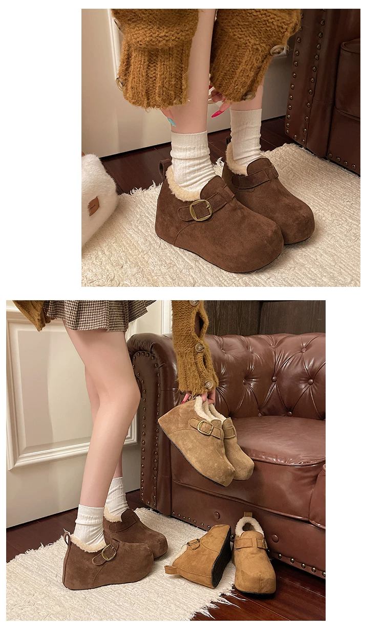 Giày bông tuyết đế dày kiểu Pháp màu nâu cổ điển dành cho nữ mùa đông 2025 kiểu mới, giữ ấm, lót lông cừu, dày dặn, kiểu Birkenstock