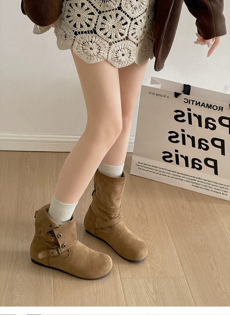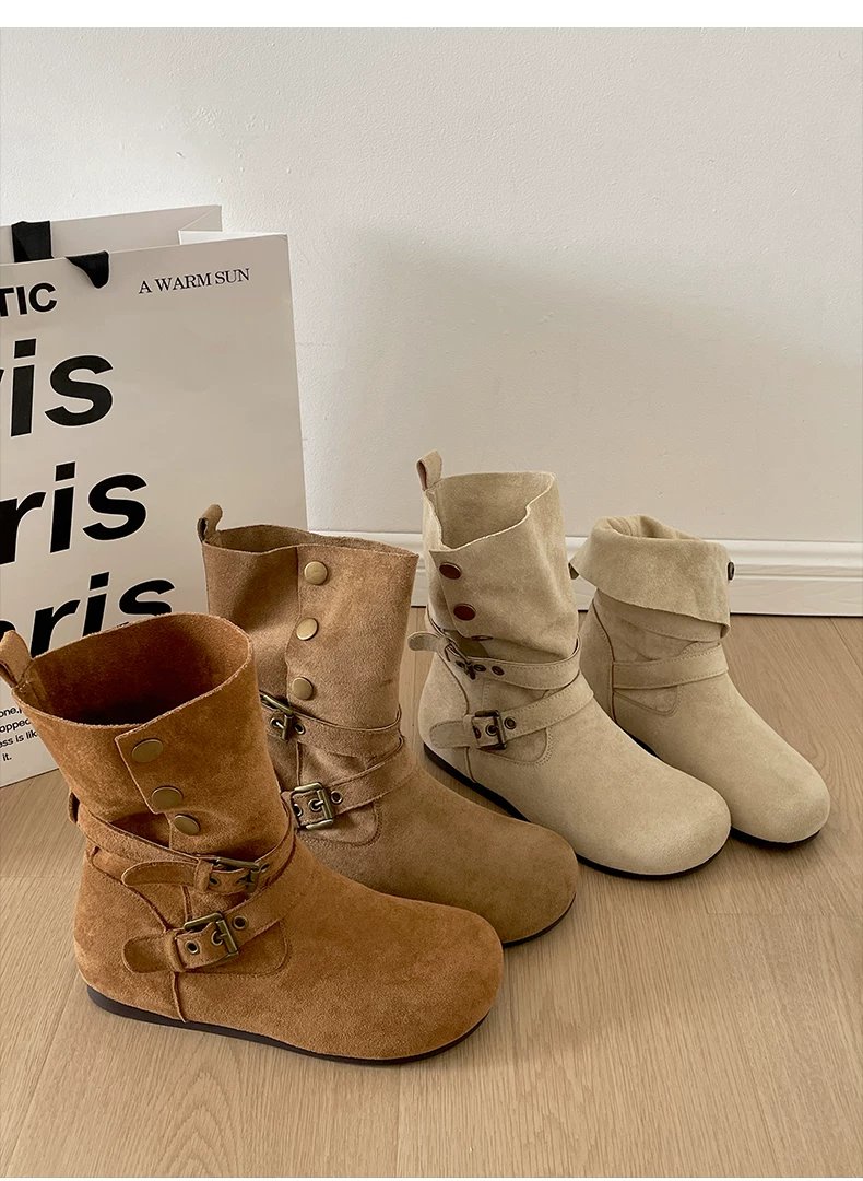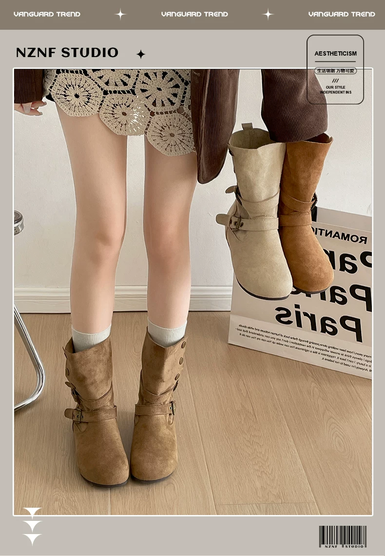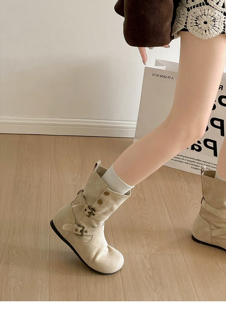 Giày bốt đế dày màu kaki Meilade dành cho nữ, kiểu thu đông 2025, phối cùng chân váy, lót lông cừu, kiểu cổ điển Birkenstock, bốt ngắn.