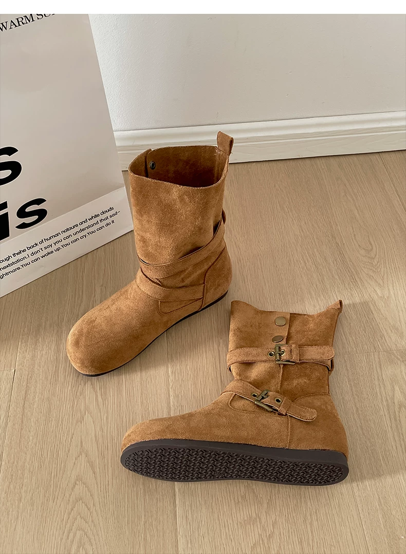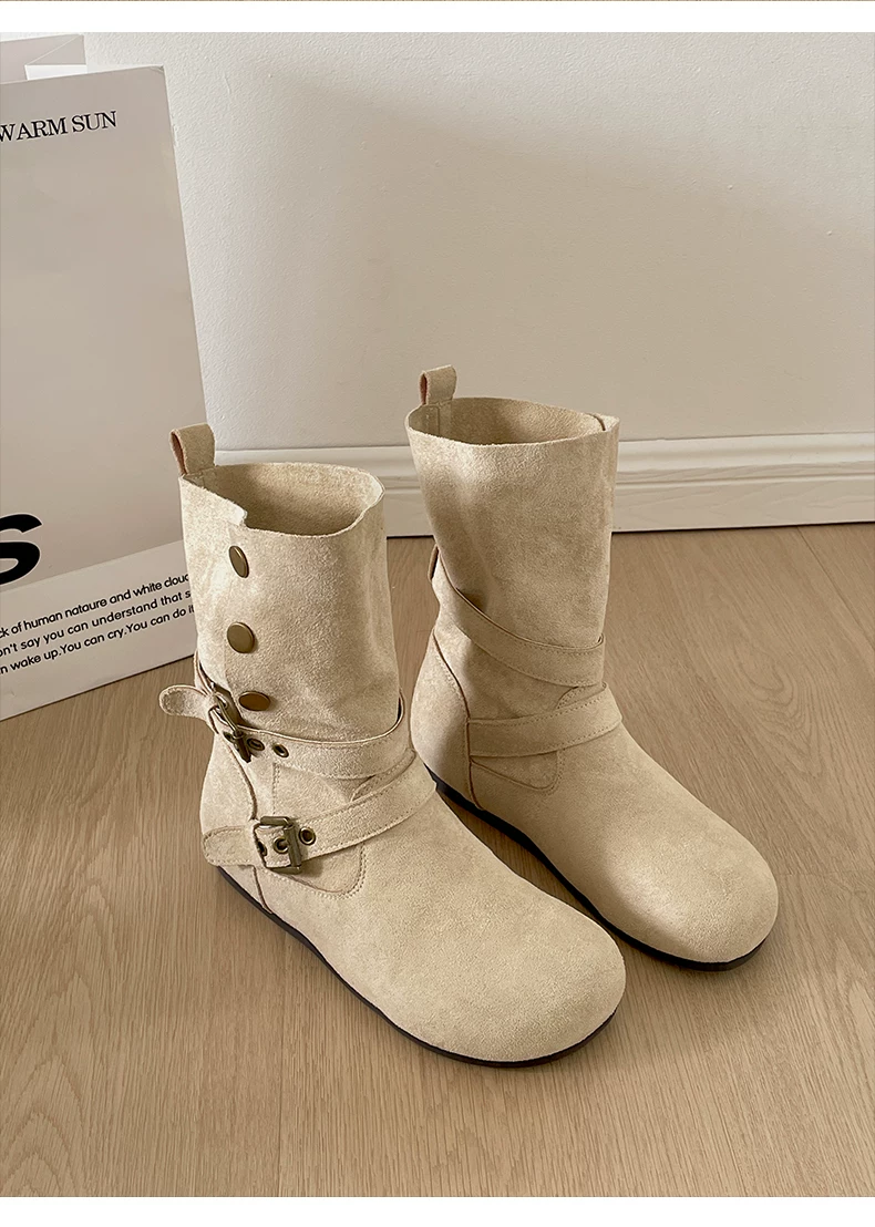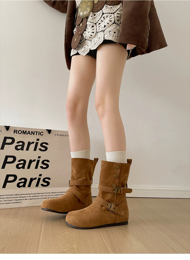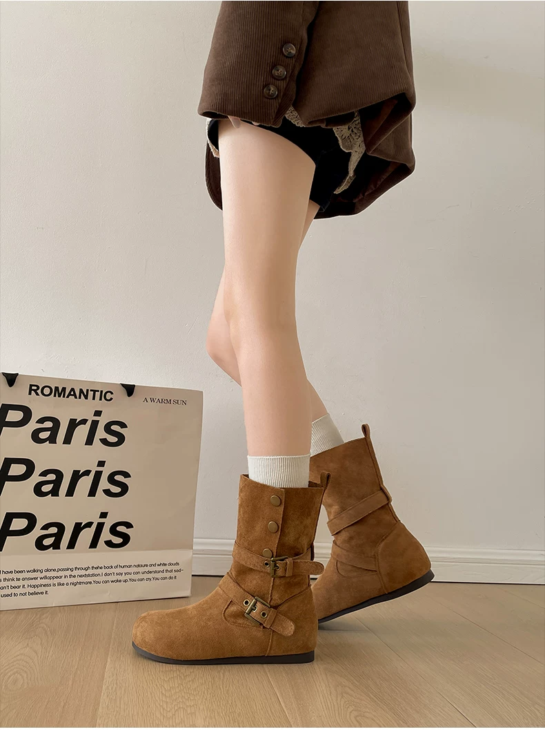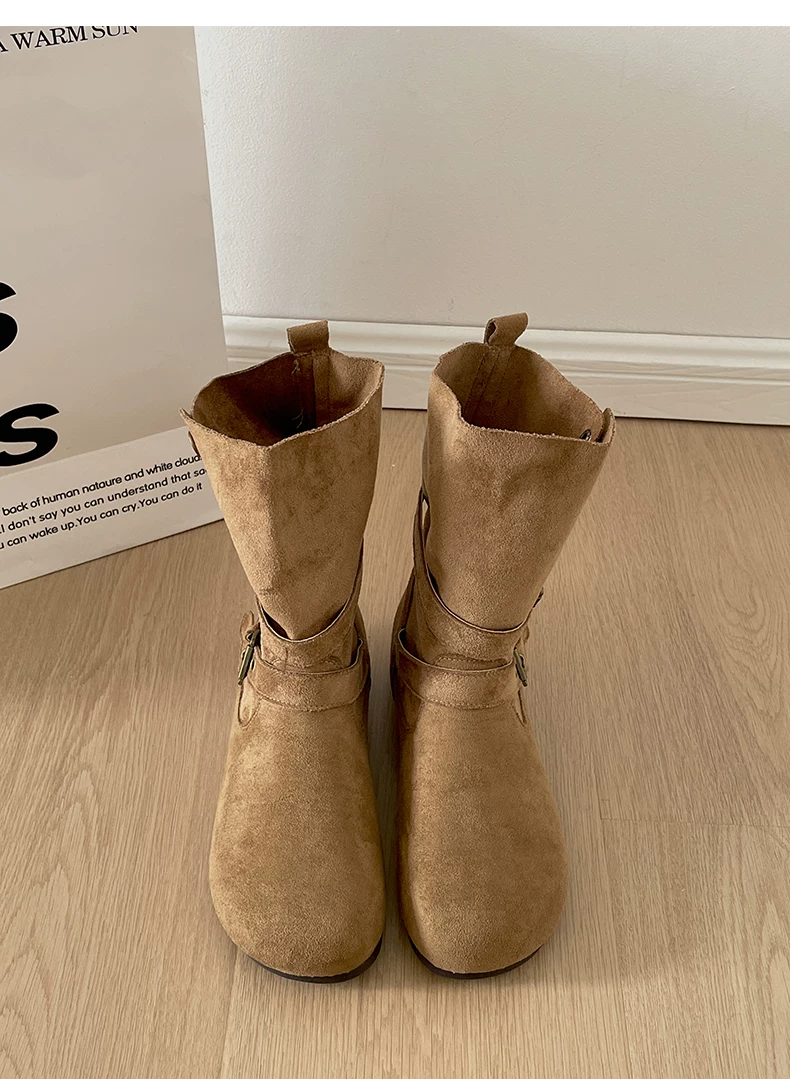 Giày bốt đế dày màu kaki Meilade dành cho nữ, kiểu thu đông 2025, phối cùng chân váy, lót lông cừu, kiểu cổ điển Birkenstock, bốt ngắn.