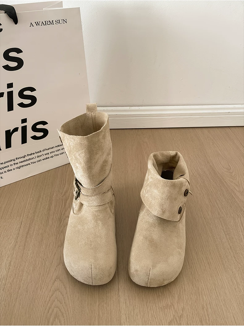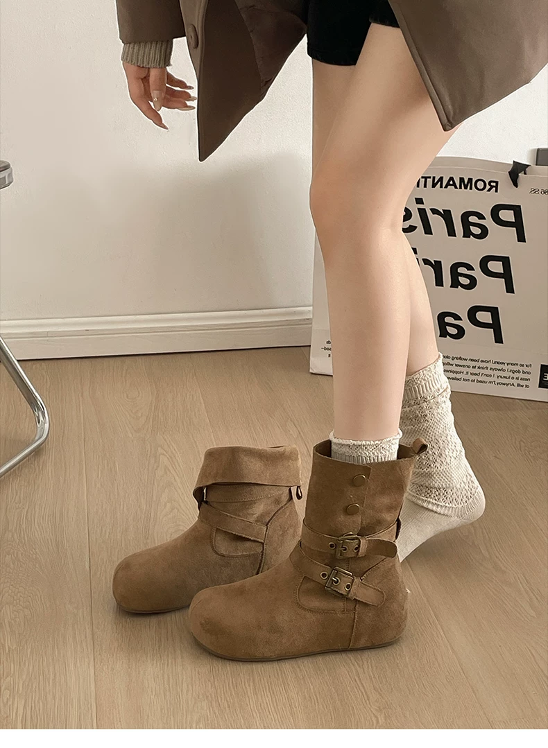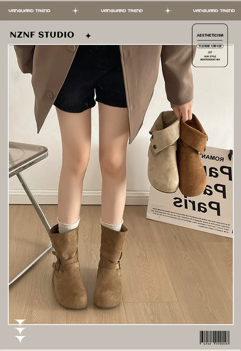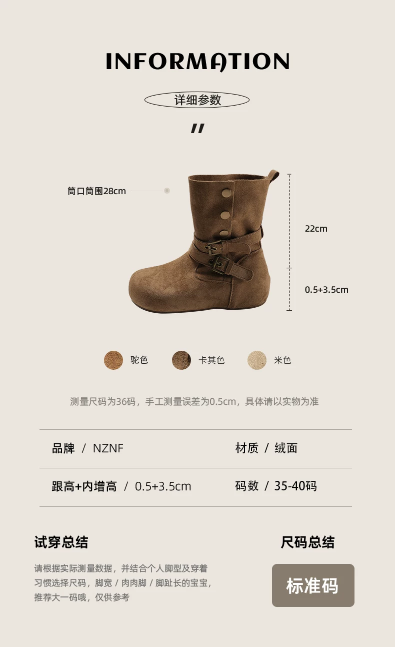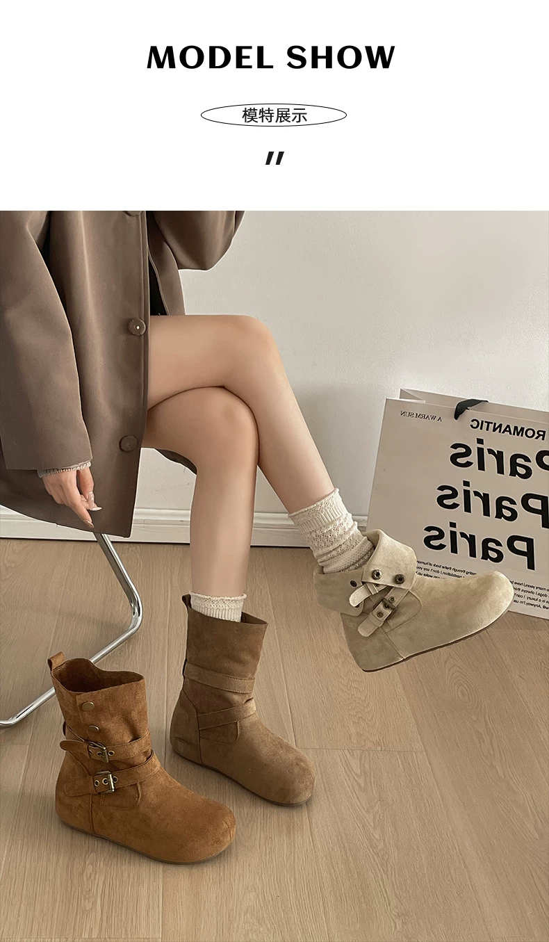 Giày bốt đế dày tăng chiều cao, lót lông cừu kiểu retro dành cho nữ, phong cách thu đông 2025 mới, phối cùng chân váy để trông thon gọn hơn, kiểu bốt ngắn phong cách Birkenstock.