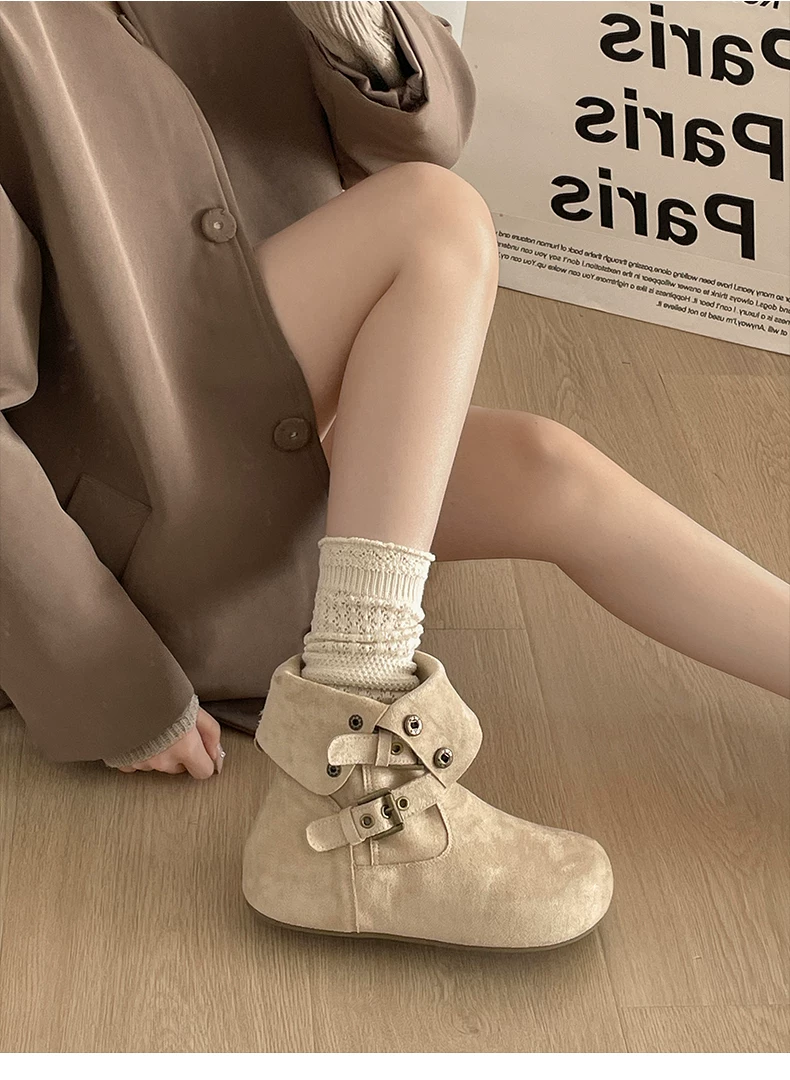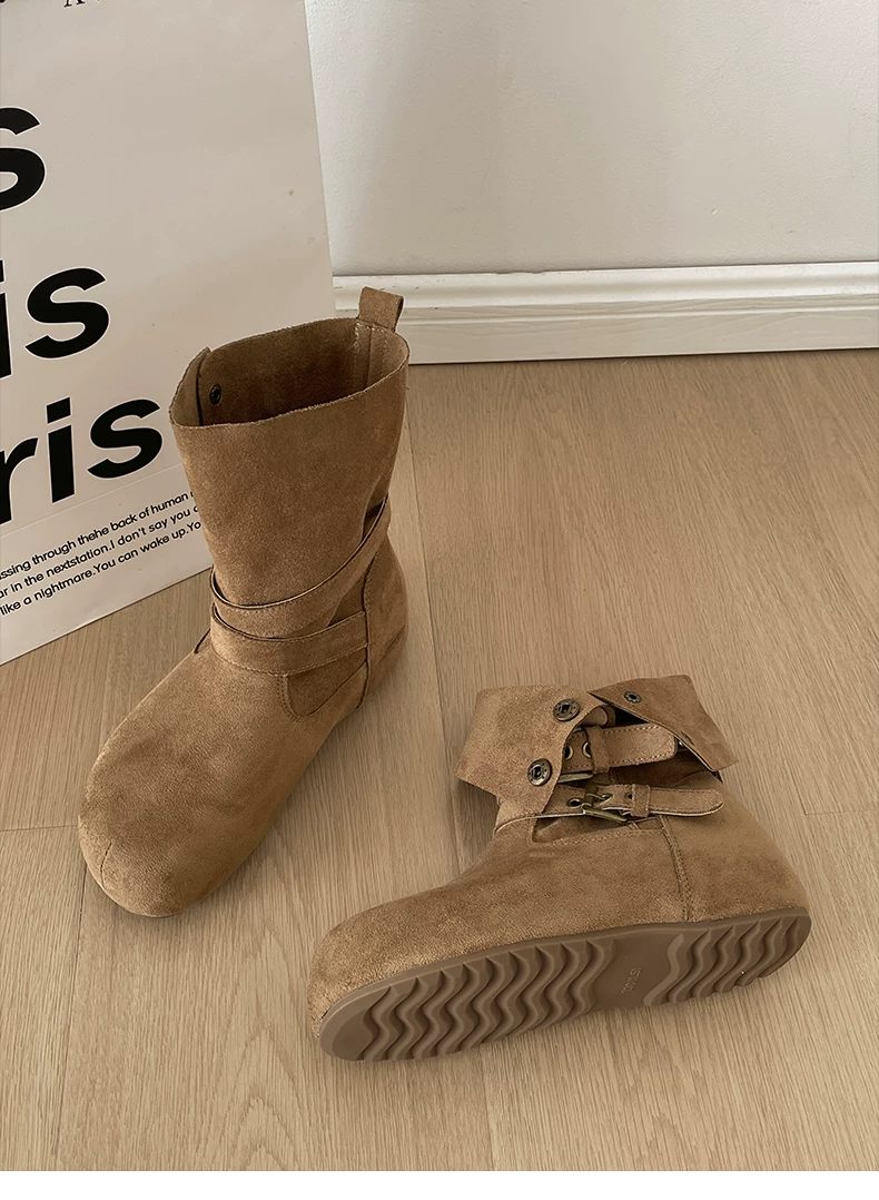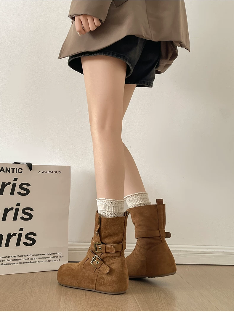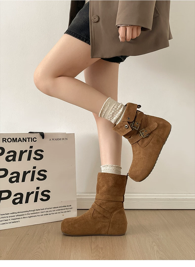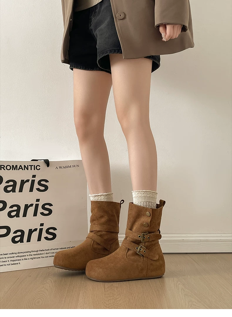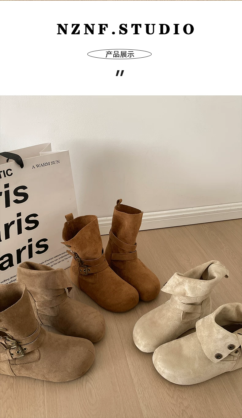 Giày bốt đế dày tăng chiều cao, lót lông cừu kiểu retro dành cho nữ, phong cách thu đông 2025 mới, phối cùng chân váy để trông thon gọn hơn, kiểu bốt ngắn phong cách Birkenstock.