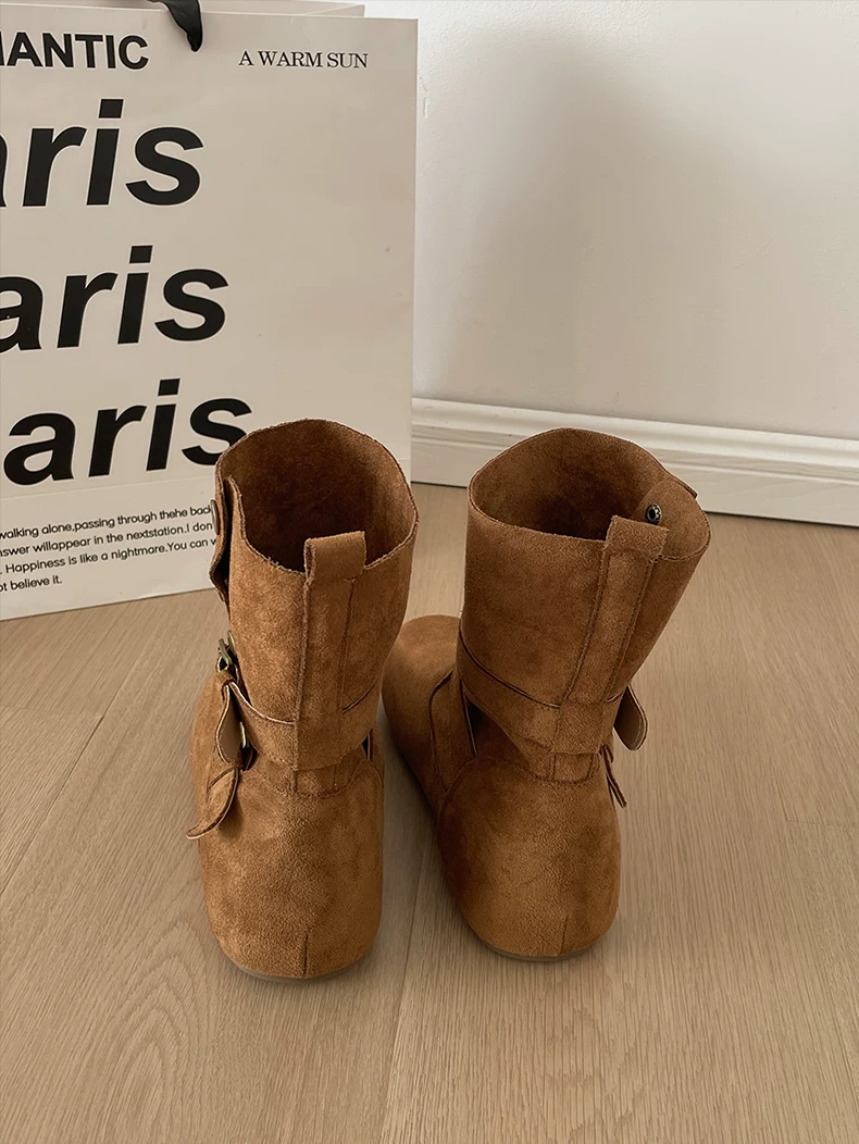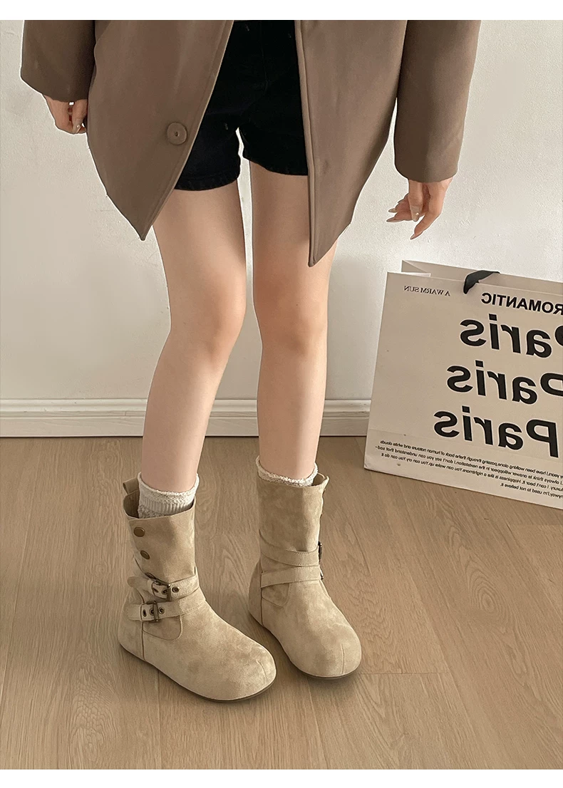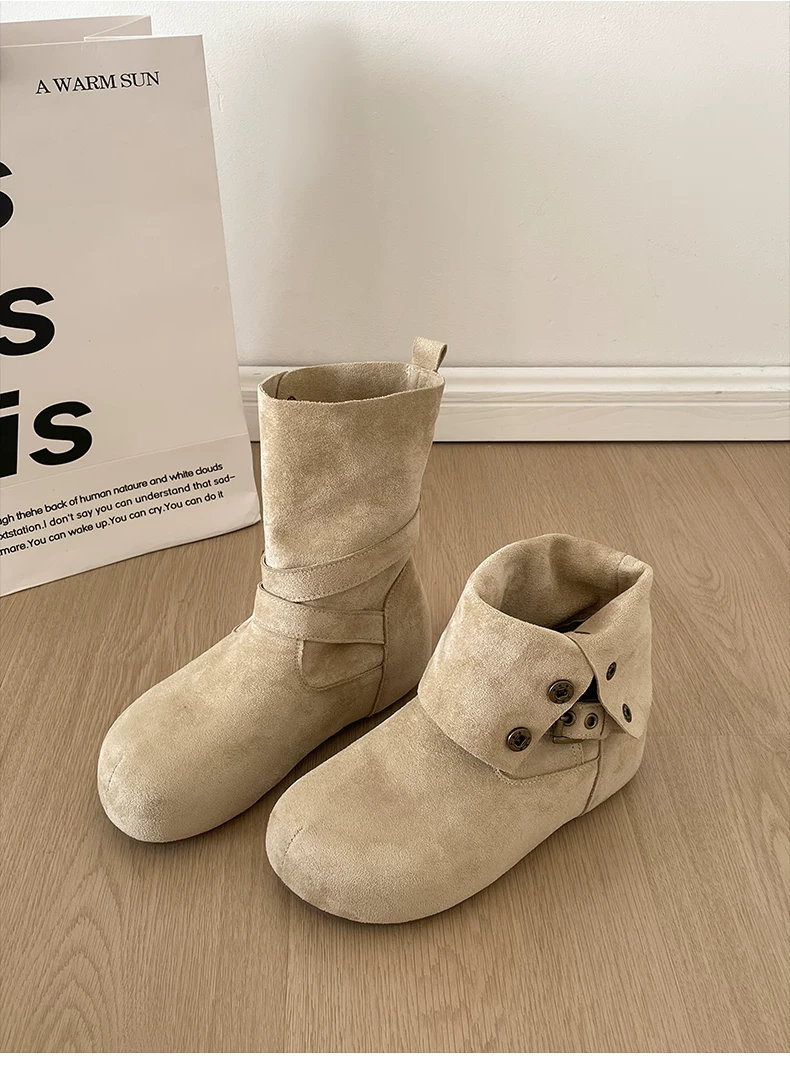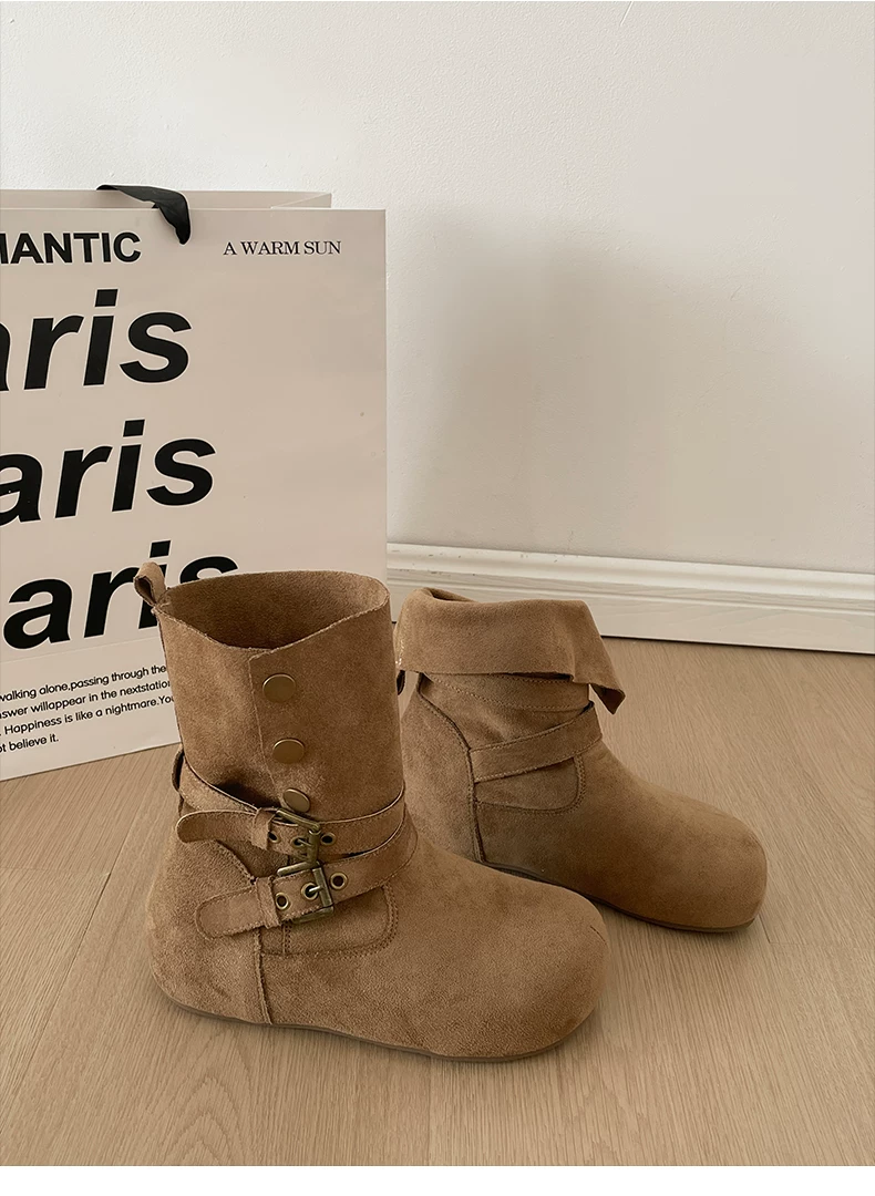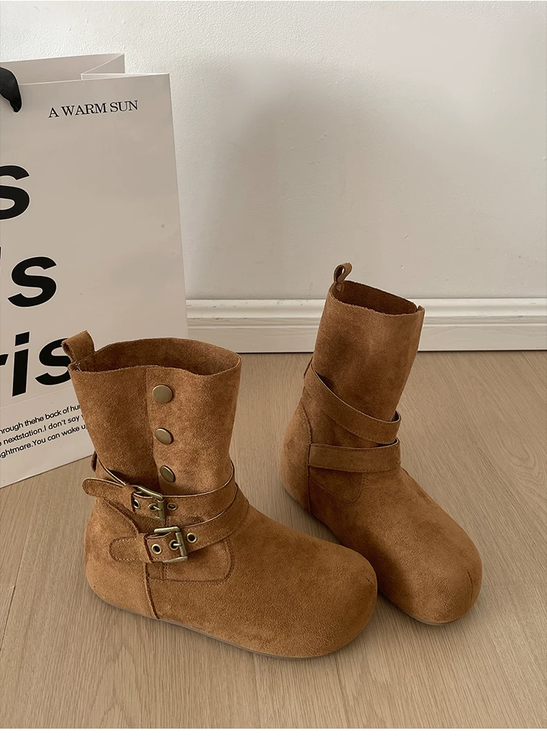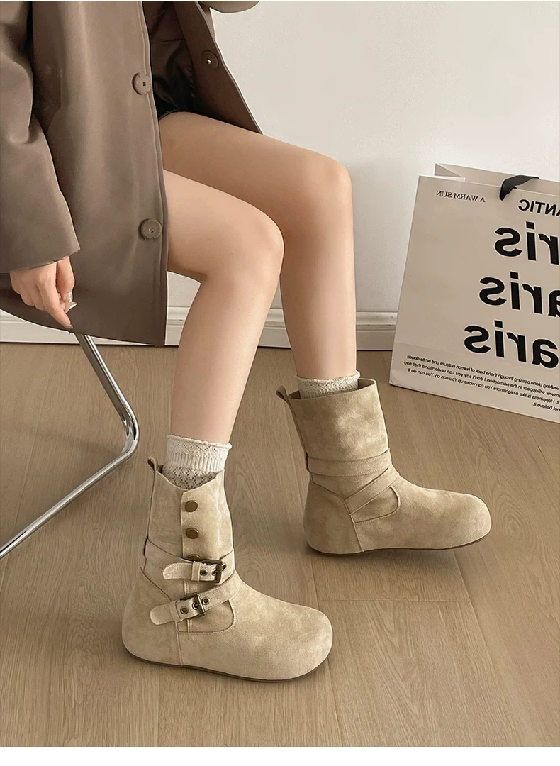 Giày bốt đế dày tăng chiều cao, lót lông cừu kiểu retro dành cho nữ, phong cách thu đông 2025 mới, phối cùng chân váy để trông thon gọn hơn, kiểu bốt ngắn phong cách Birkenstock.