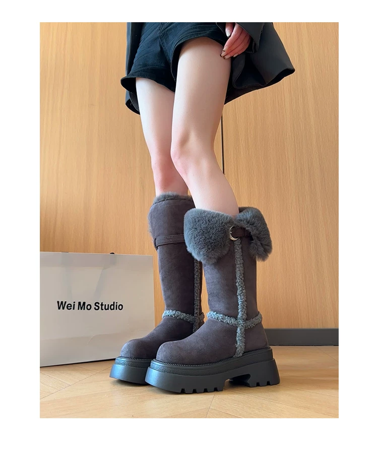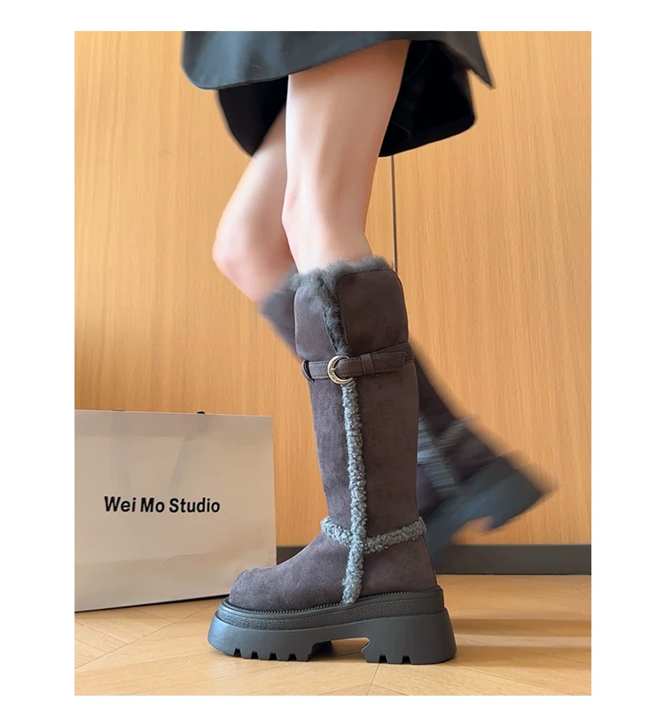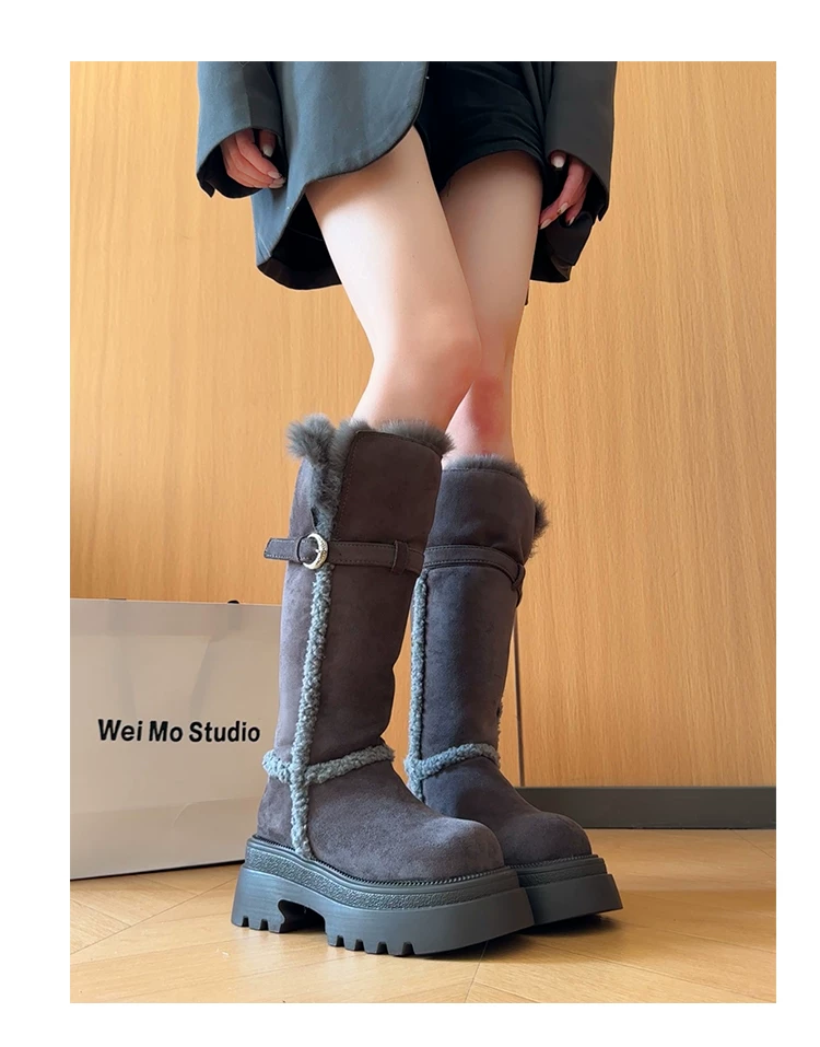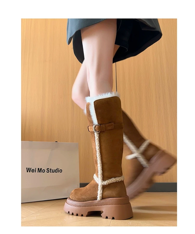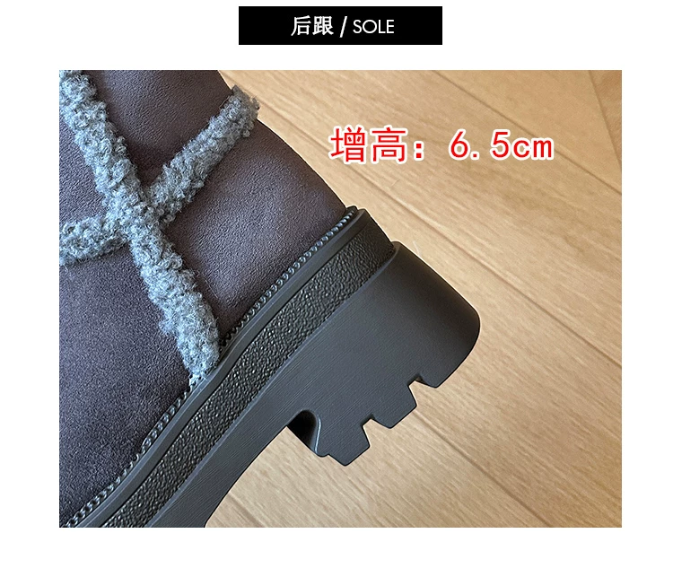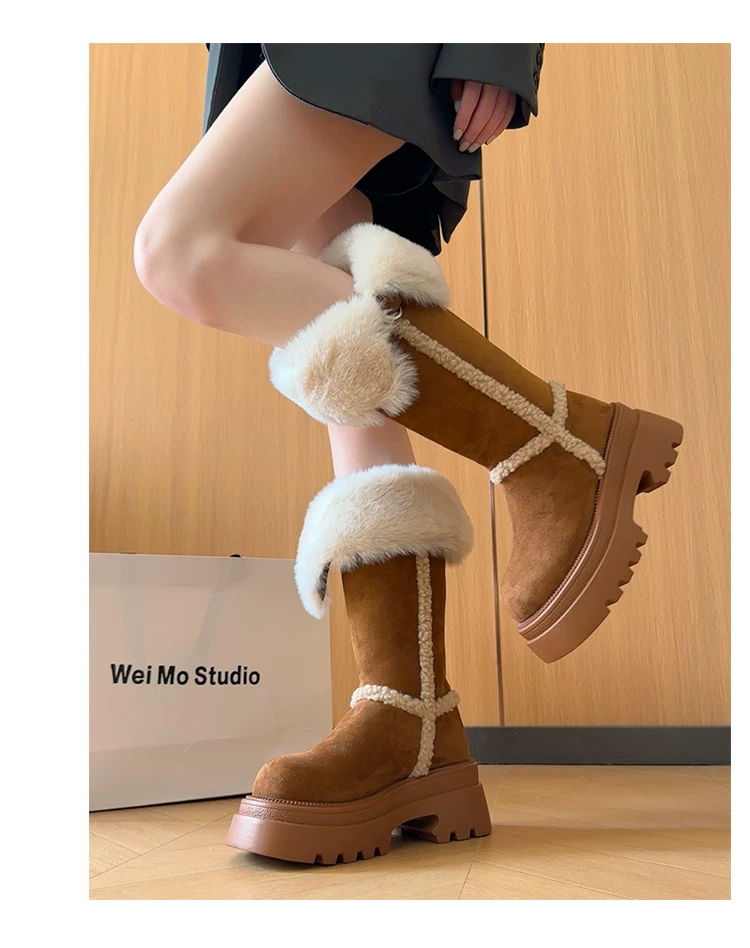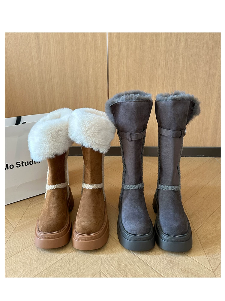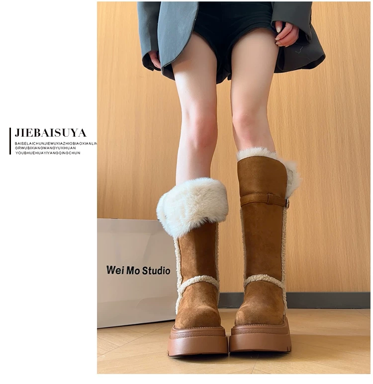 Giày bốt đi tuyết dài có lót lông cừu, đế dày, chống trơn trượt, gót dày, dành cho nữ, kiểu dáng mùa đông mới 2025, tăng chiều cao, giày cotton ấm áp.