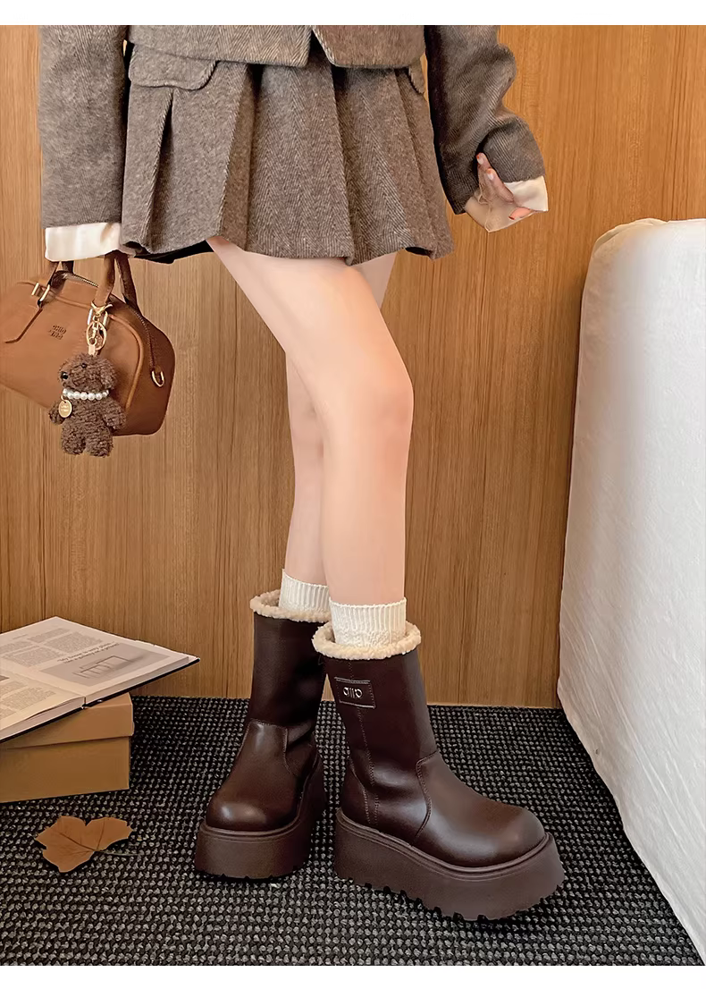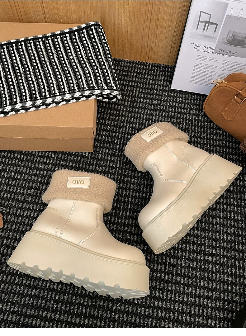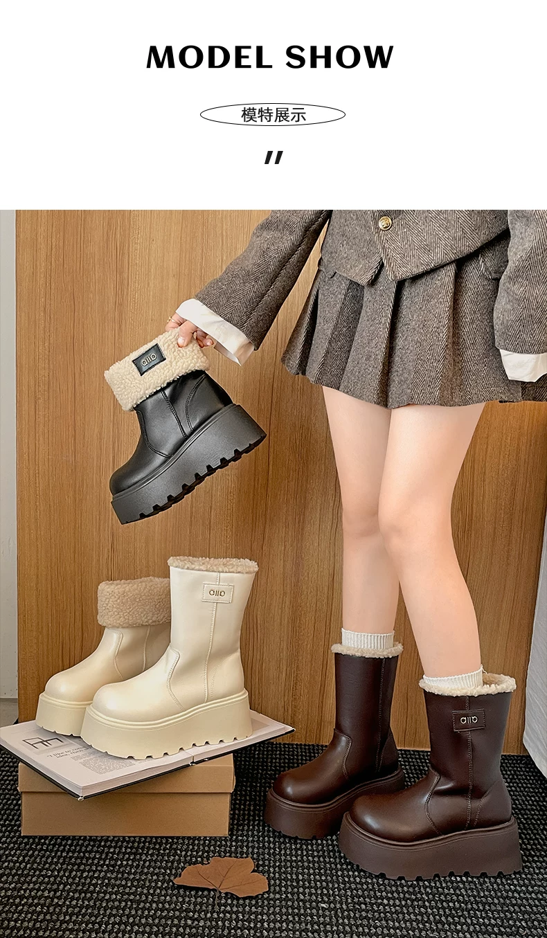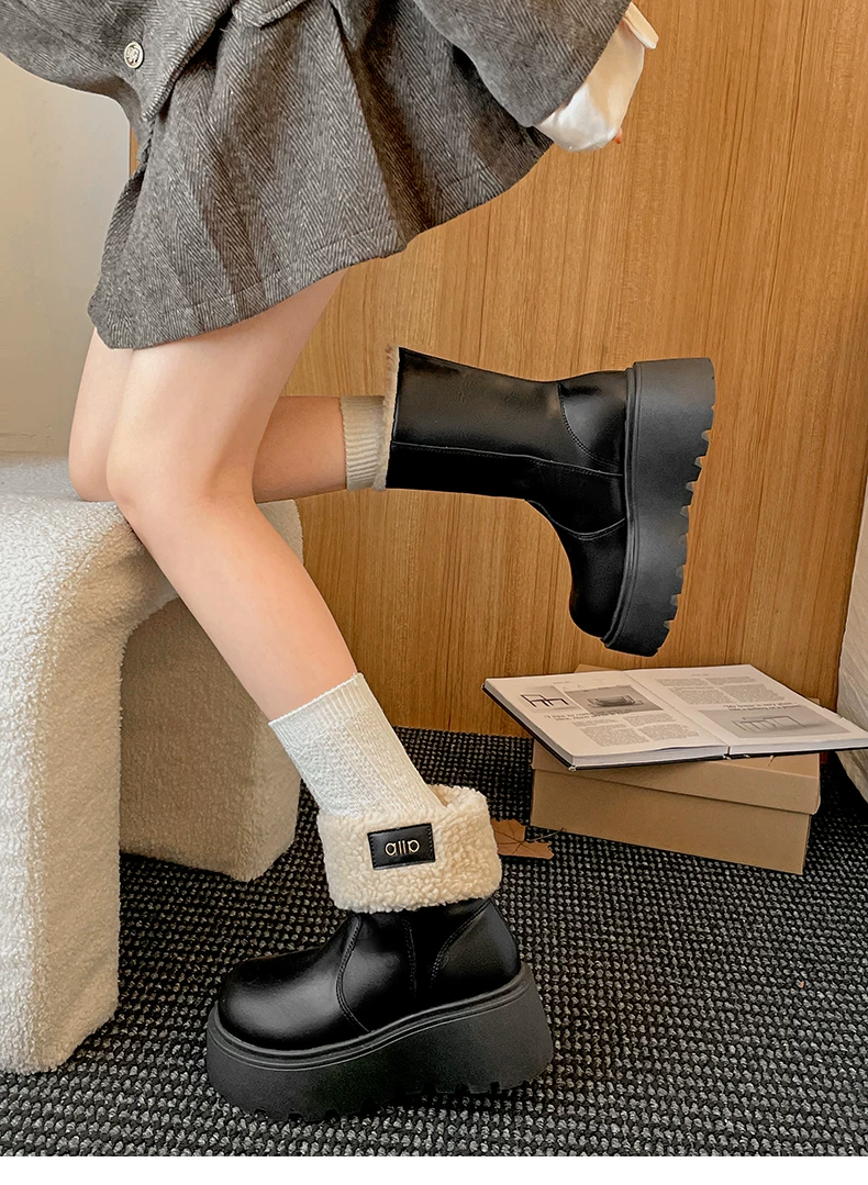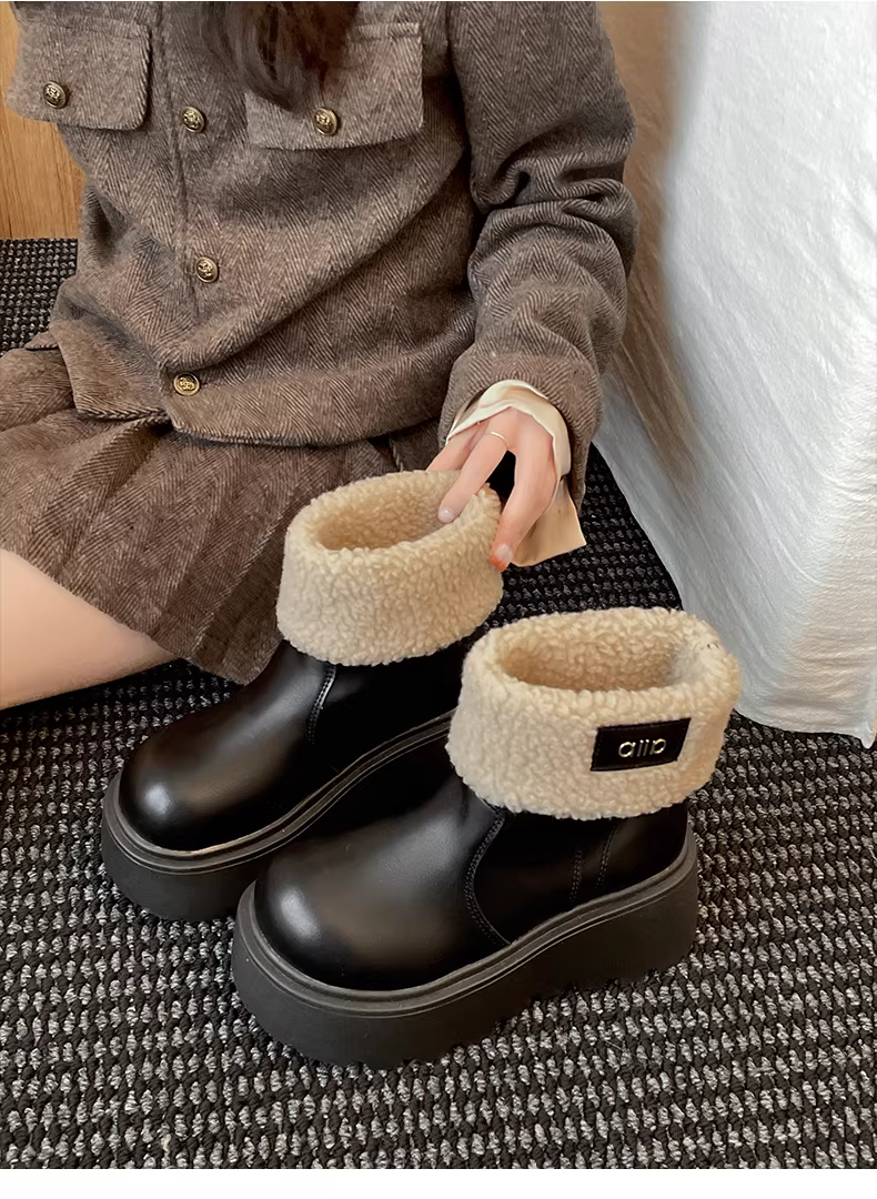 Giày bốt đi tuyết đế dày màu đen dành cho nữ, kiểu dáng mùa đông mới 2025, lót lông cừu, dày dặn, tăng chiều cao, kiểu Birkenstock, chất liệu cotton.