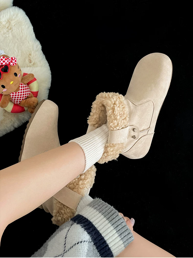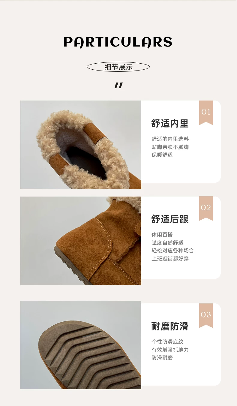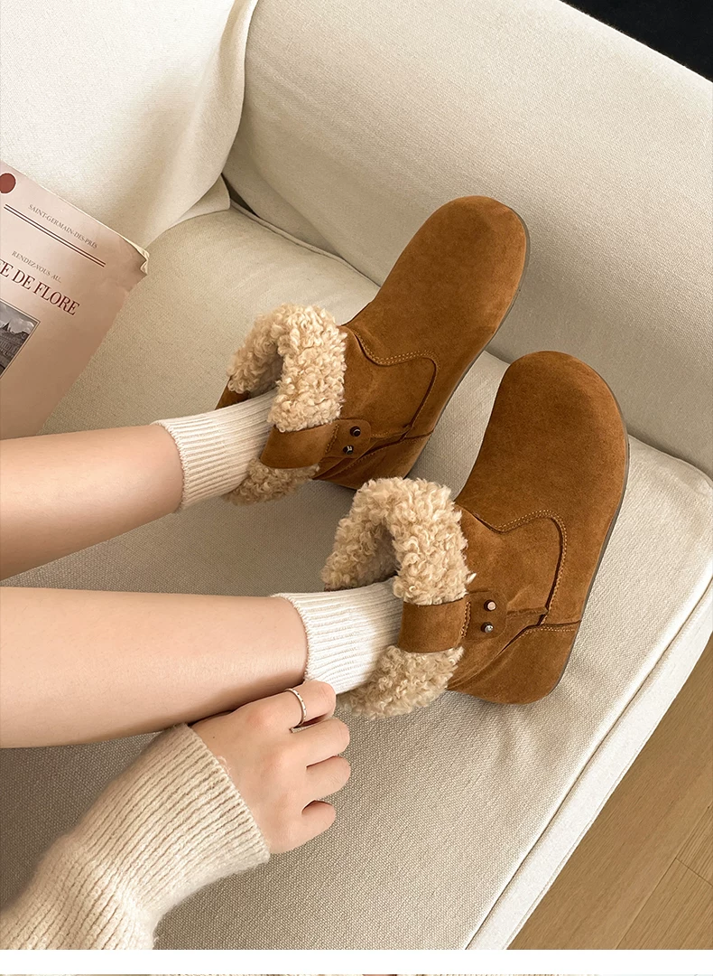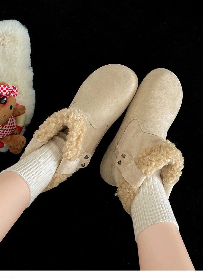 - Giày bốt đi tuyết đế dày màu nâu cổ điển lót lông cừu dành cho nữ, trang phục mùa đông mới 2025, giày cotton kiểu Birkenstock ấm áp và chống trơn trượt.