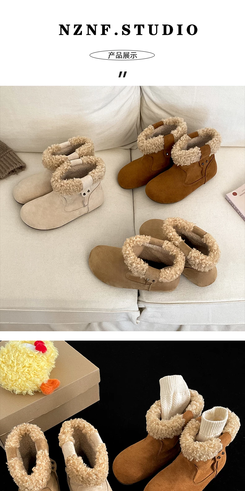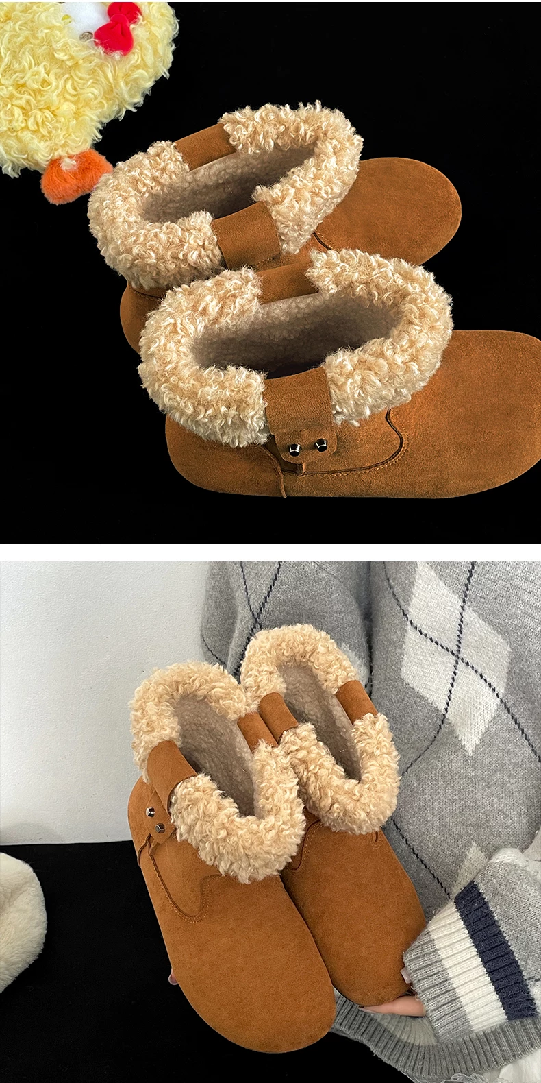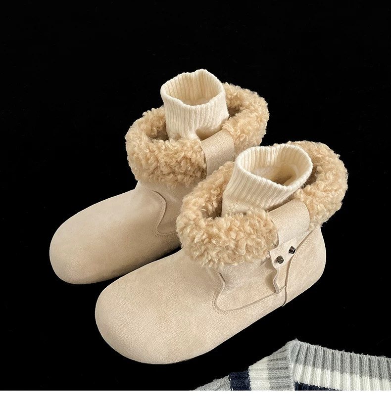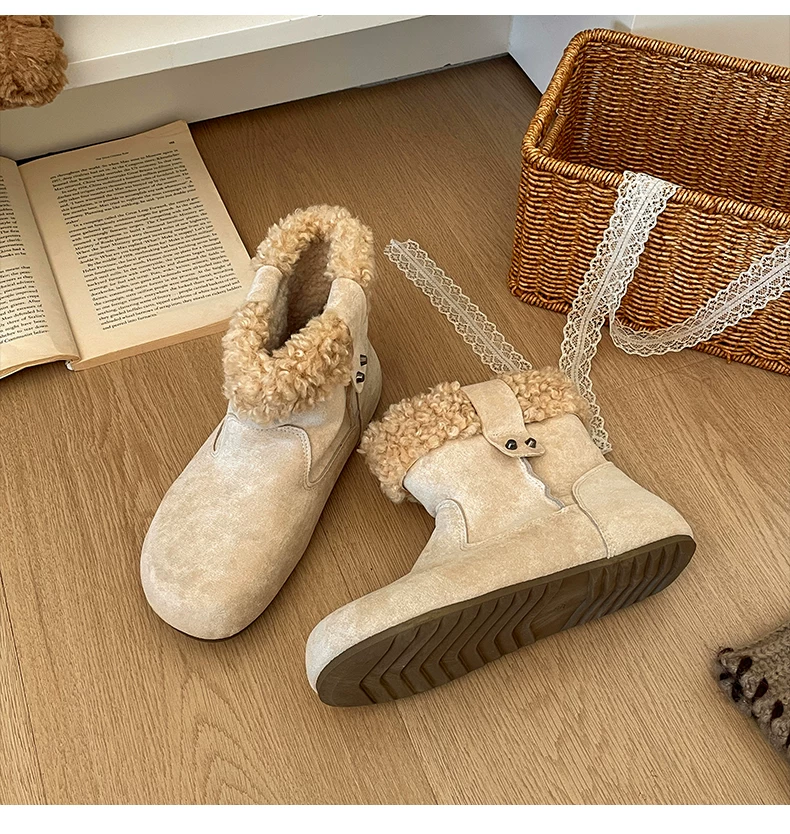 - Giày bốt đi tuyết đế dày màu nâu cổ điển lót lông cừu dành cho nữ, trang phục mùa đông mới 2025, giày cotton kiểu Birkenstock ấm áp và chống trơn trượt.