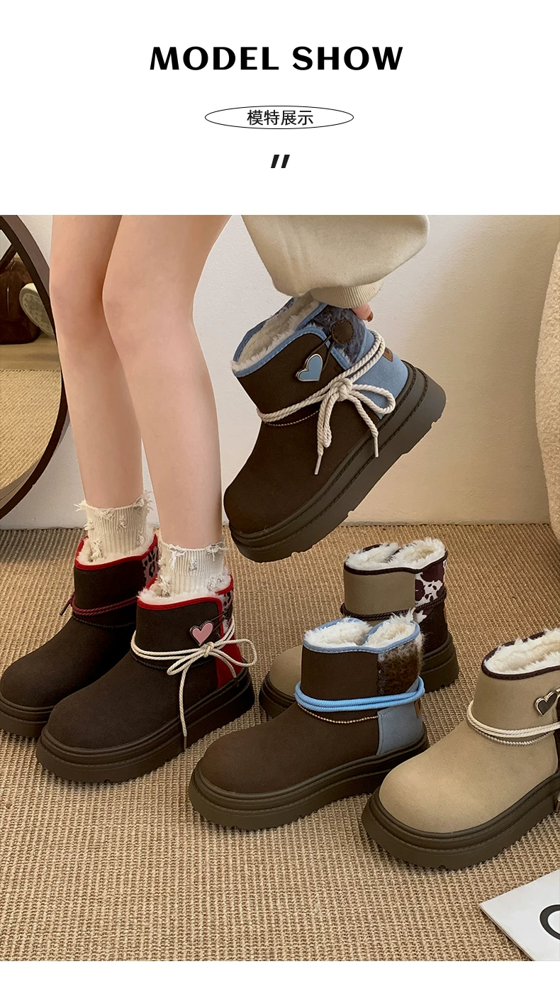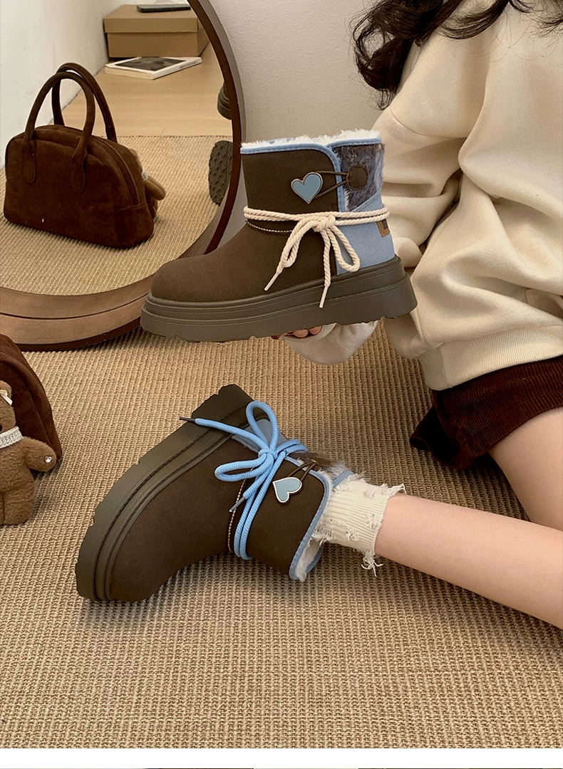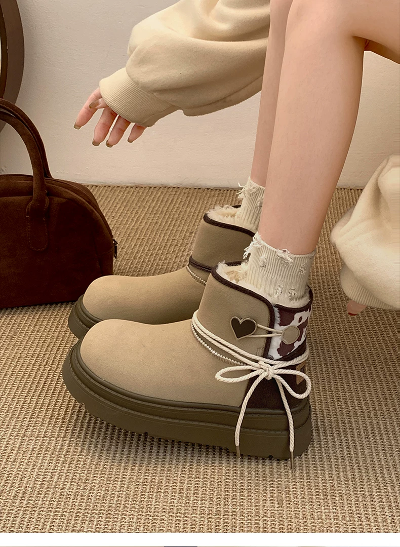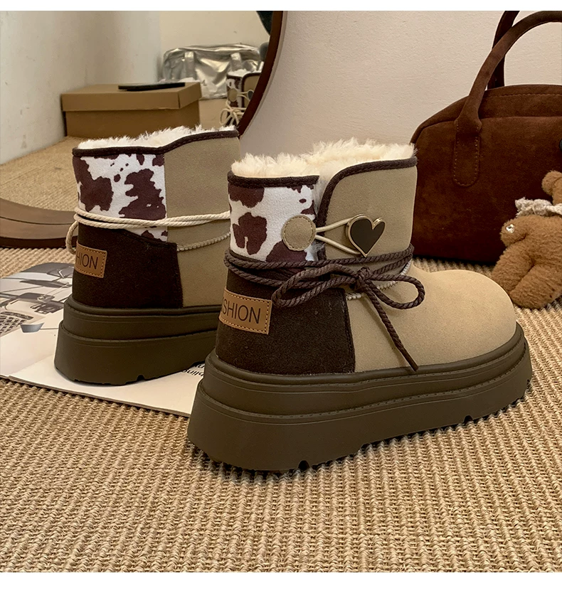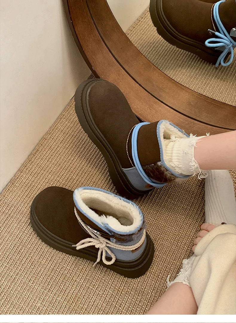 - Giày bốt đi tuyết đế dày màu nâu Nam Trung Quốc dành cho nữ 2025 Giày cotton đi tuyết ấm áp lót lông cừu mùa đông mới.