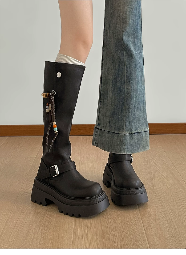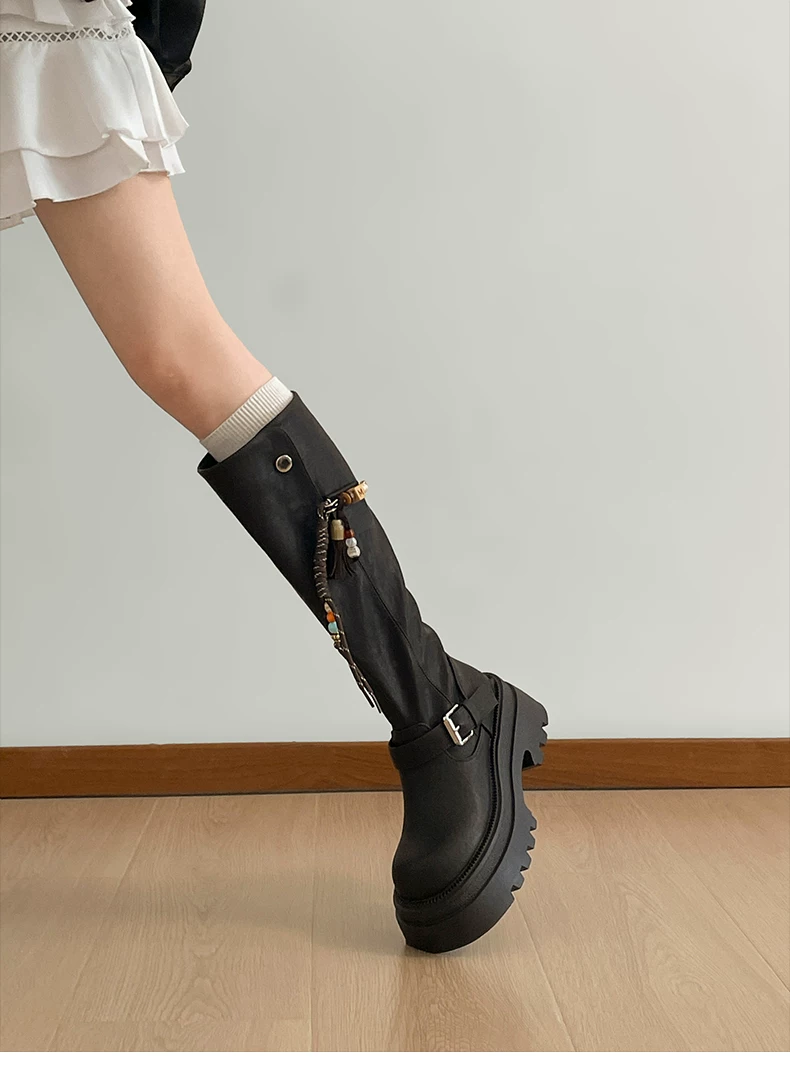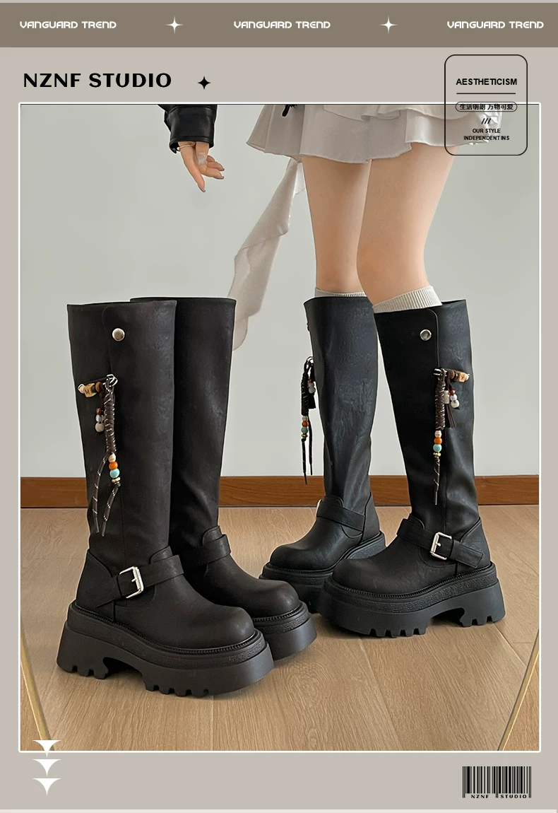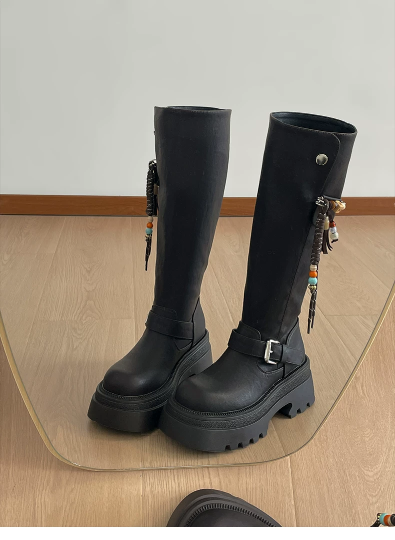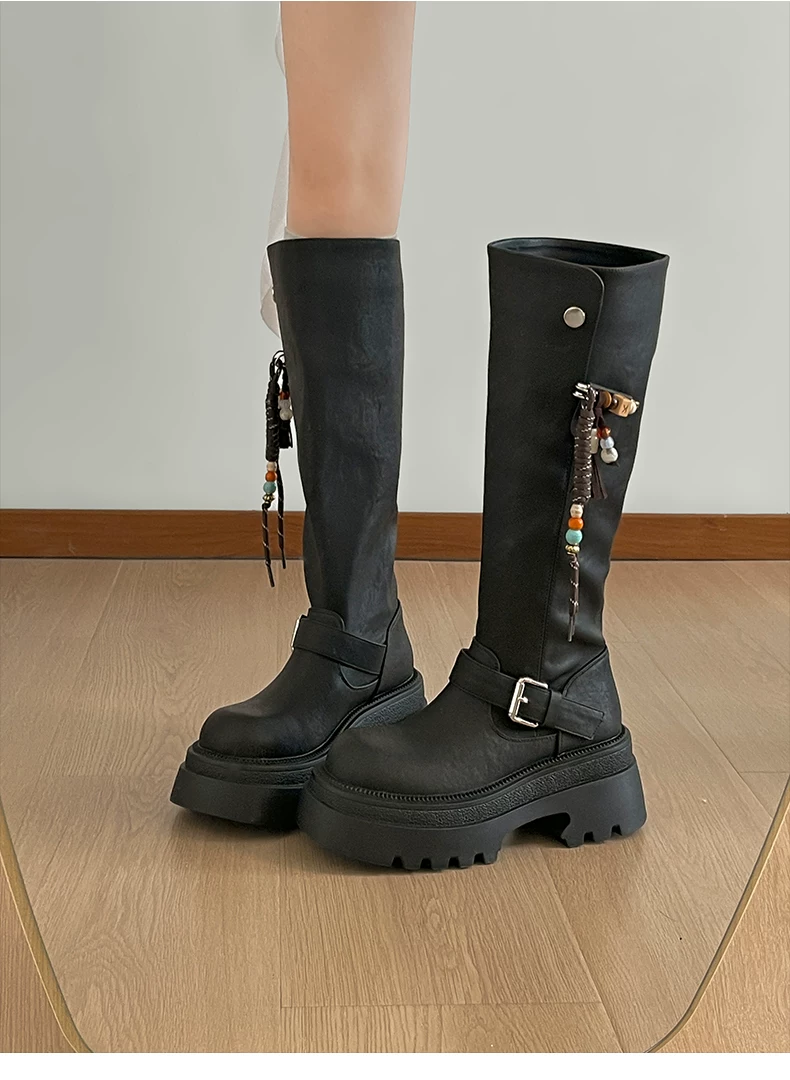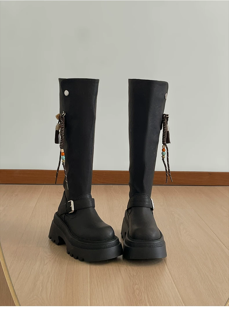 Giày bốt nữ cao đến đầu gối đế xuồng chunky màu đen, kiểu dáng mới thu đông 2025, tôn dáng, tăng chiều cao, phong cách retro, kiểu dáng đi xe.