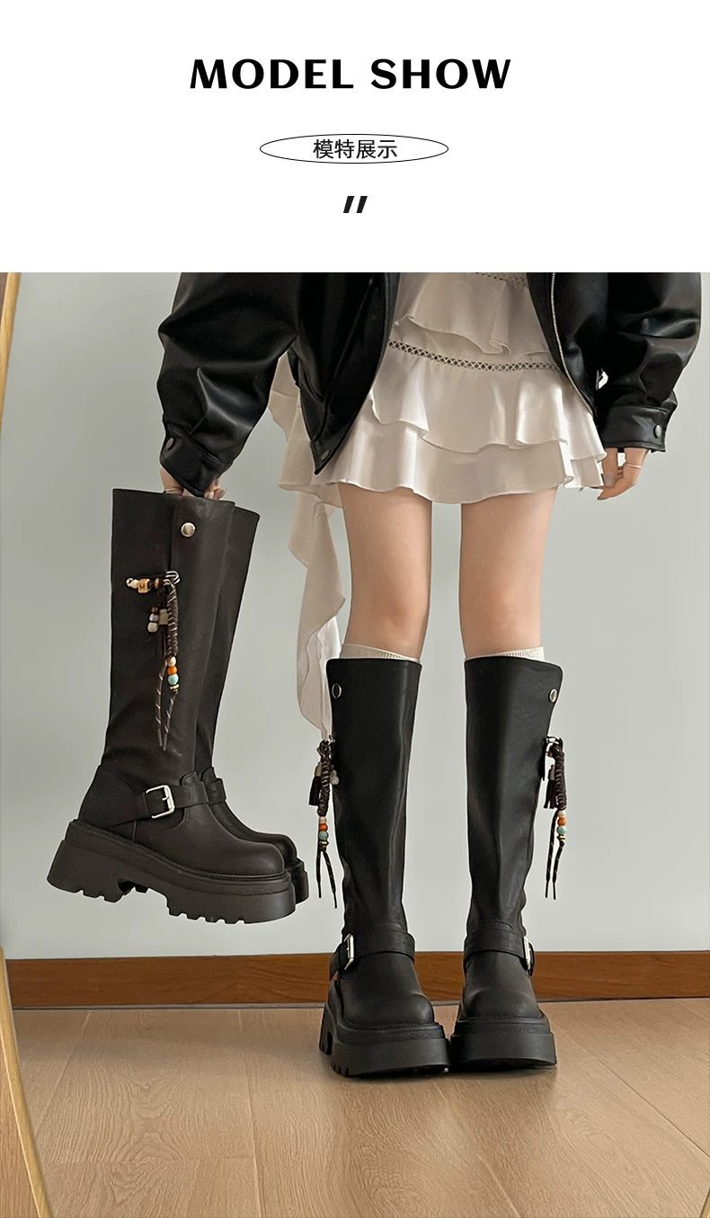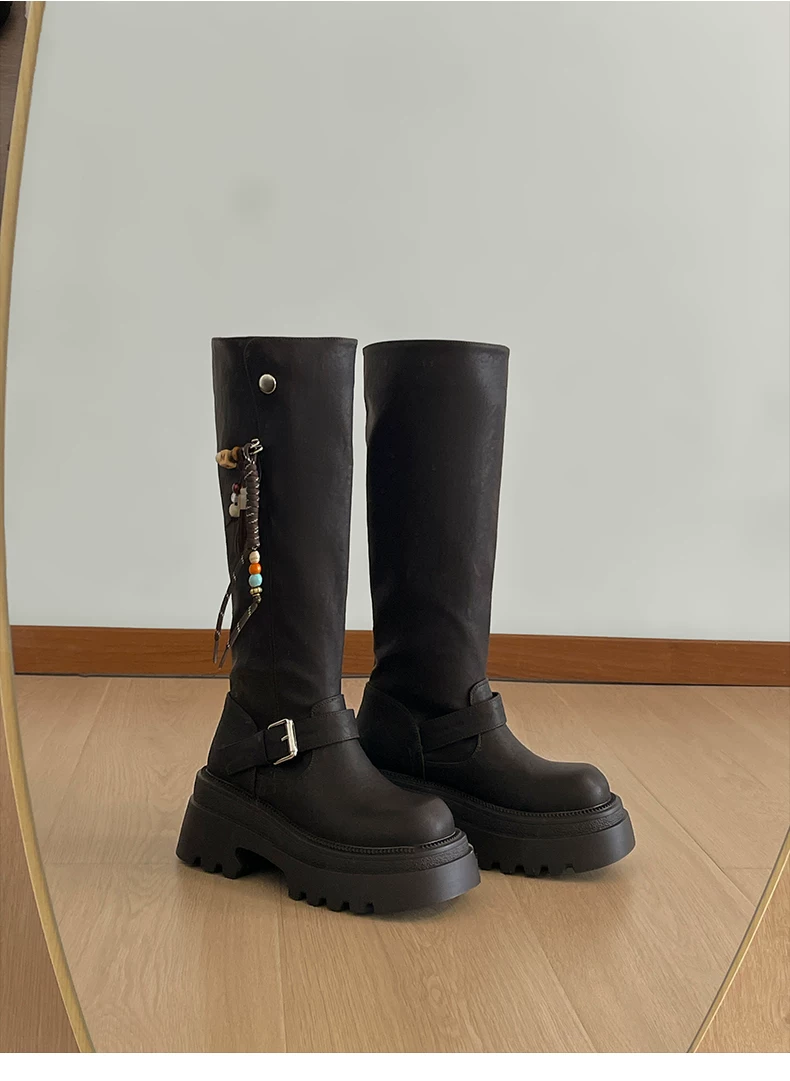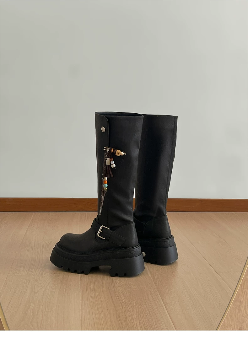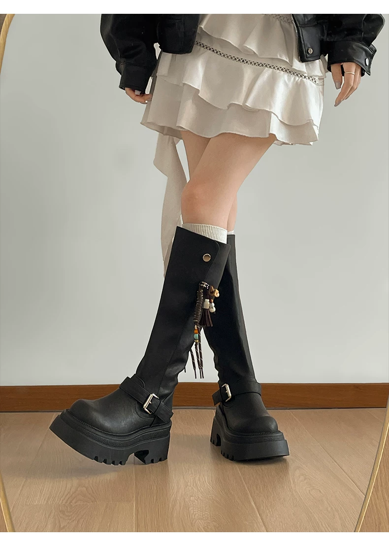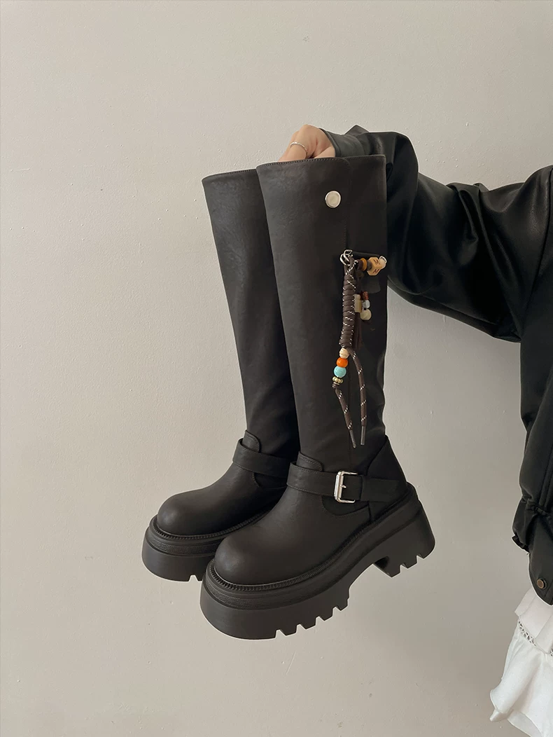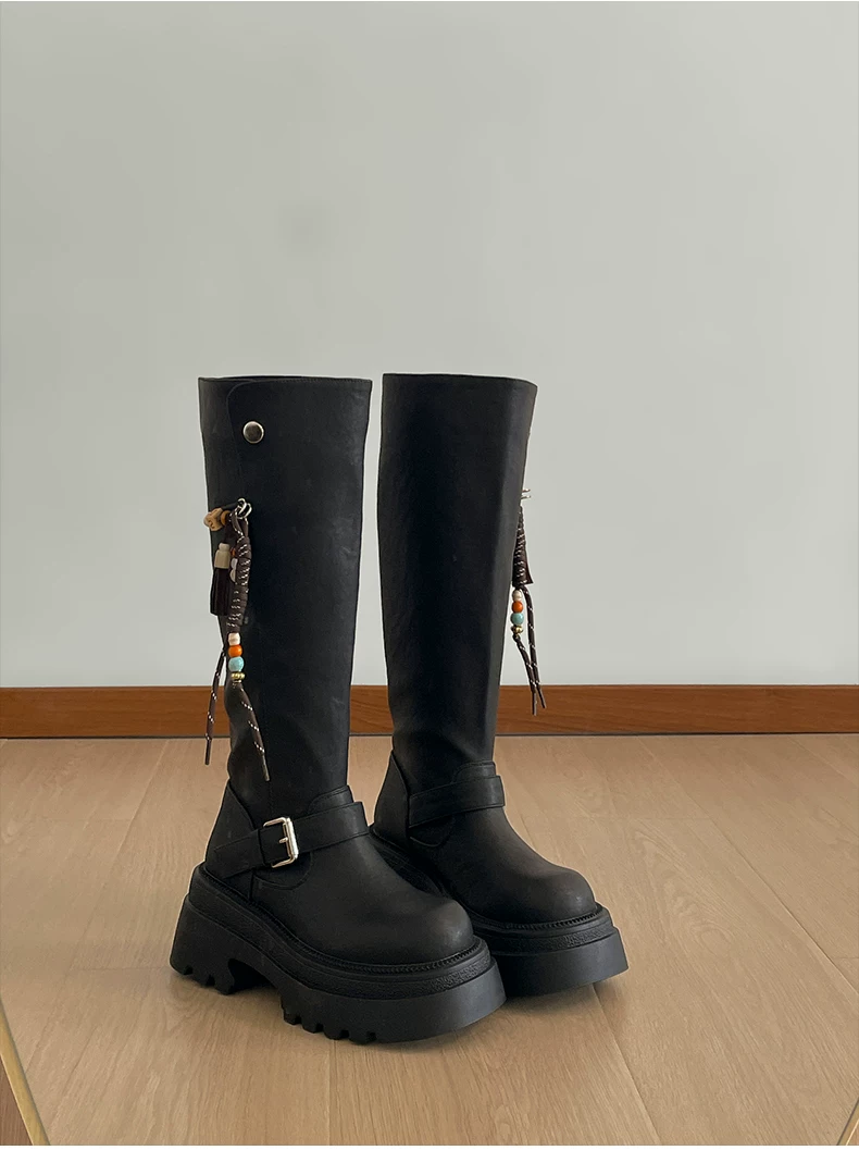 Giày bốt nữ cao đến đầu gối đế xuồng chunky màu đen, kiểu dáng mới thu đông 2025, tôn dáng, tăng chiều cao, phong cách retro, kiểu dáng đi xe.
