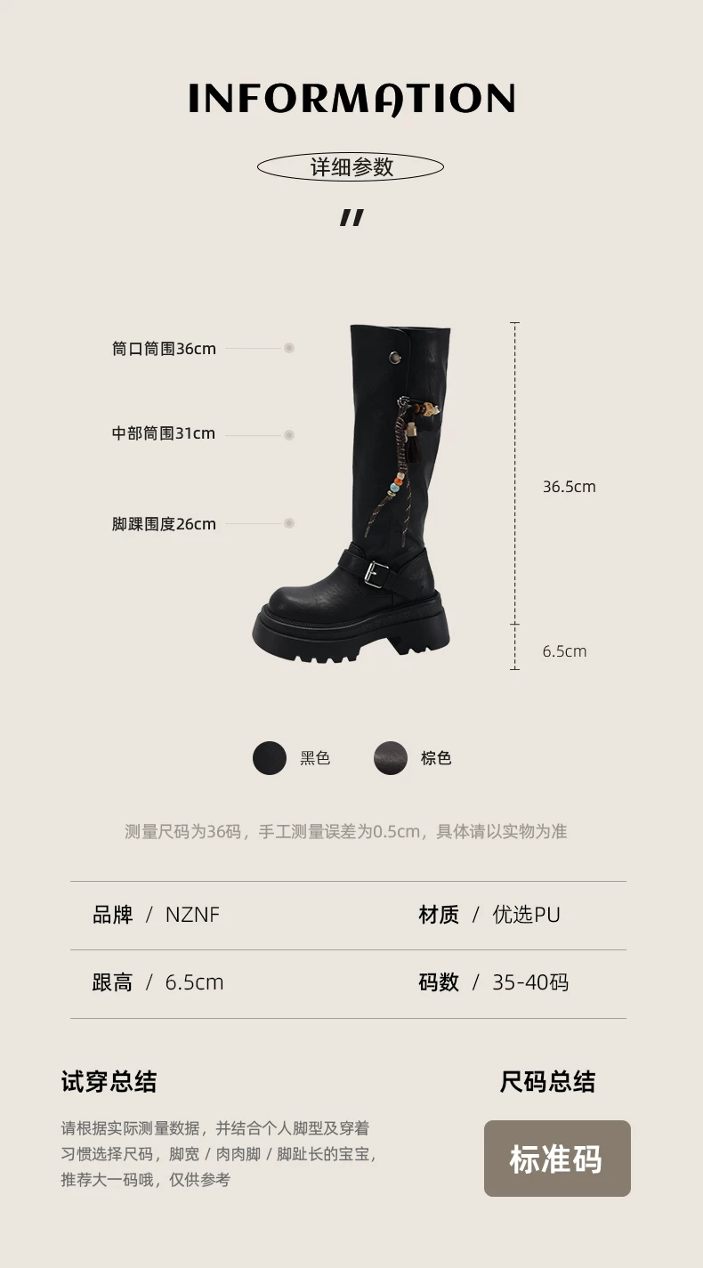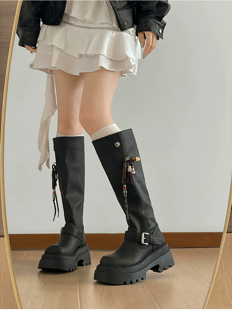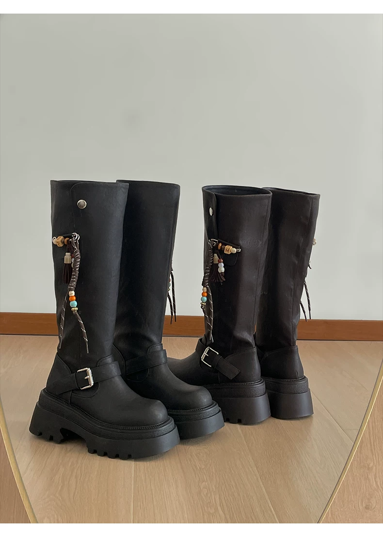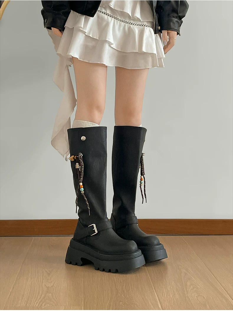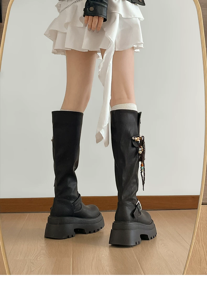 Giày bốt nữ cao đến đầu gối đế xuồng chunky màu đen, kiểu dáng mới thu đông 2025, tôn dáng, tăng chiều cao, phong cách retro, kiểu dáng đi xe.