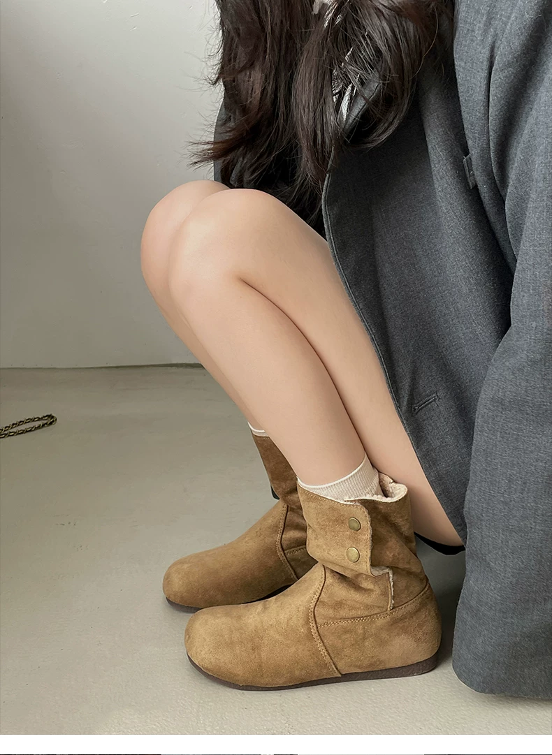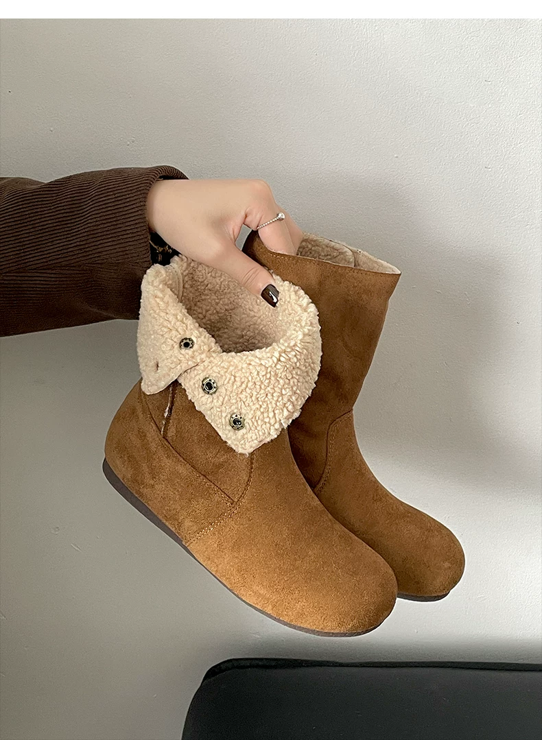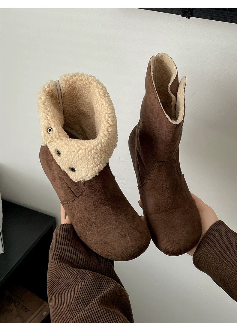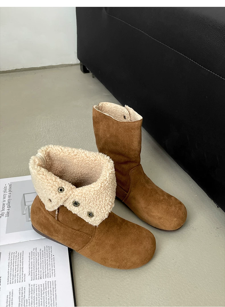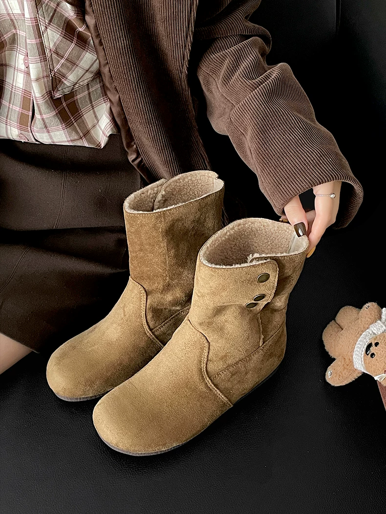 - Giày bốt nữ đế dày lót lông cừu kiểu retro Maillard màu kaki, mùa đông 2025 mới, ấm áp và dày dặn, kiểu Birkenstock cổ ngắn