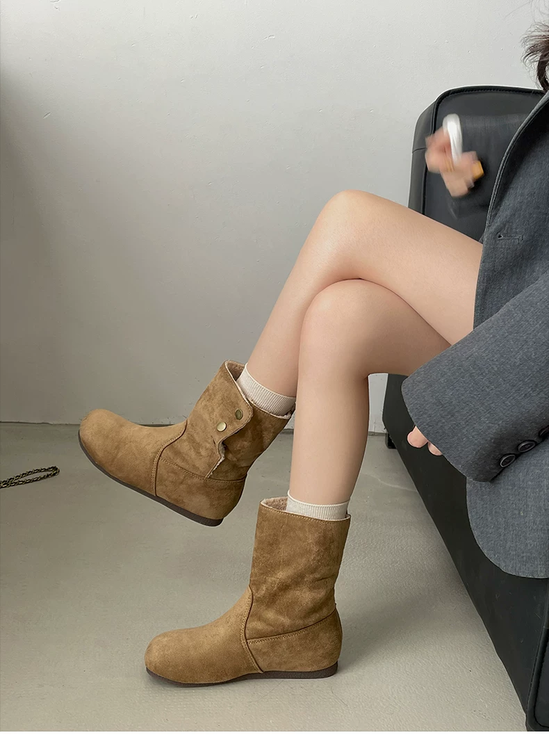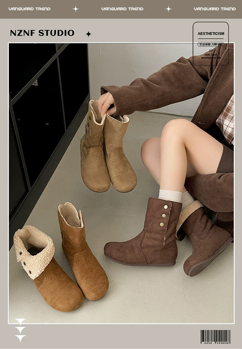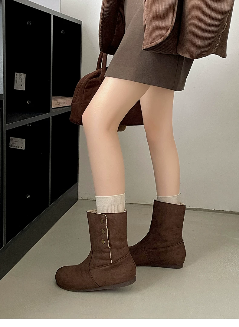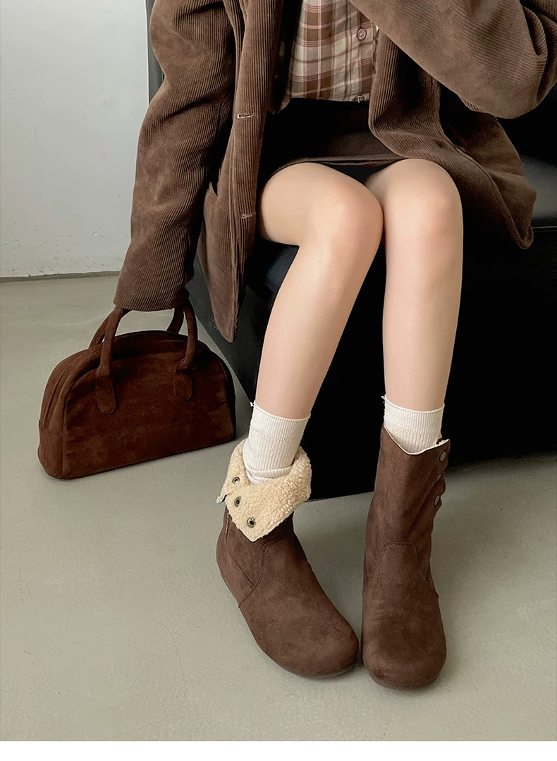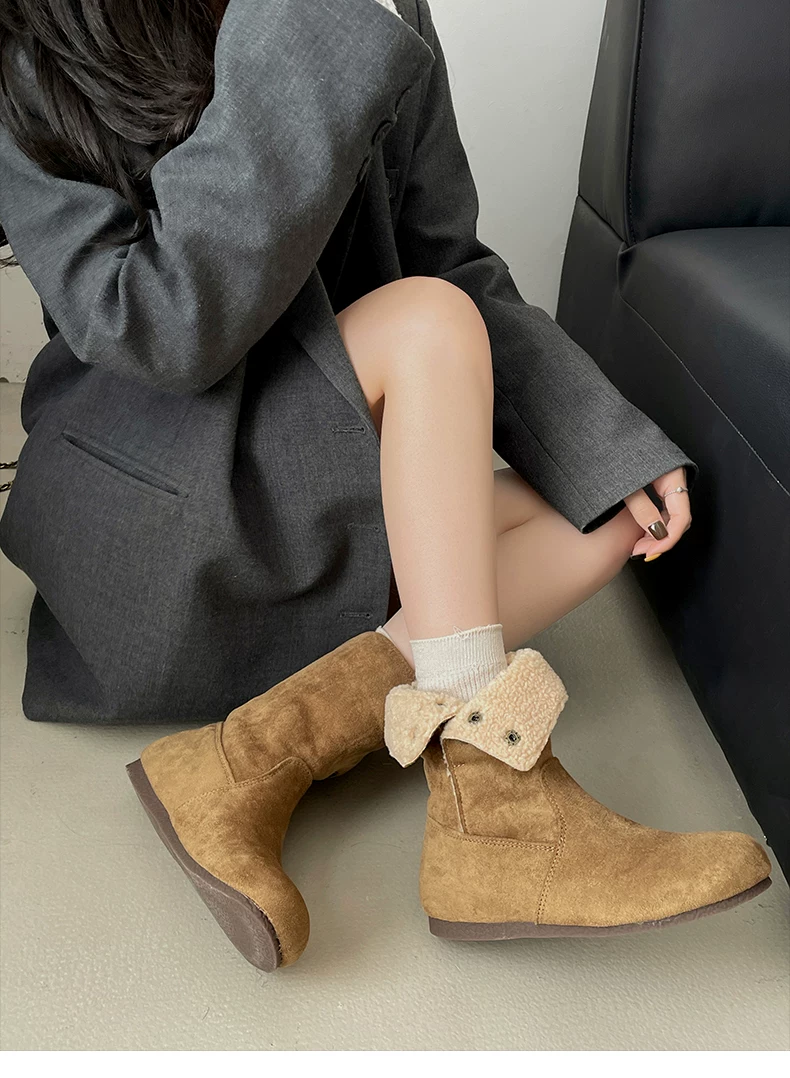 - Giày bốt nữ đế dày lót lông cừu kiểu retro Maillard màu kaki, mùa đông 2025 mới, ấm áp và dày dặn, kiểu Birkenstock cổ ngắn