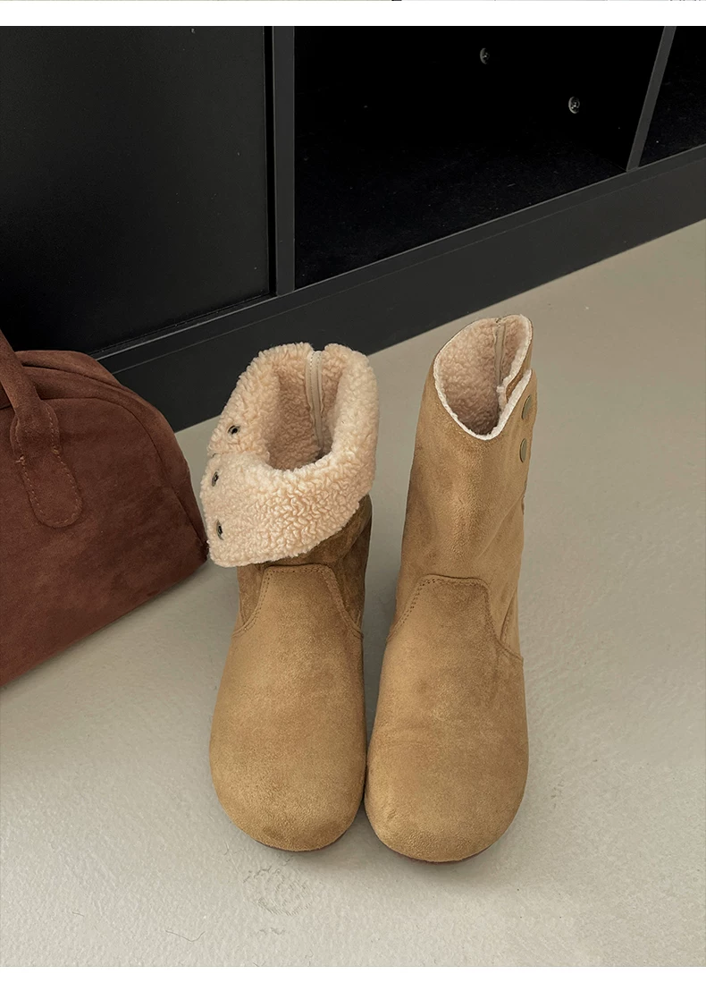 Giày bốt nữ đế dày lót lông cừu kiểu retro Maillard màu kaki, mùa đông 2025 mới, ấm áp và dày dặn, kiểu Birkenstock cổ ngắn