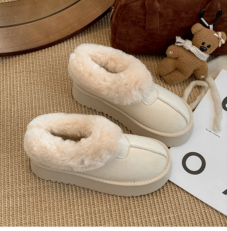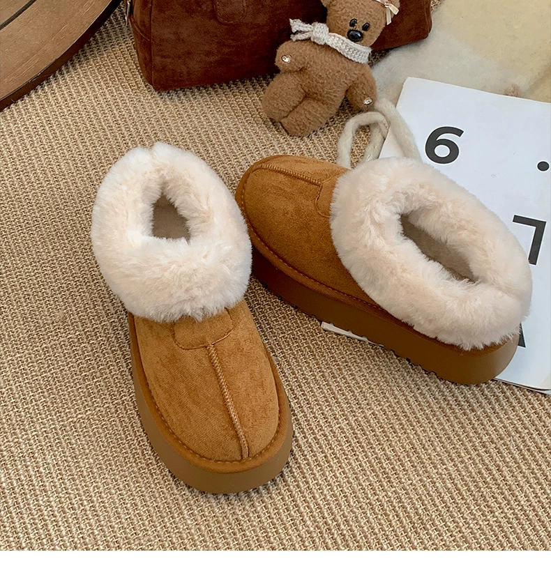 Giày bốt tuyết đế dày màu trắng dành cho nữ, kiểu dáng mùa đông mới 2025, lót lông cừu, dày dặn, ấm áp, chống trơn trượt, chất liệu cotton.