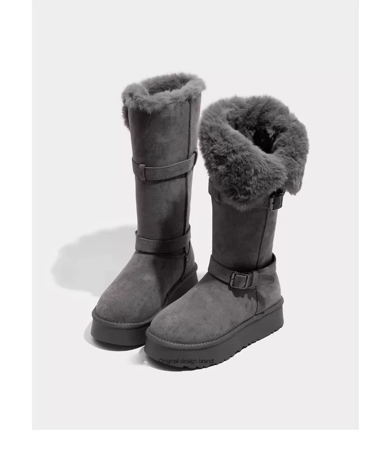 Giày bốt tuyết đế dày màu xám ấm dành cho nữ, kiểu dáng mùa đông mới 2025, lót lông cừu và dày dặn, kiểu bốt và giày bông cao đến giữa bắp chân.