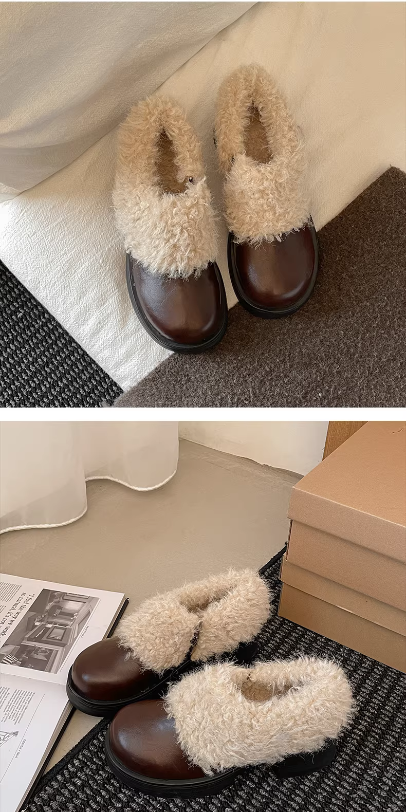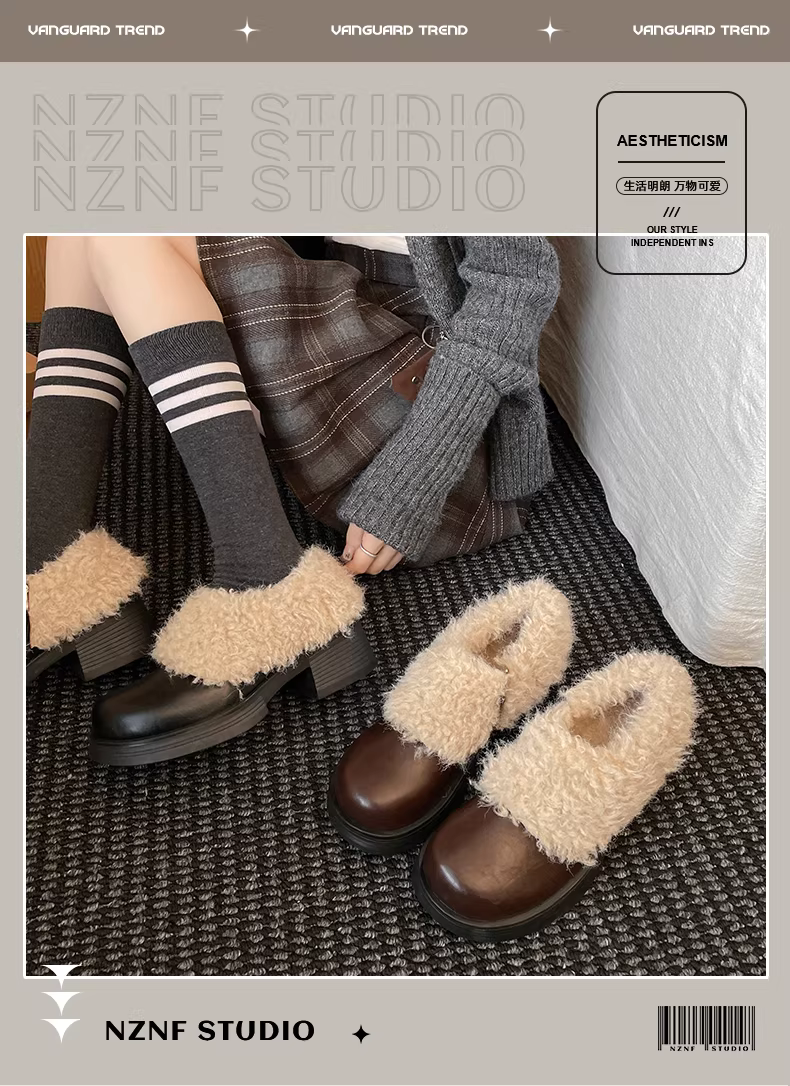 - Giày da nhung gót dày phong cách Anh cổ điển màu đen dành cho nữ, mẫu mới thu đông 2025, giữ ấm và tăng chiều cao, chất liệu len cotton