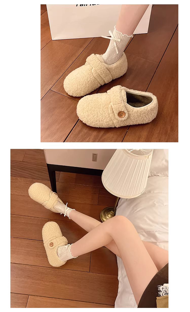 - Giày đế xuồng nữ màu trắng, đế dày, lót lông mềm mại, kiểu Birkenstock, chất liệu cotton, mới mùa thu đông 2025, thích hợp đi ngoài trời.