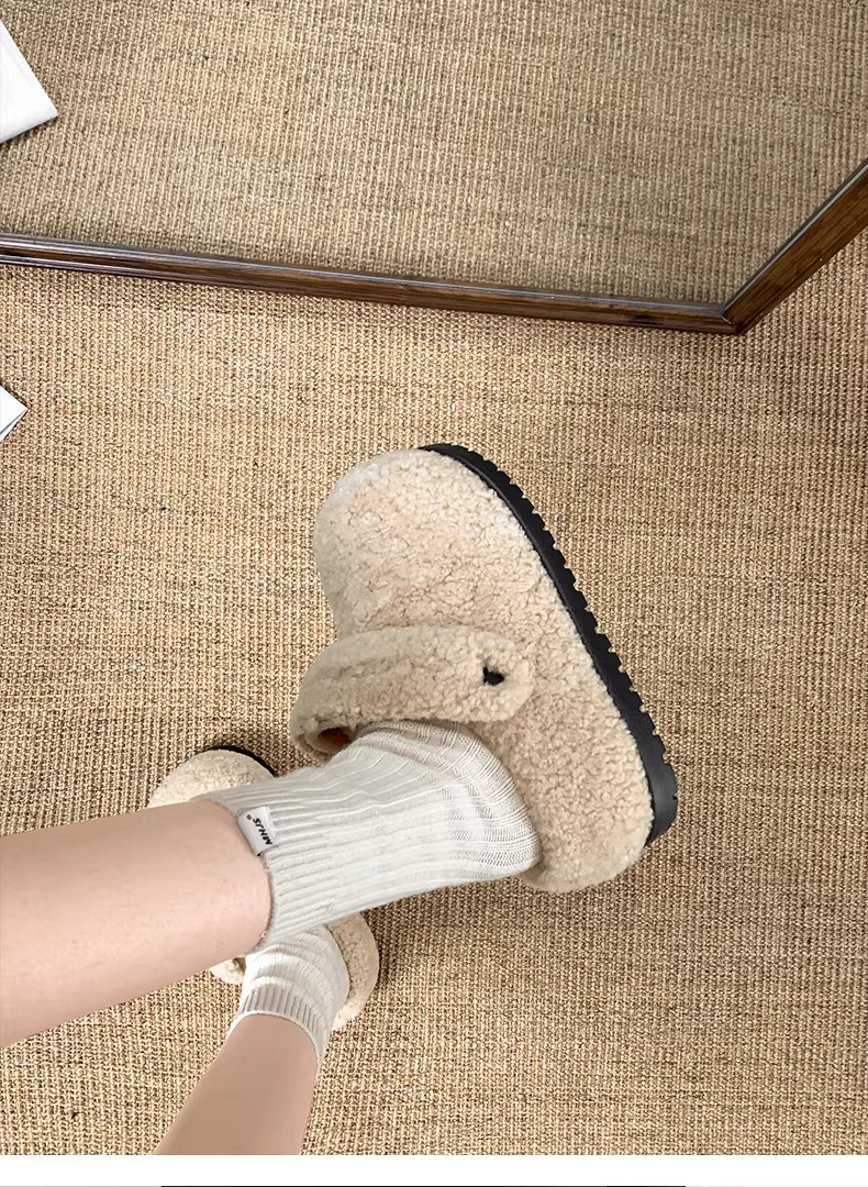 - Giày dép lông dày đế dày màu trắng dành cho nữ, thích hợp để mang ngoài trời, kiểu dáng thu đông mới 2025, lót lông cừu, ấm áp, kiểu Birkenstock, chất liệu cotton.