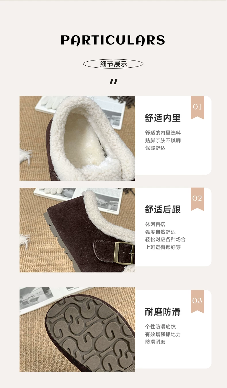 - Giày nữ đế dày bằng vải cotton, lót lông cừu giữ ấm, kiểu dáng cổ điển dày dặn, phủ kín toàn bộ bàn chân, mùa thu đông 2025, kiểu Birkenstock.
