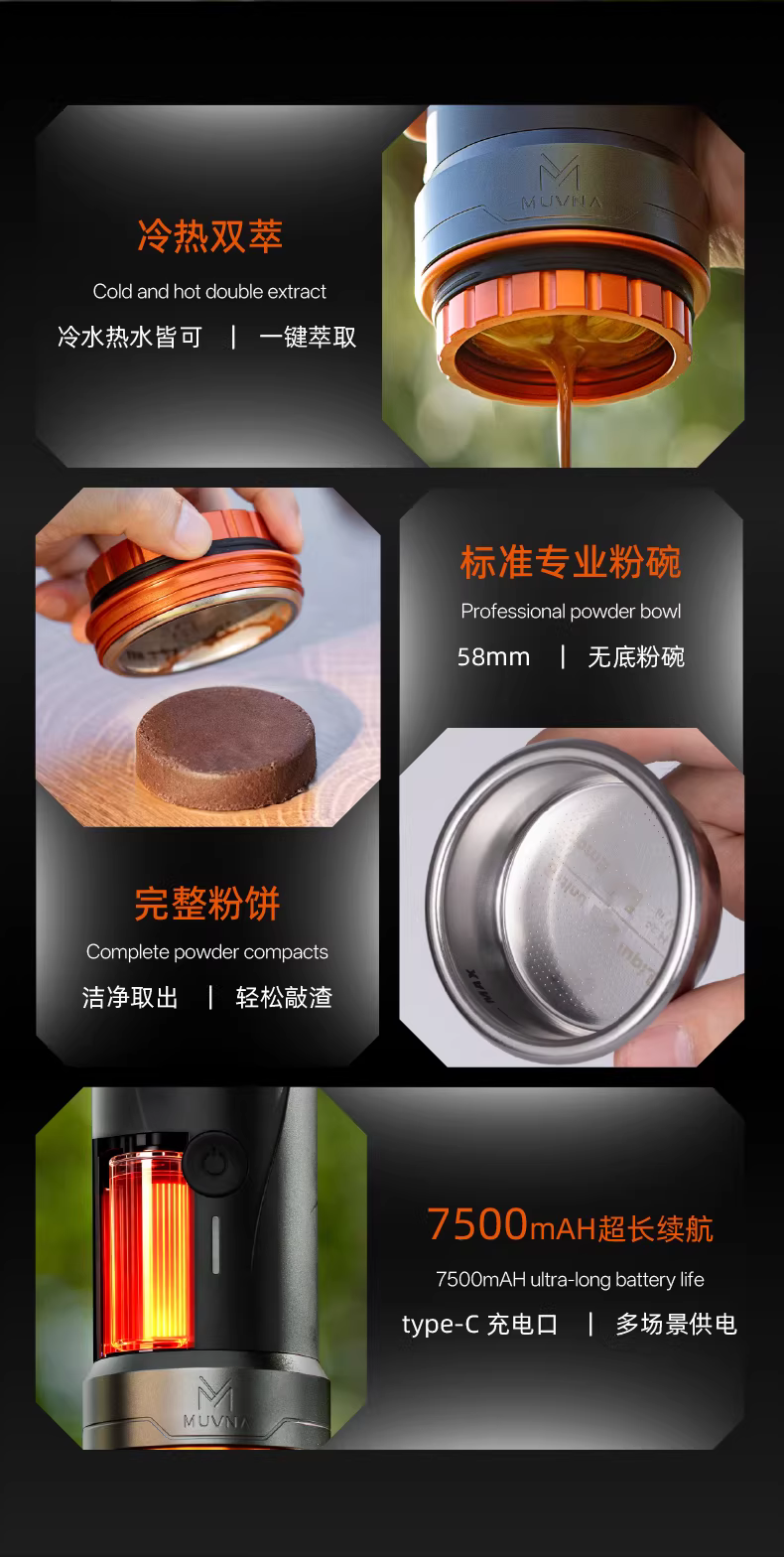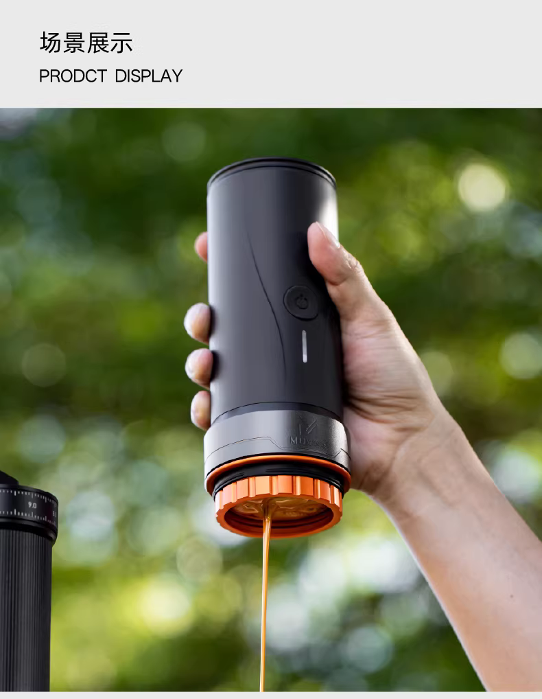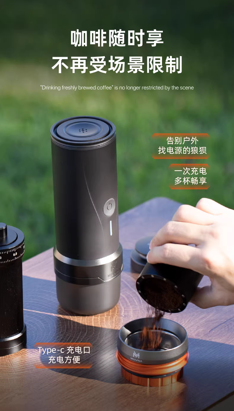 - Máy pha cà phê espresso di động MUVNA dùng cho du lịch ngoài trời và sử dụng tại nhà, tích hợp chức năng pha cà phê và xay hạt.