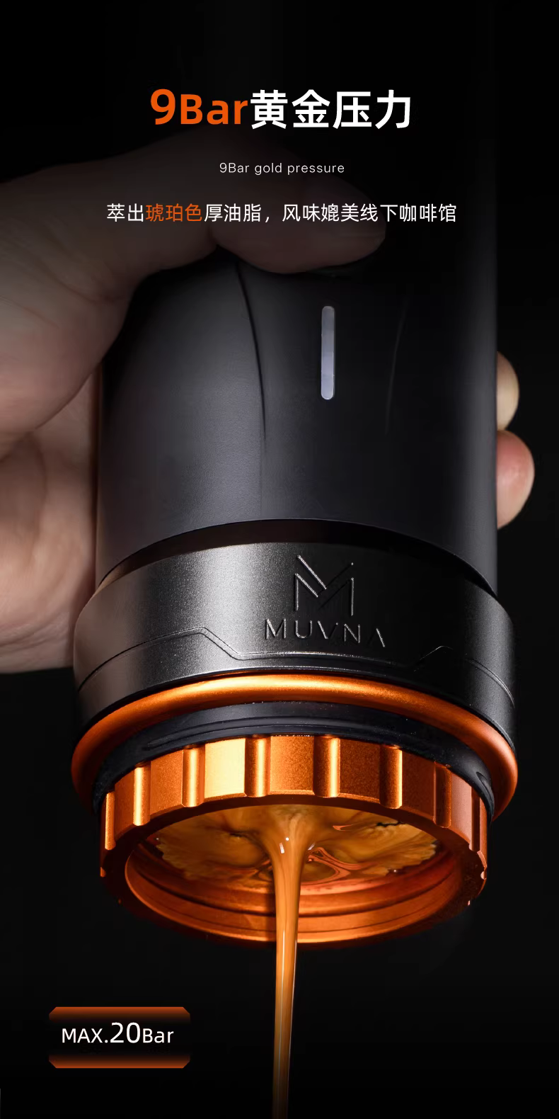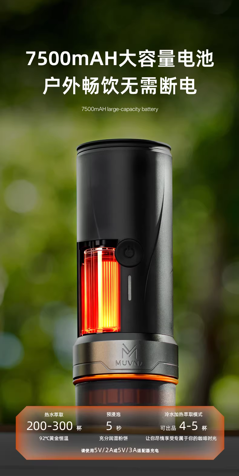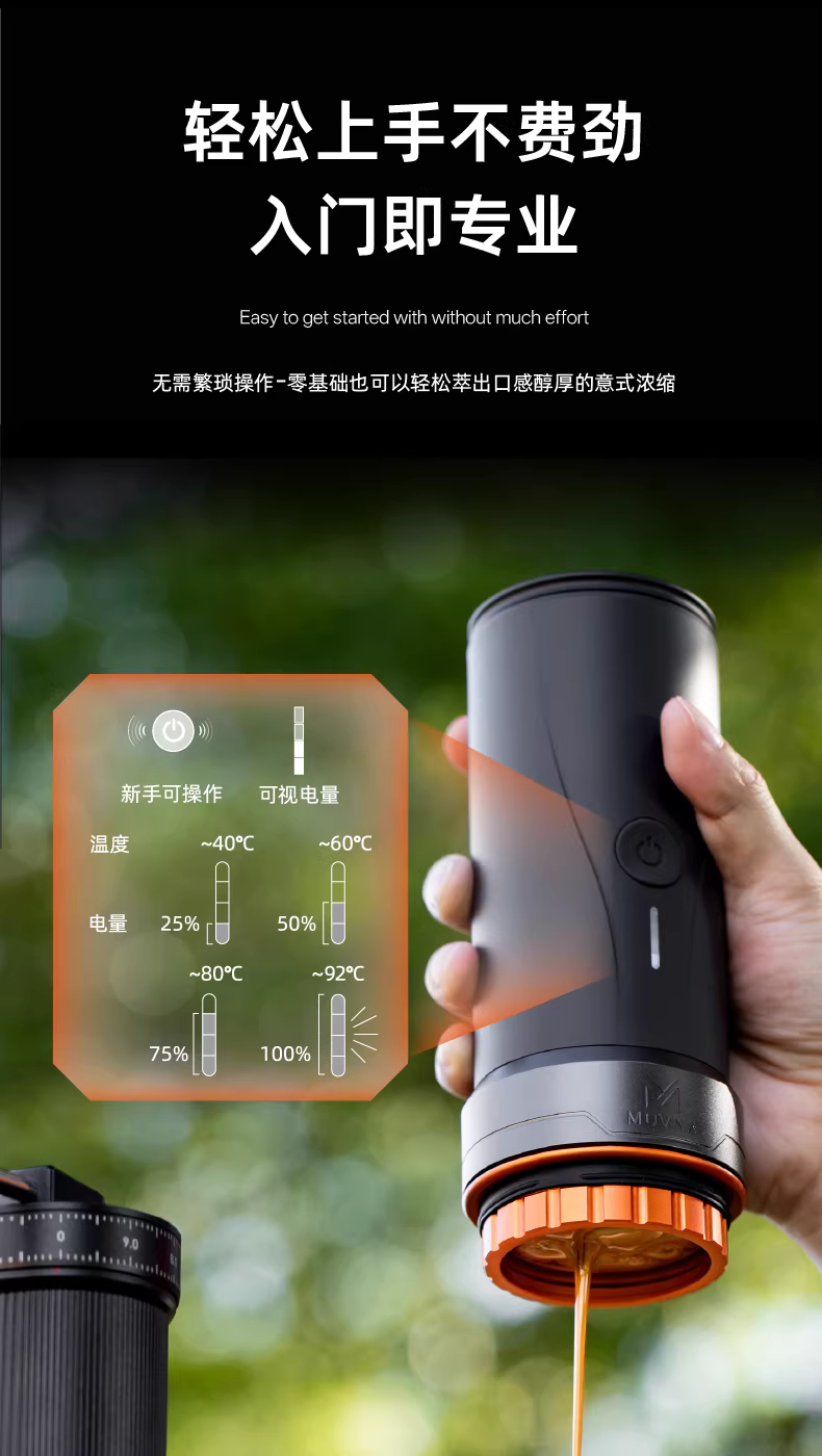 - Máy pha cà phê espresso di động MUVNA dùng cho du lịch ngoài trời và sử dụng tại nhà, tích hợp chức năng pha cà phê và xay hạt.
