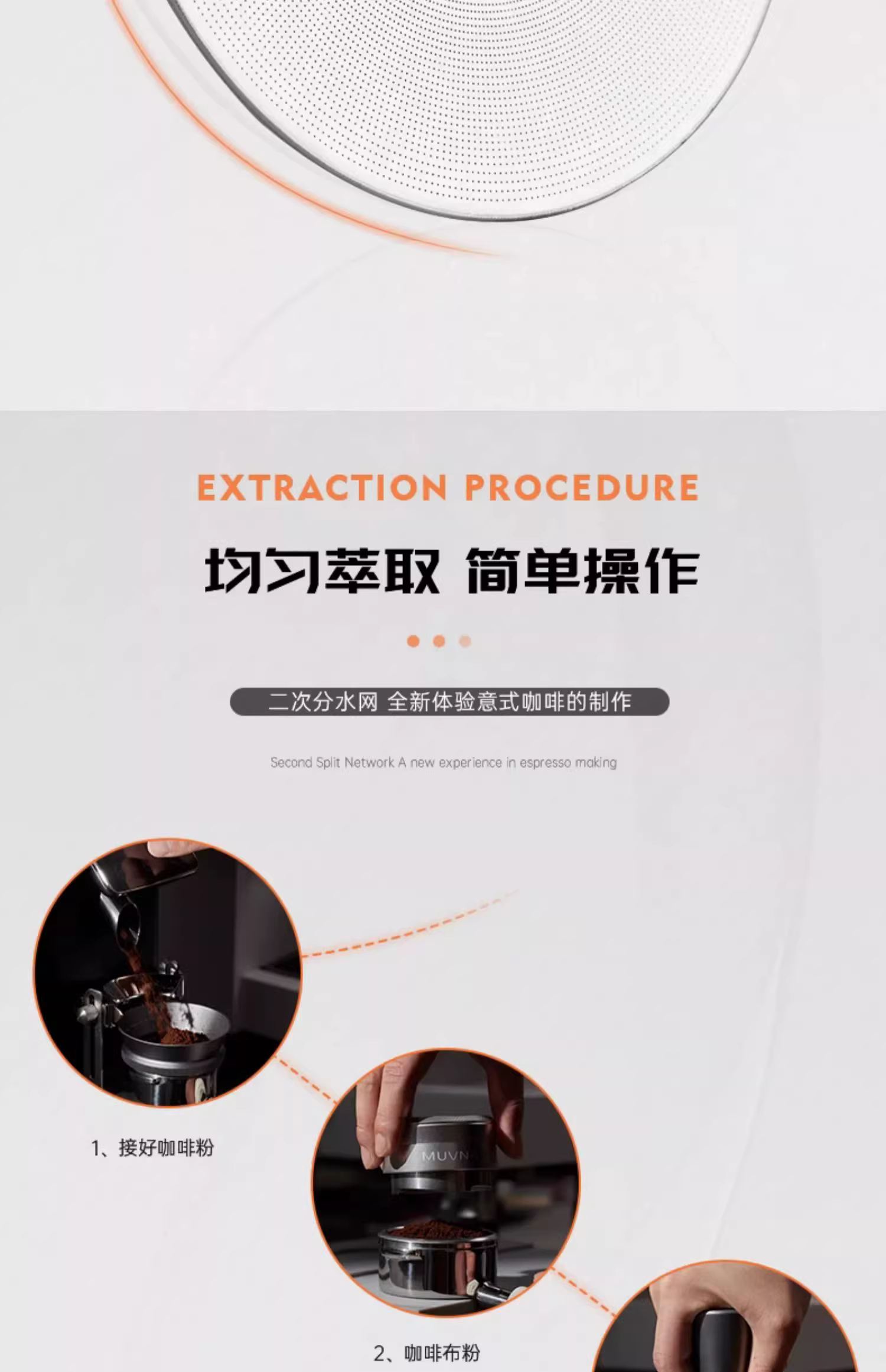 - Máy pha cà phê Espresso MUVNA, hệ thống phân phối nước thứ cấp, tay cầm 51~58, bộ lọc chiết xuất đĩa nung kết, máy làm bomb lọc.