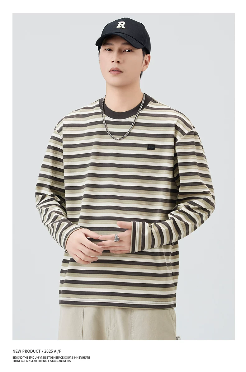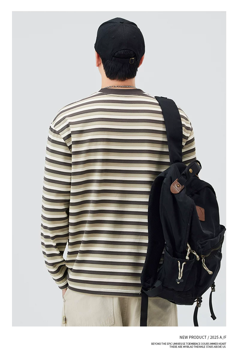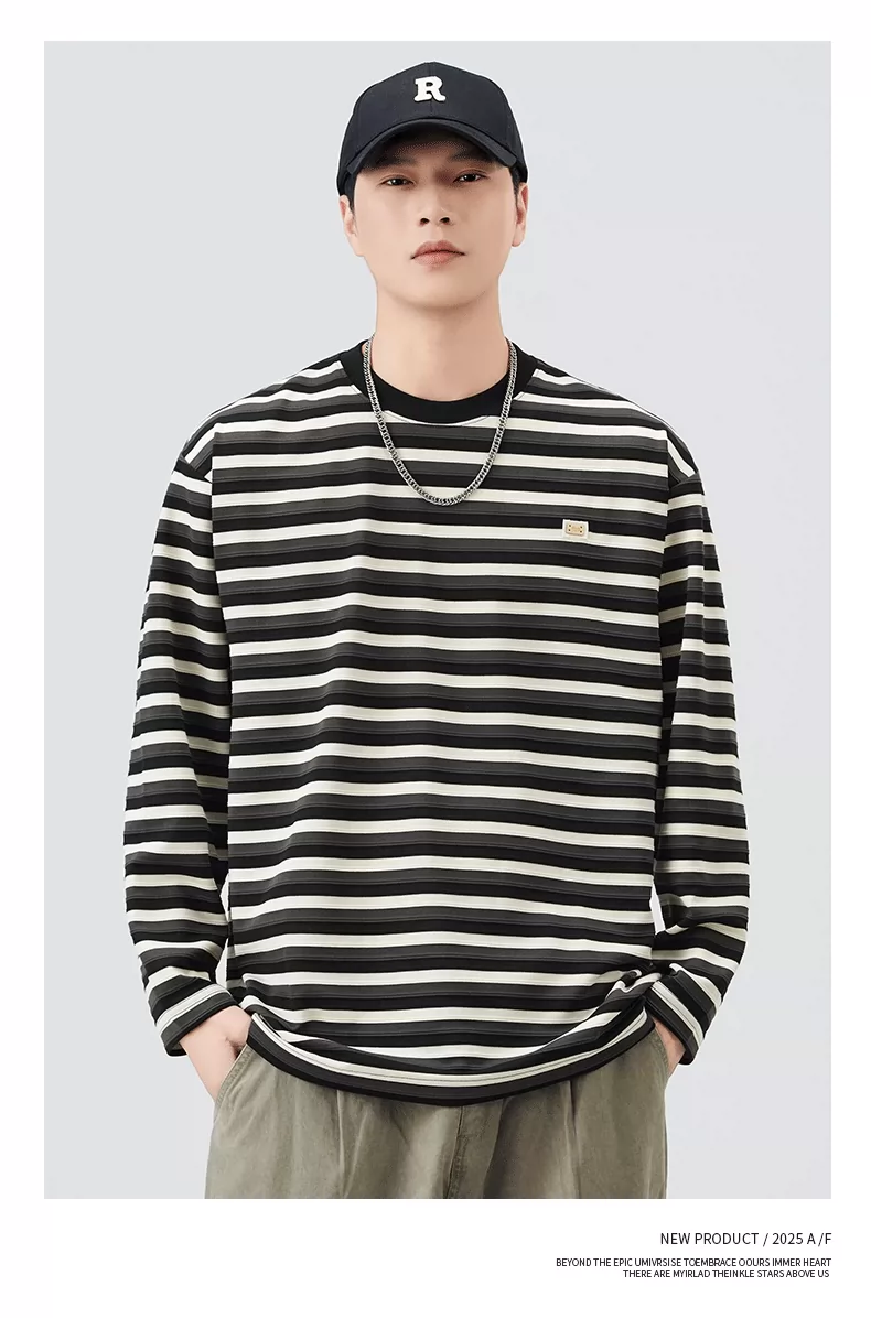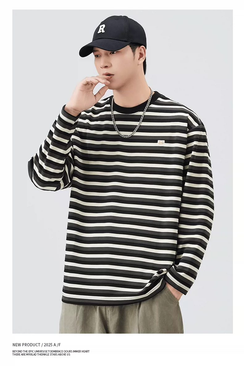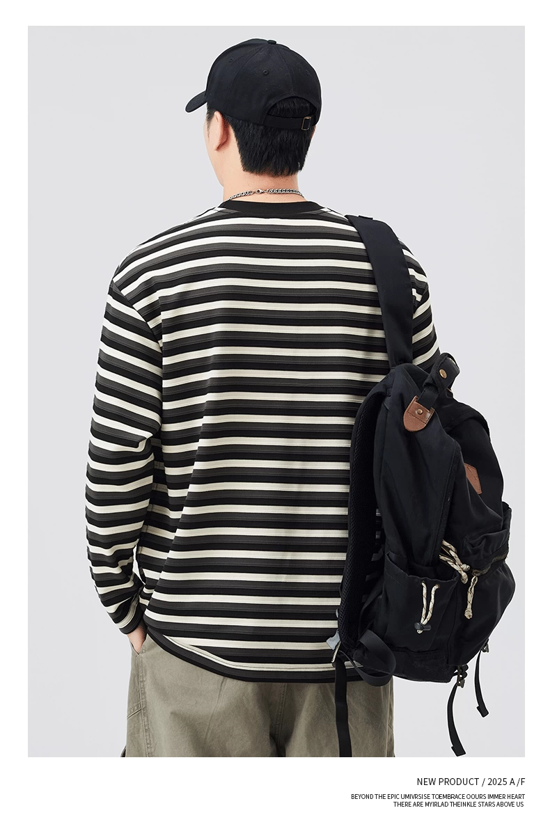 OMZM Áo sơ mi nam dài tay sọc đen trắng phong cách Mỹ mùa thu Nhật Bản cổ điển chắp vá áo sơ mi thủy thủ dáng rộng cổ tròn áo sơ mi cơ bản