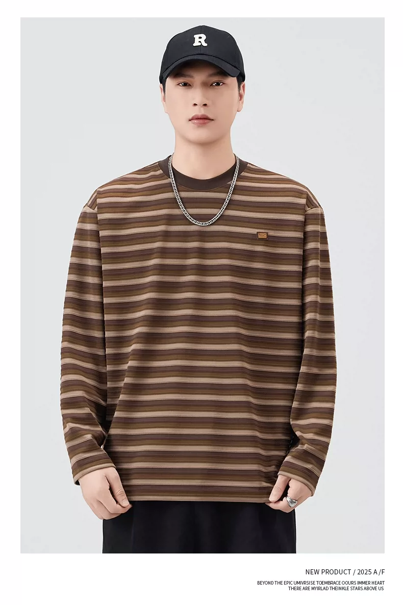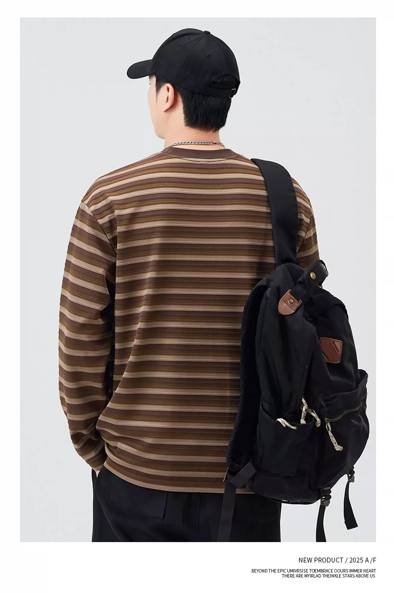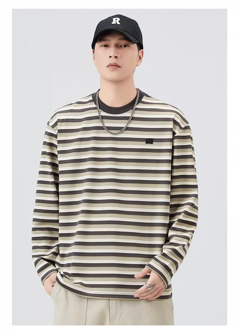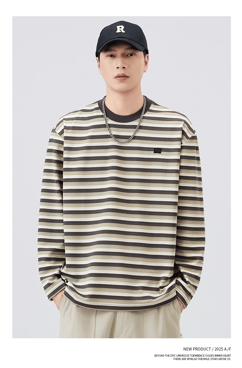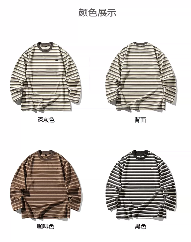 OMZM Áo sơ mi nam dài tay sọc đen trắng phong cách Mỹ mùa thu Nhật Bản cổ điển chắp vá áo sơ mi thủy thủ dáng rộng cổ tròn áo sơ mi cơ bản