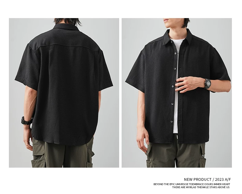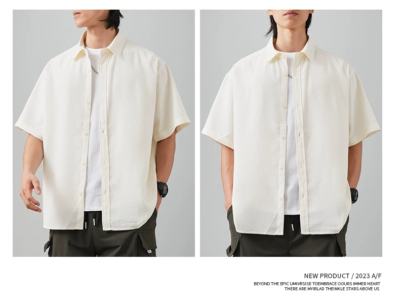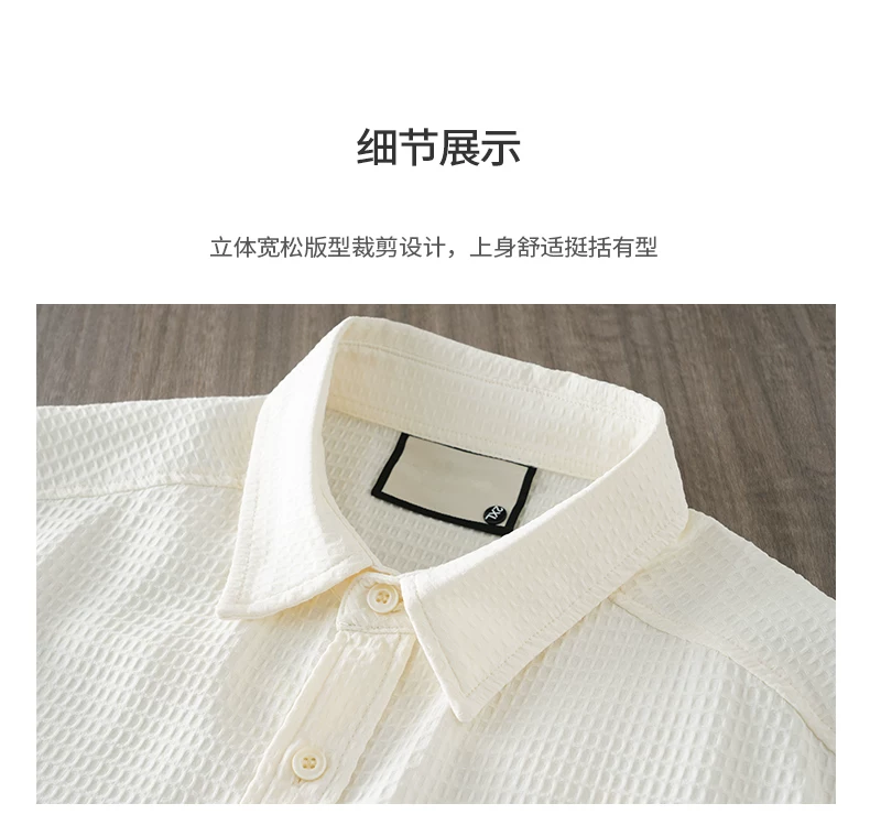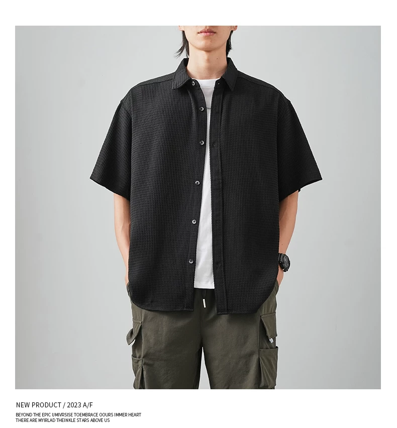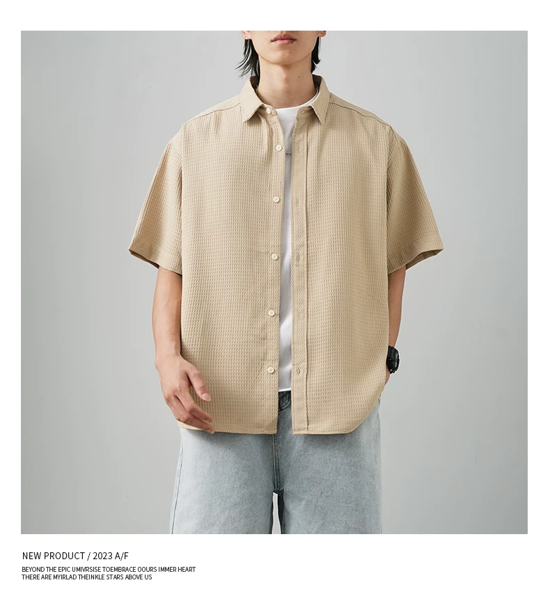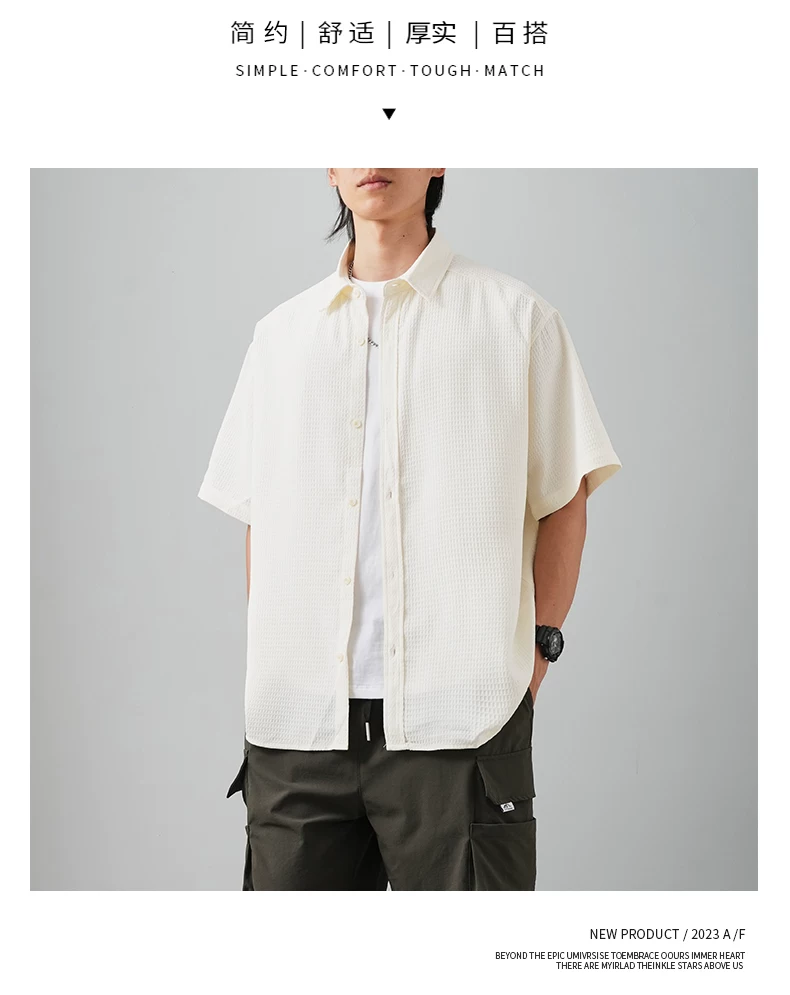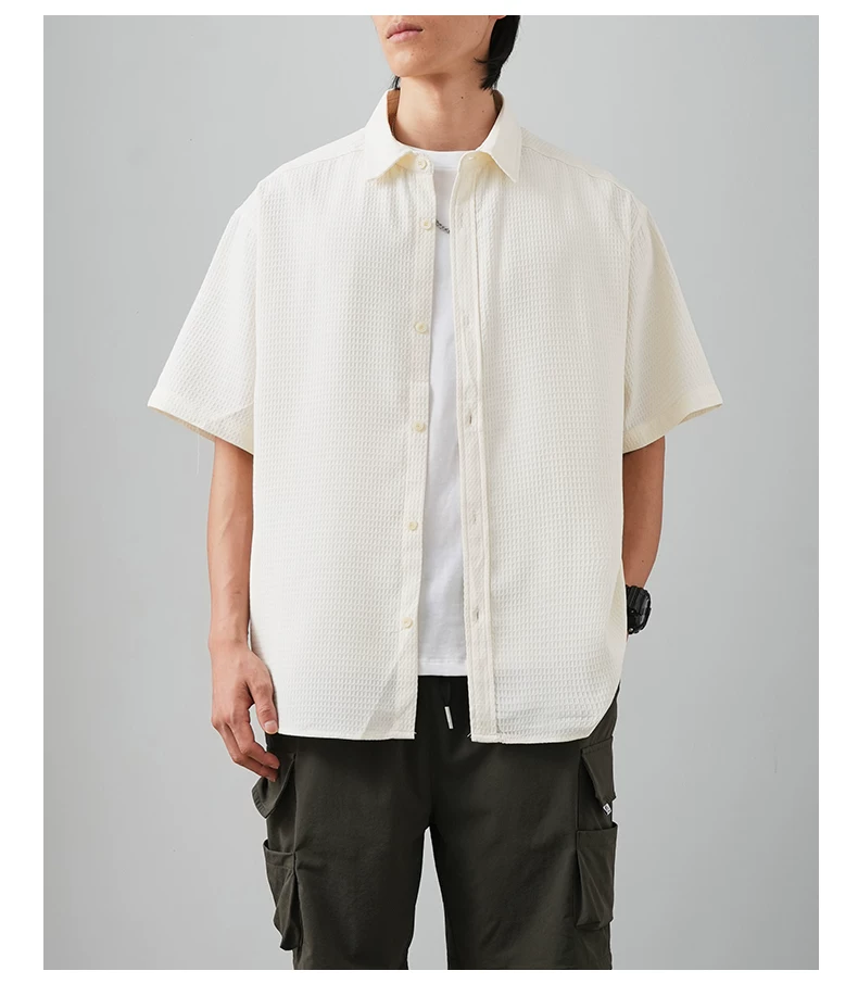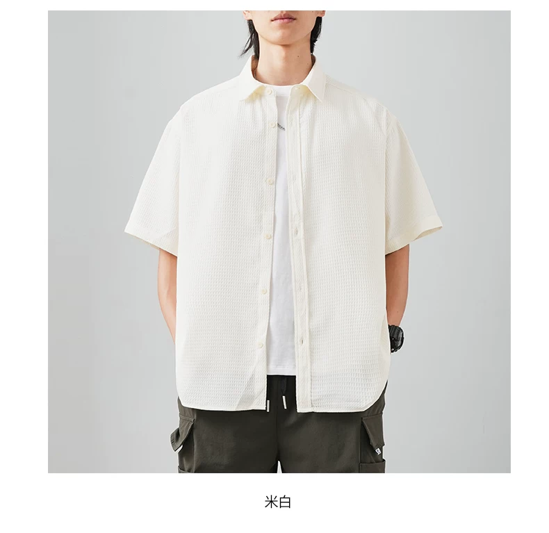 OMZM Áo sơ mi ngắn tay kiểu waffle cao cấp kiểu Mỹ dành cho nam, áo mỏng bằng lụa băng mùa hè, áo khoác rộng rãi chống nhăn, hợp thời trang.