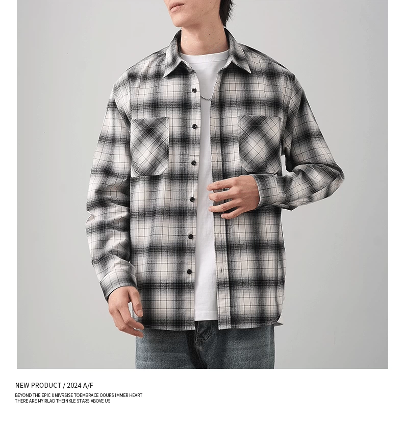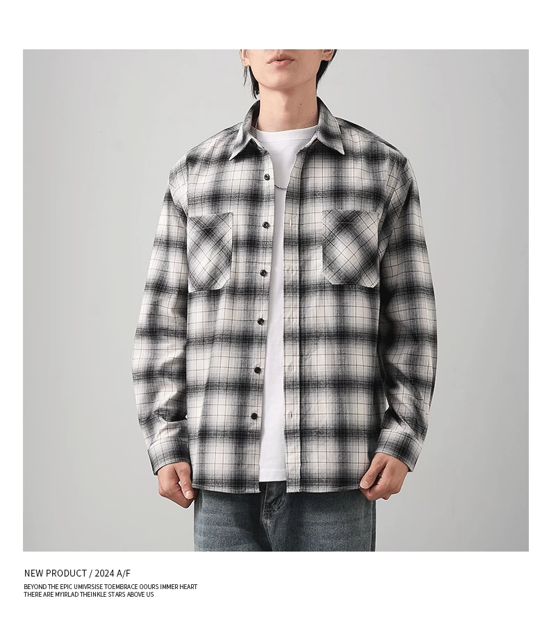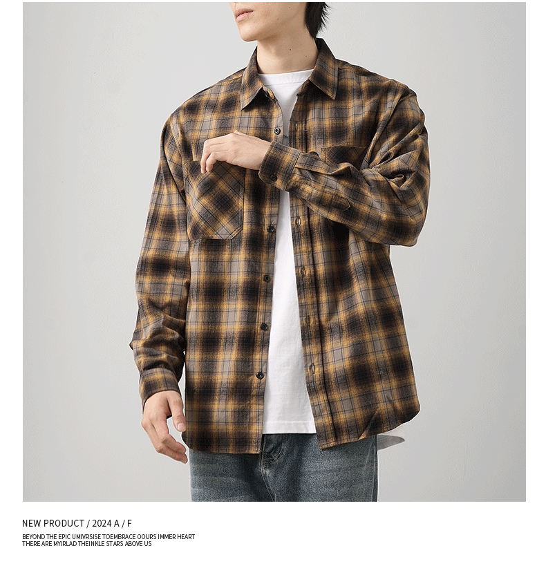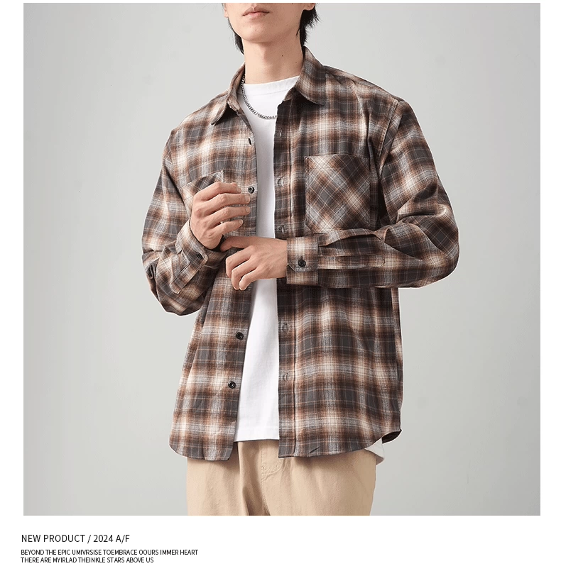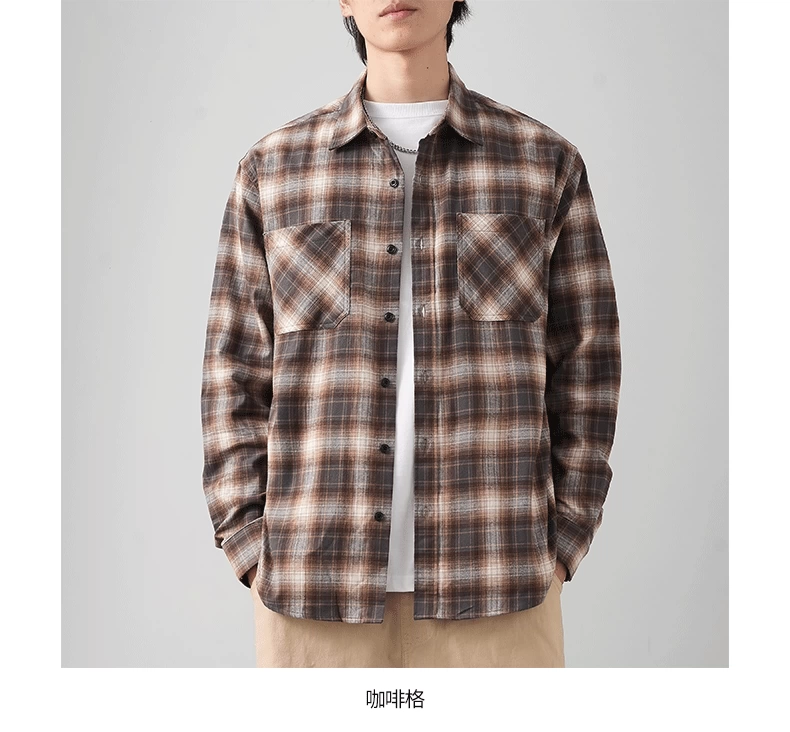 - OMZM Mỹ áo sơ mi nỉ dày dặn nam dài tay mùa thu áo sơ mi kẻ sọc cổ điển dáng rộng áo khoác bảo hộ lao động thông thường
