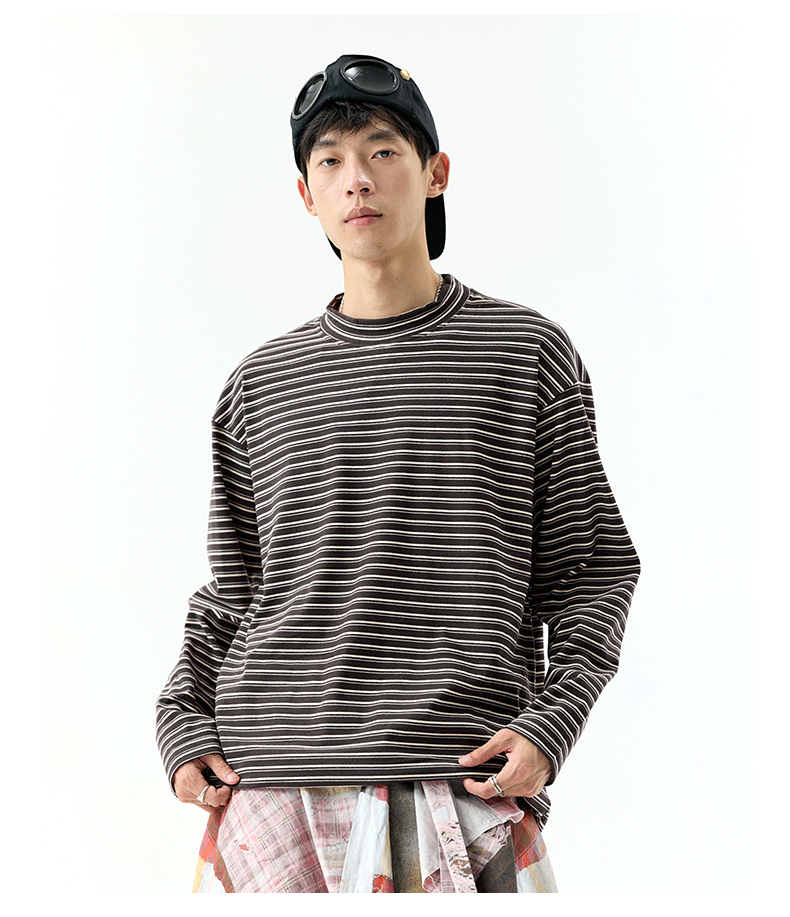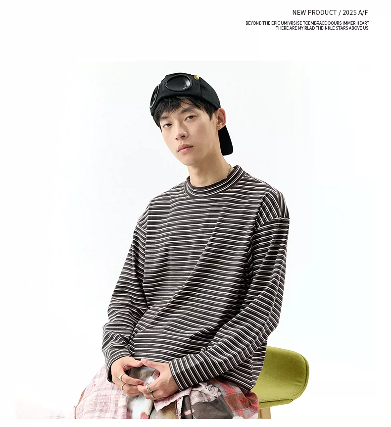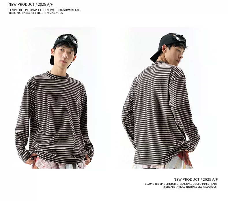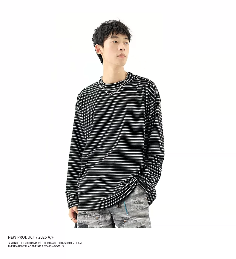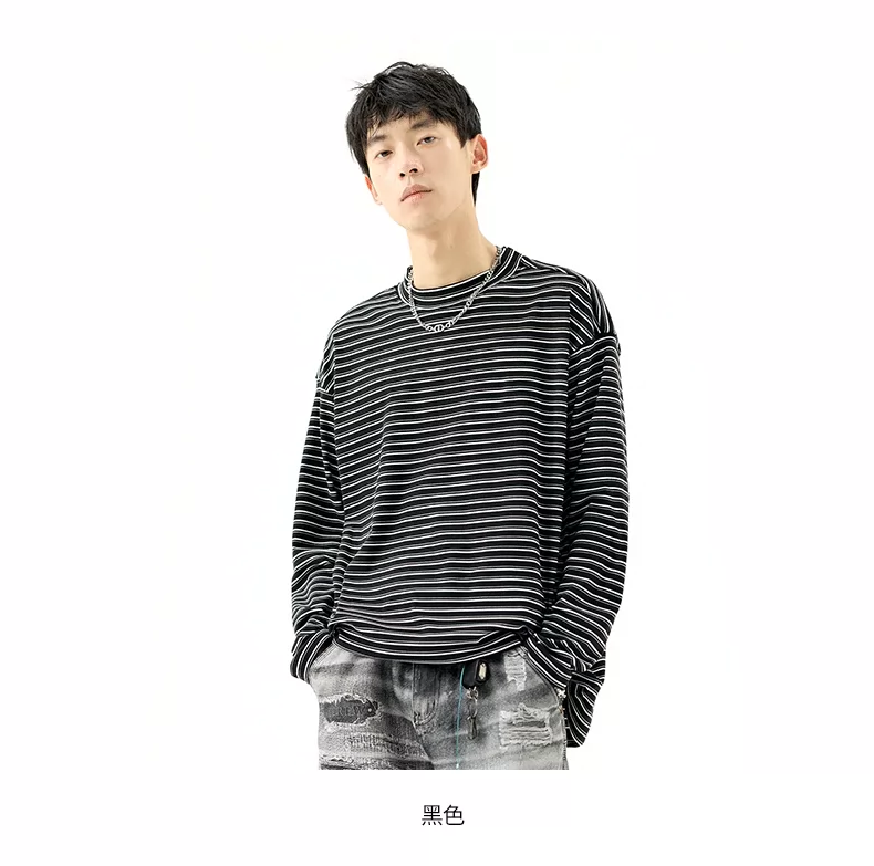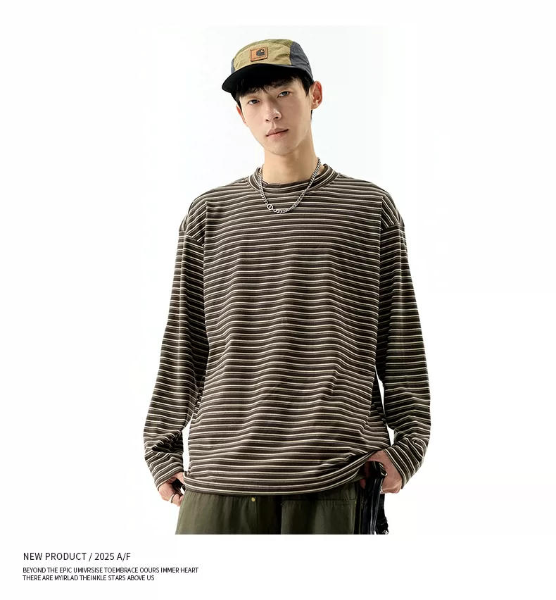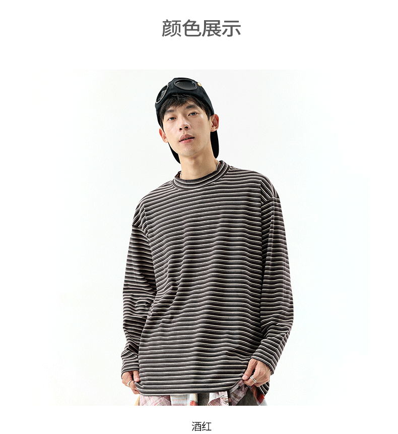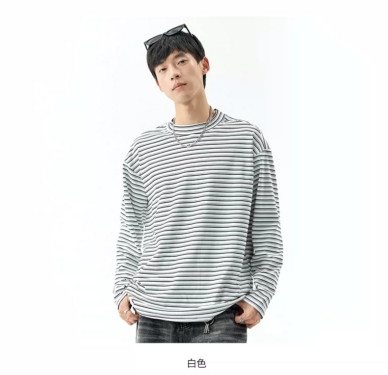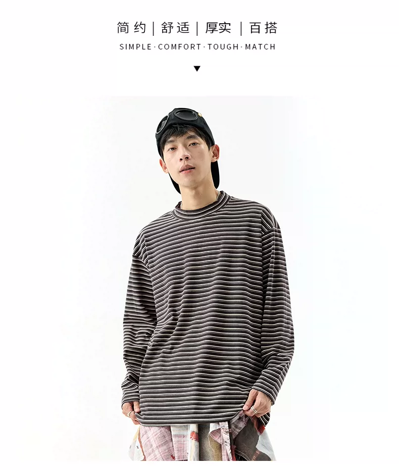 - OMZM300G hạng nặng Đức nhung lớp nền áo thun nam mùa thu cổ cao nửa cổ áo thun dài tay sọc cổ điển Mỹ