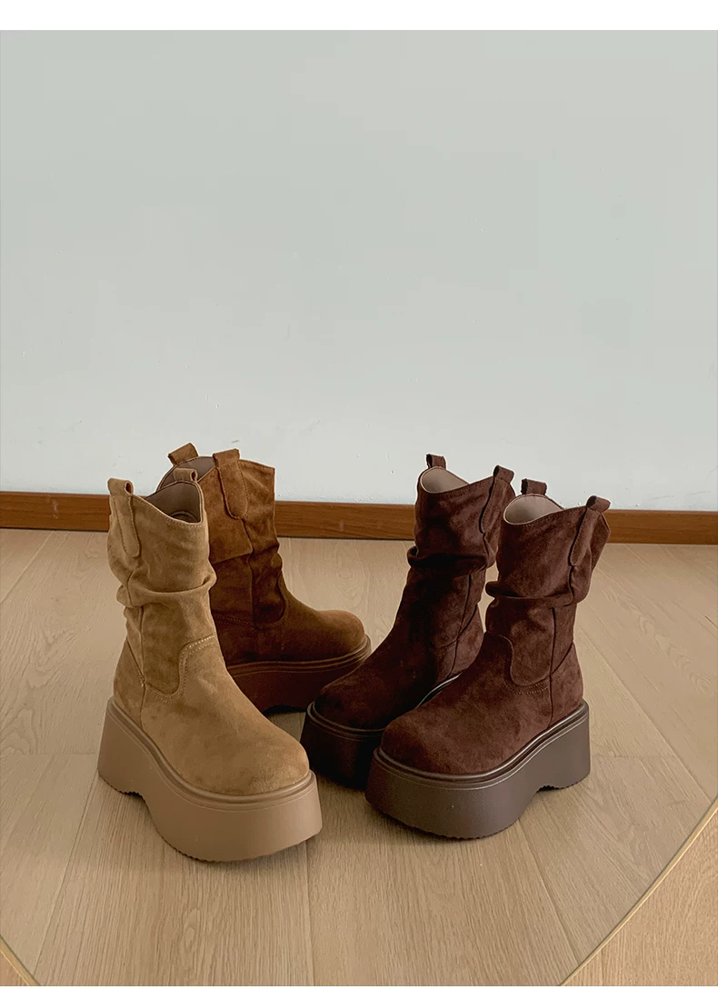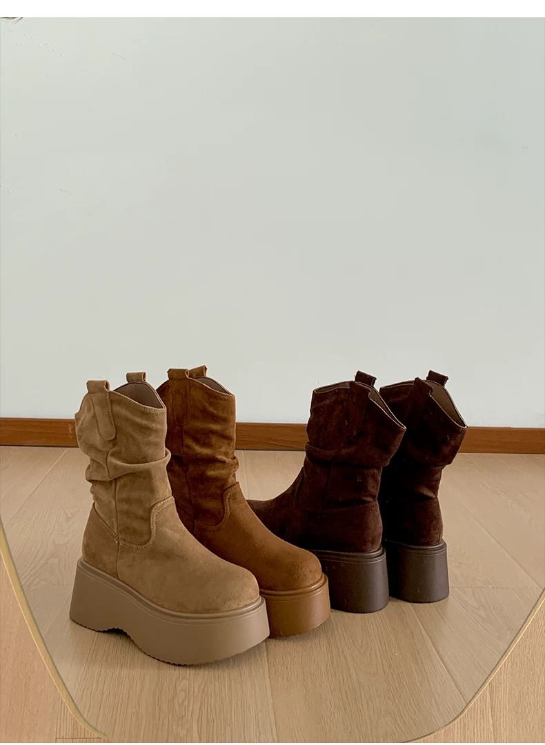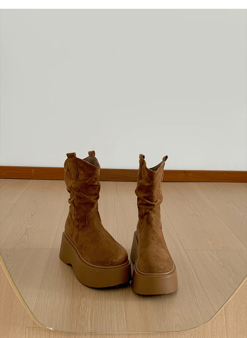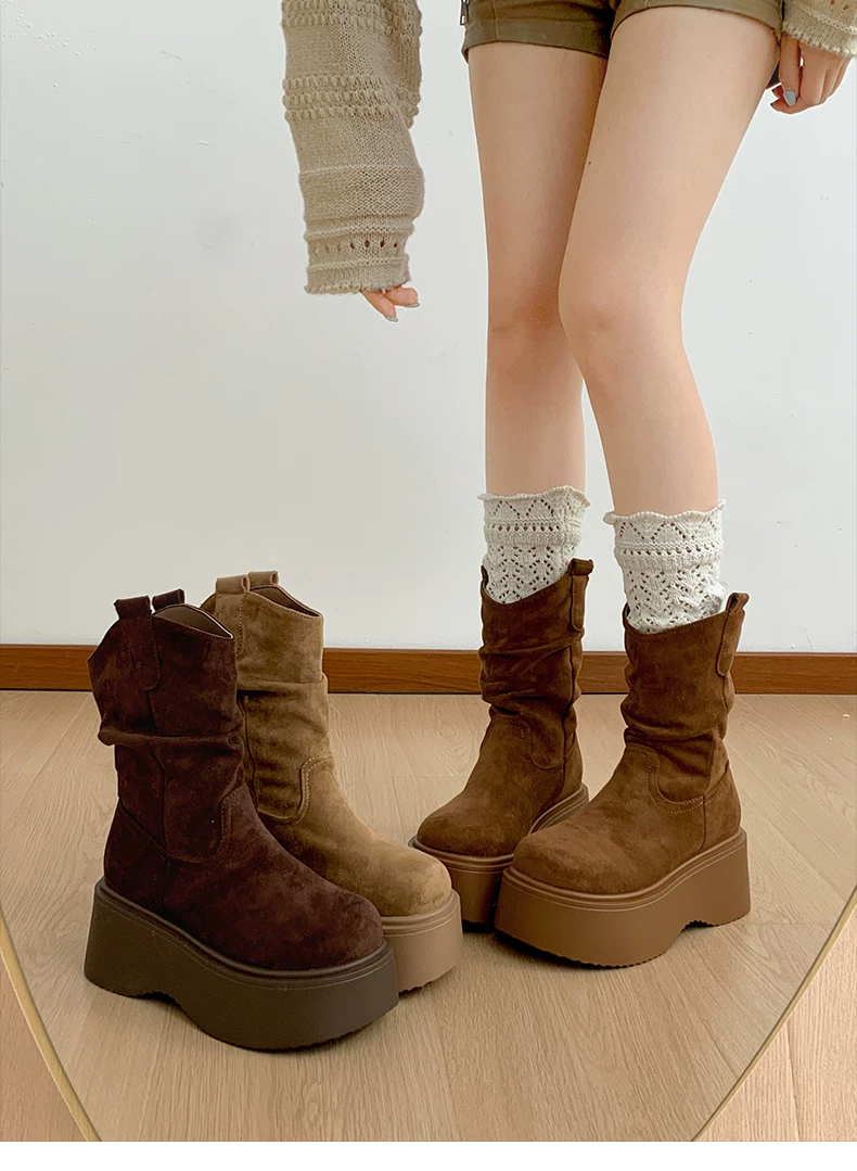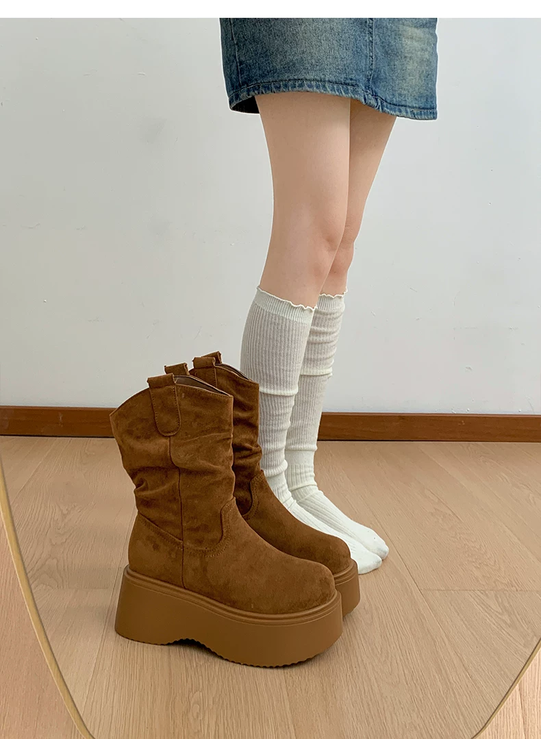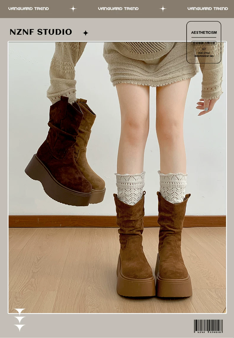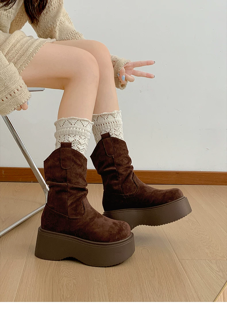- Phía Nam ở miền Nam: Giày bốt đế dày màu nâu cổ điển dành cho nữ, Giày bốt cao đến giữa bắp chân, Giày bốt cưỡi ngựa tăng chiều cao kiểu dáng thon gọn mới mùa thu/đông 2025.
