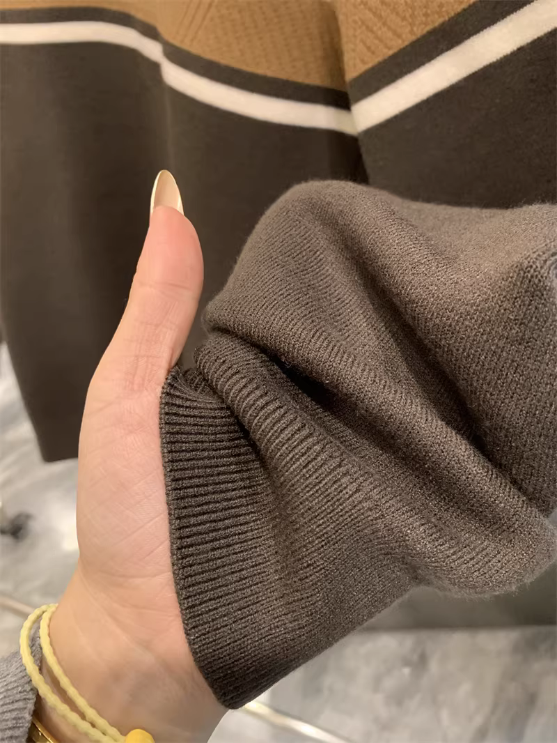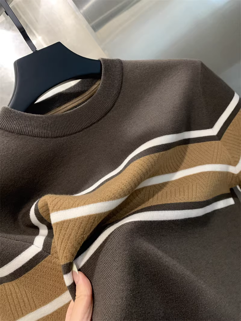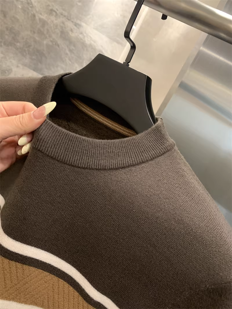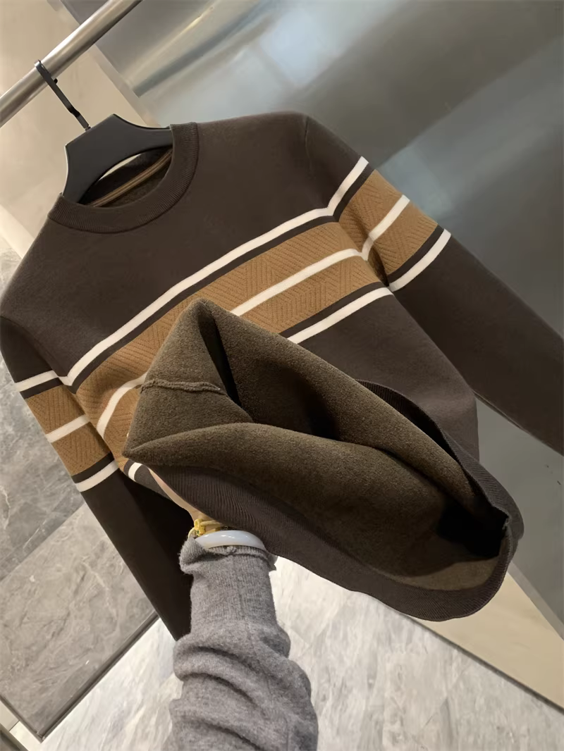 - Phong cách Don Quixote! Áo len dệt kim cổ tròn dày dặn, ấm áp, lót lông cừu, phối màu sọc chéo dành cho nam mùa thu đông.