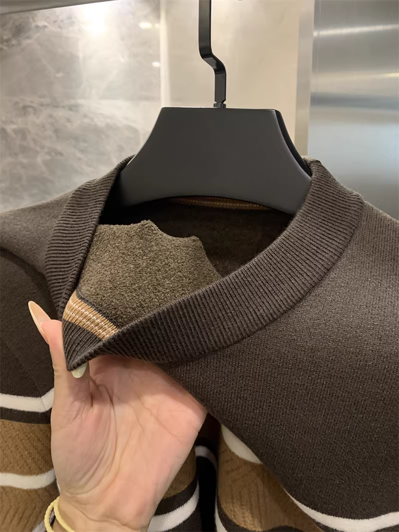 Phong cách Don Quixote! Áo len dệt kim cổ tròn dày dặn, ấm áp, lót lông cừu, phối màu sọc chéo dành cho nam mùa thu đông.