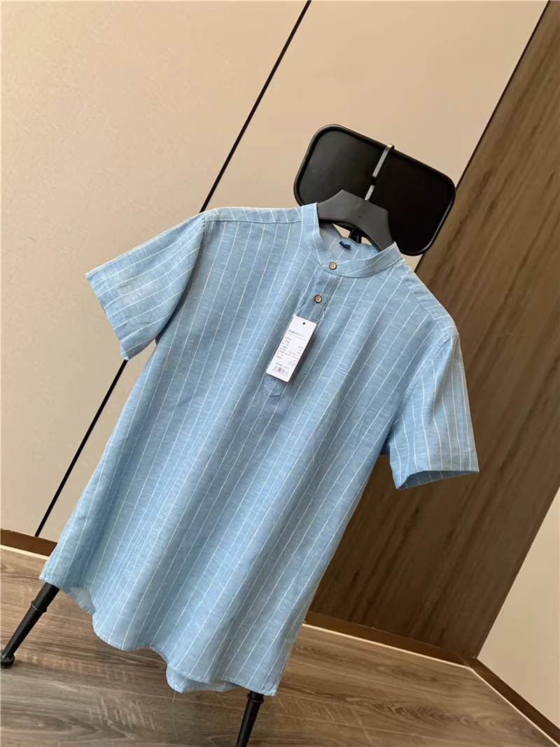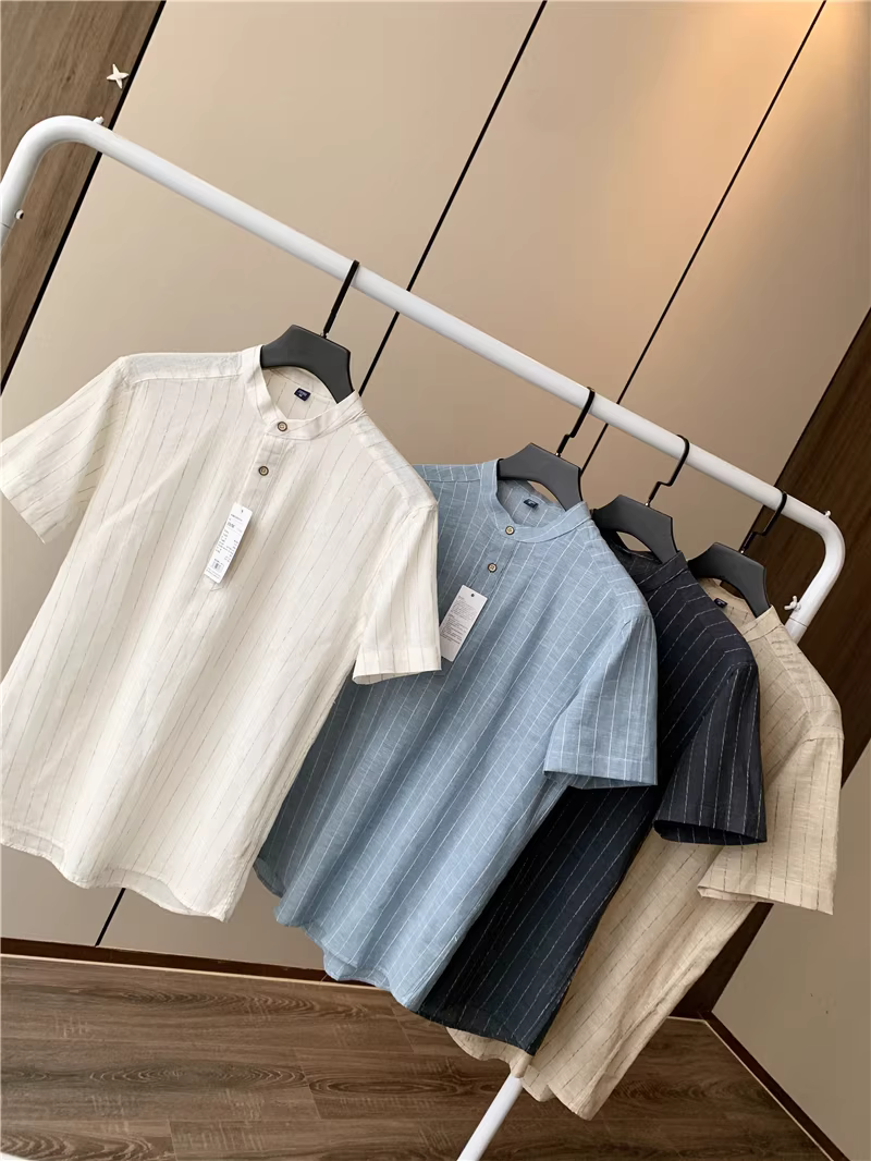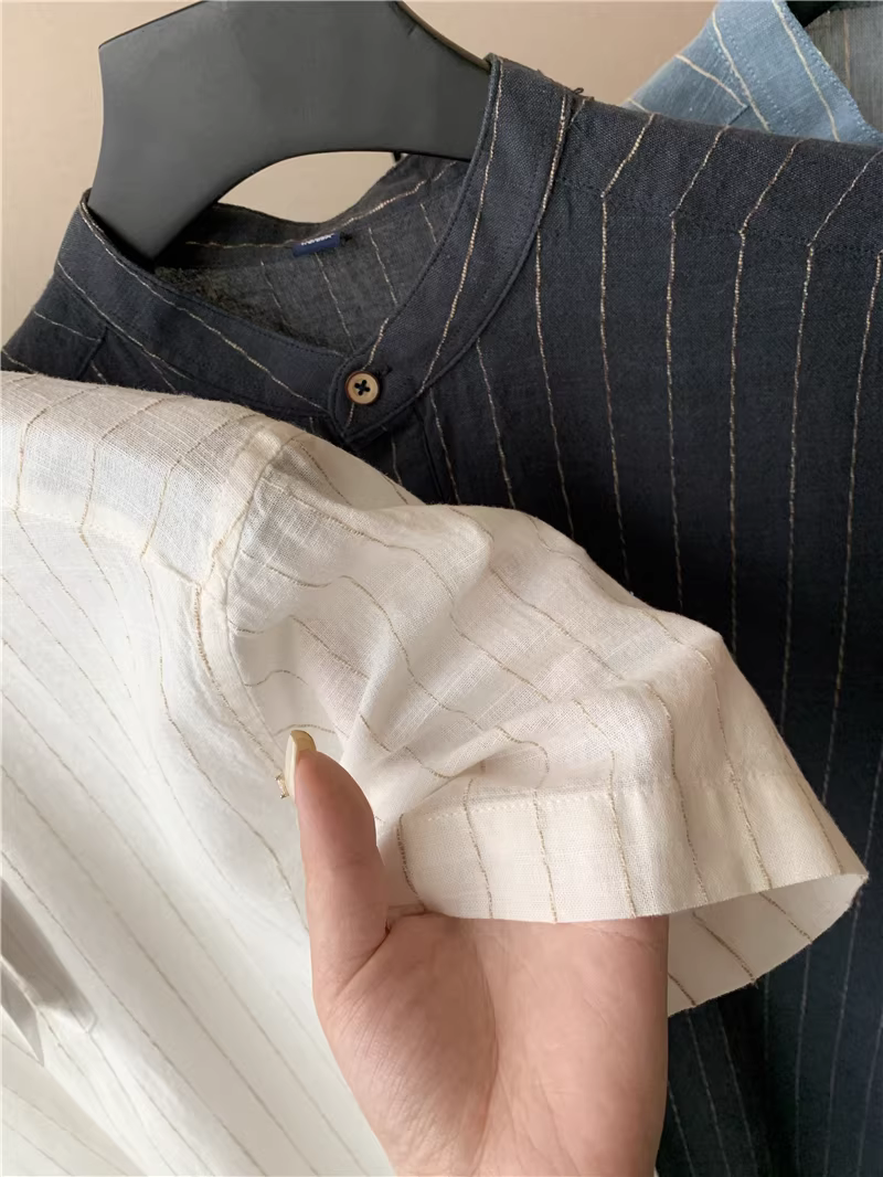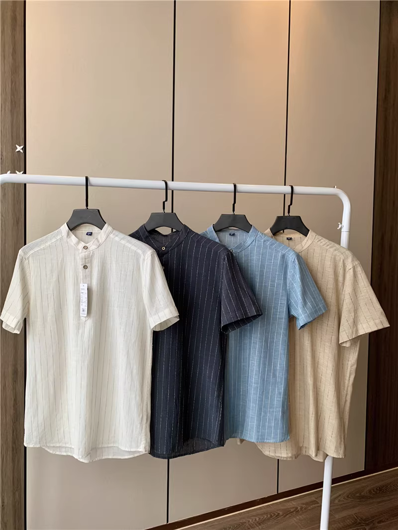 - Phong cách văn học Don Quixote! Cổ Henry! Áo sơ mi nam ngắn tay kẻ sọc cotton và linen cổ đứng mới mùa xuân hè.