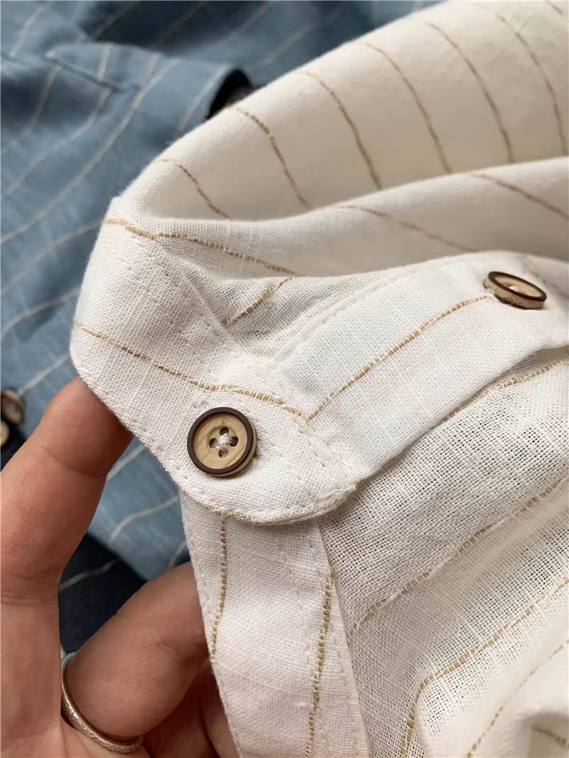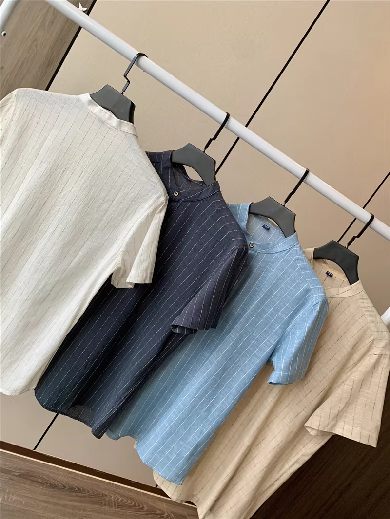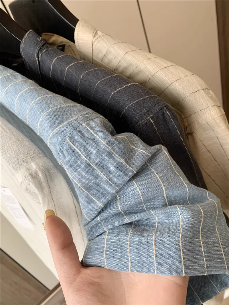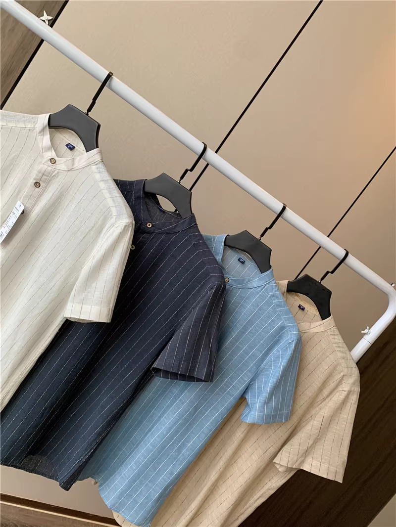 - Phong cách văn học Don Quixote! Cổ Henry! Áo sơ mi nam ngắn tay kẻ sọc cotton và linen cổ đứng mới mùa xuân hè.
