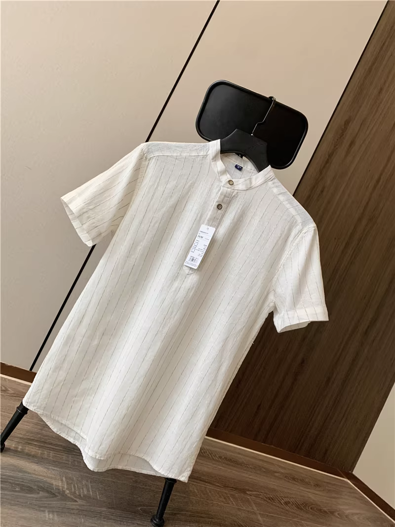 Phong cách văn học Don Quixote! Cổ Henry! Áo sơ mi nam ngắn tay kẻ sọc cotton và linen cổ đứng mới mùa xuân hè.