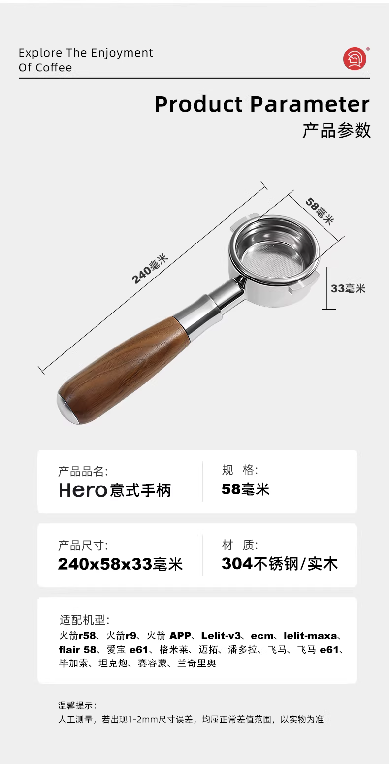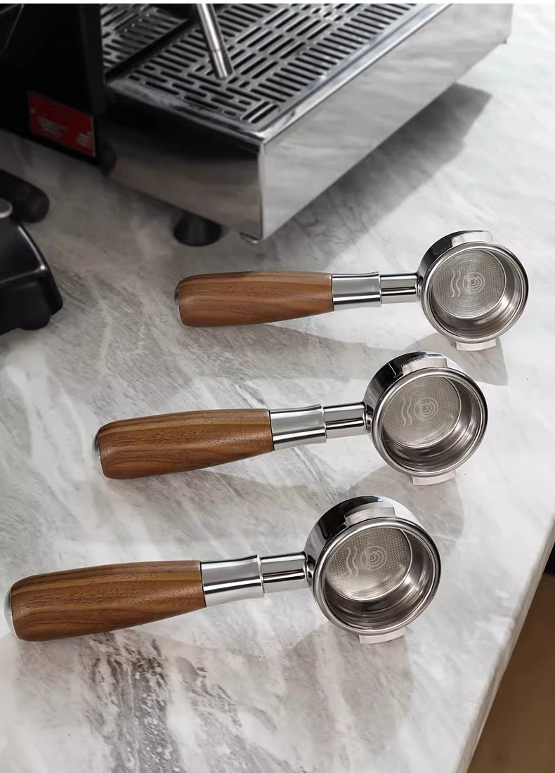 - Phụ kiện máy pha cà phê Ý Hero, bộ lọc không đáy 58mm, máy pha cà phê espresso đã được độ chế, tay cầm gỗ, phụ kiện E61 spicy mom