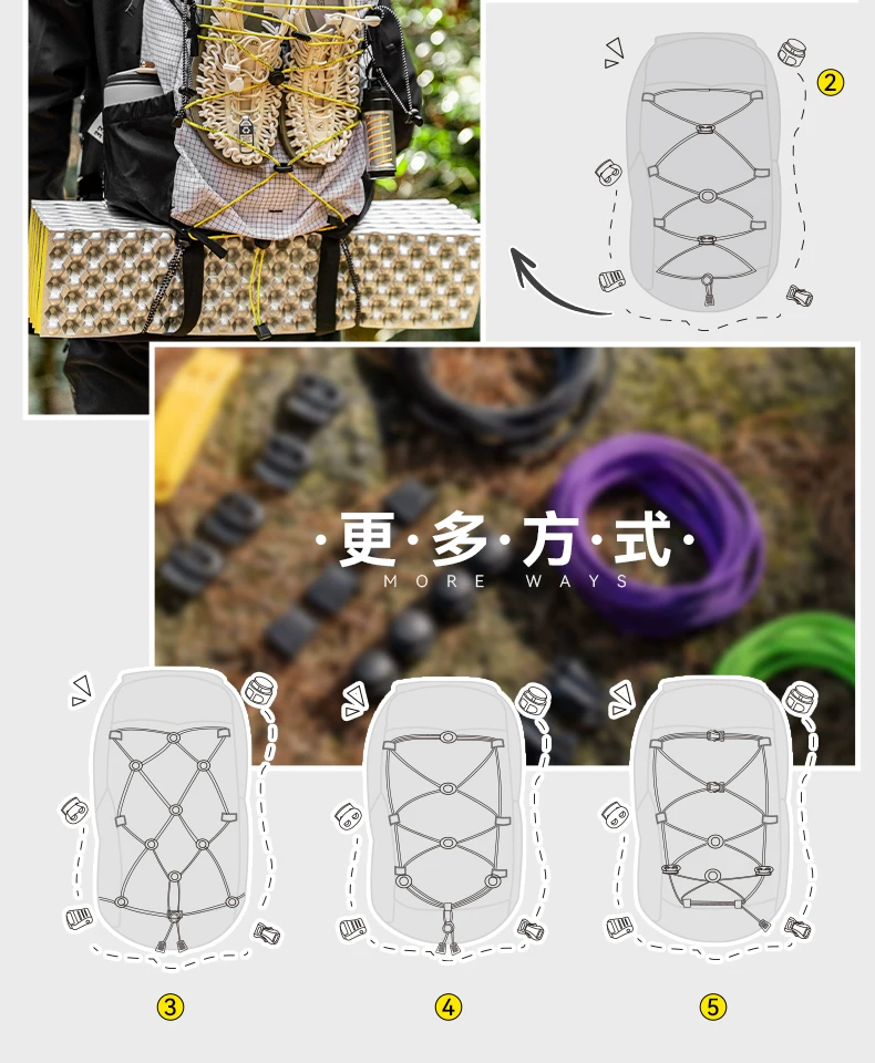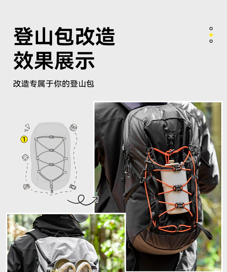 - Phụ kiện tự chế ba lô leo núi ngoài trời: dây thun co giãn, khóa dây thun, mở rộng ba lô, dây thun gắn ngoài, cố định gậy leo núi