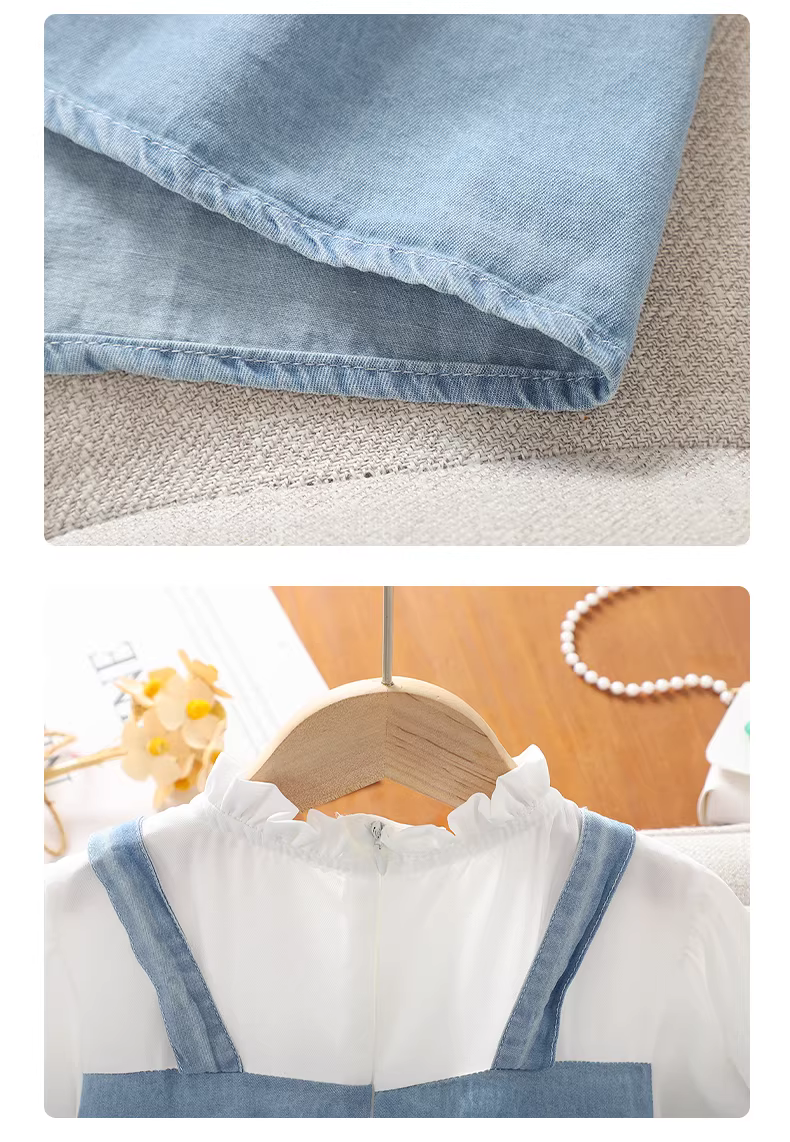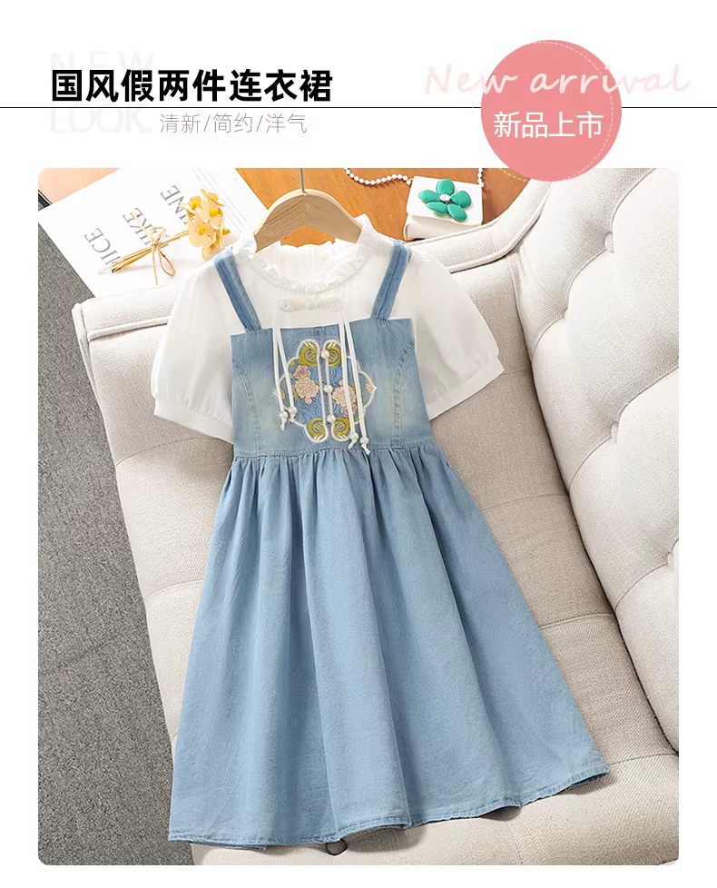 - Quần áo mùa hè cho bé gái phong cách Trung Quốc mới, đầm giả hai mảnh mùa hè 2025, kiểu retro giản dị, váy denim phong cách dân tộc cho bé gái