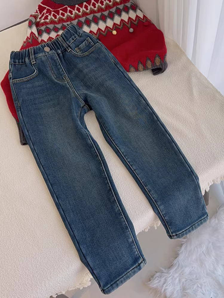 - Quần áo nữ mùa đông 2025 phong cách Hàn Quốc thời trang có túi hình trái tim tích hợp lớp lông cừu, chất liệu denim mềm mại dành cho trẻ lớn hơn, quần đen kiểu dáng ôm sát.