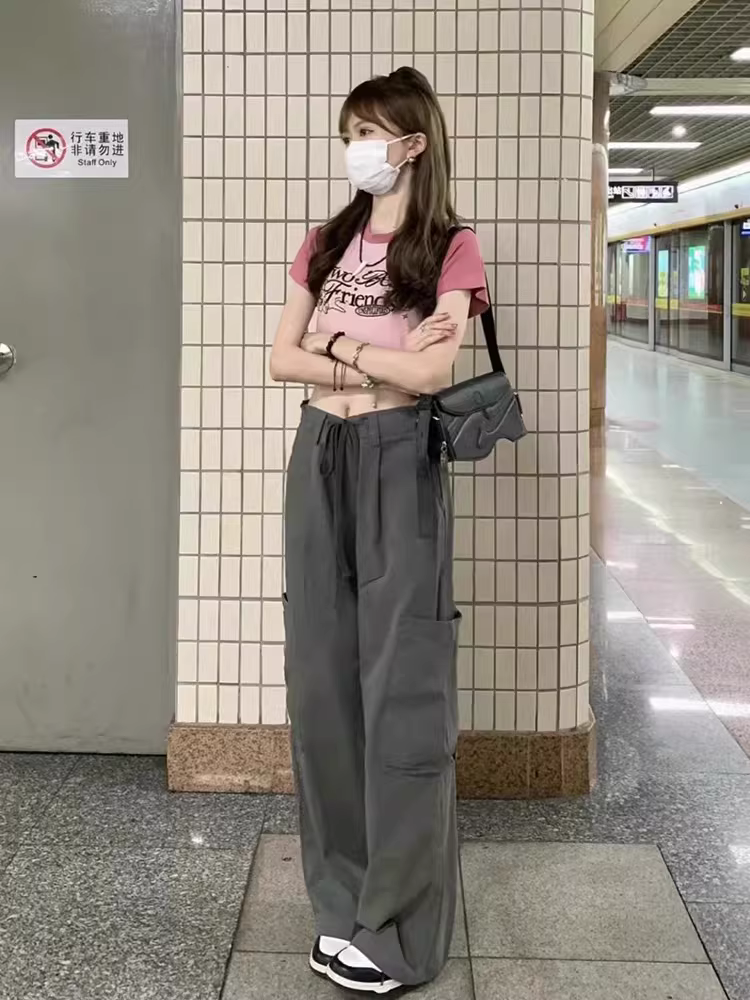 Quần cargo dáng lửng dành cho nữ, mùa xuân hè, cỡ lớn, lưng cao, thiết kế thời trang, che hông, tôn dáng, quần ống rộng