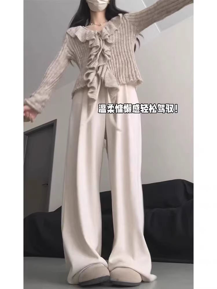Quần dày lót lông cừu màu trắng nhạt dành cho nữ, thu đông 2025, cỡ lớn, cạp cao, che hông, thon gọn, mềm mại và quần ống rộng thông thường.