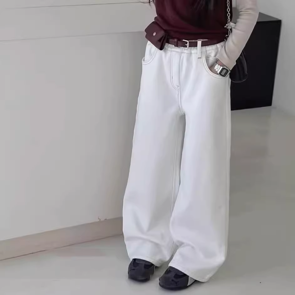 - Quần denim dày ống thẳng dành cho nữ có lông cừu, quần trắng mùa thu đông, quần dài đến sàn, quần mềm mại, rộng rãi, quần áo trẻ em hợp thời trang thông thường.