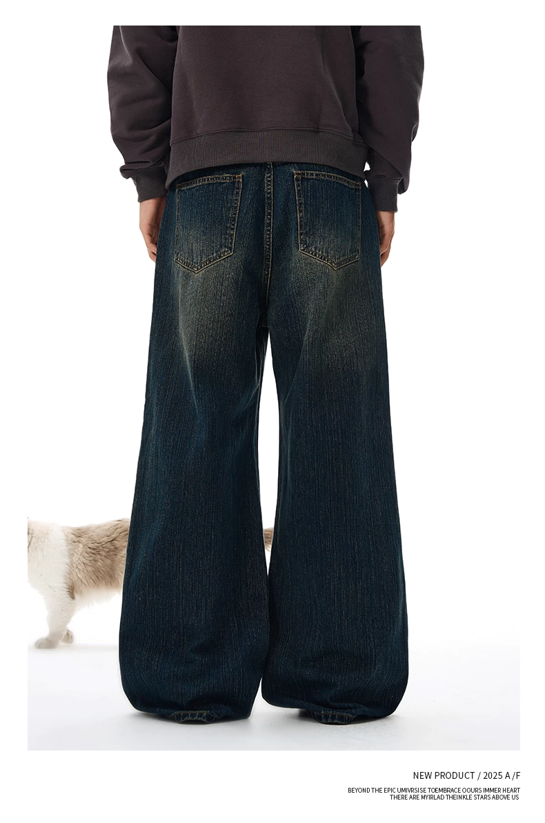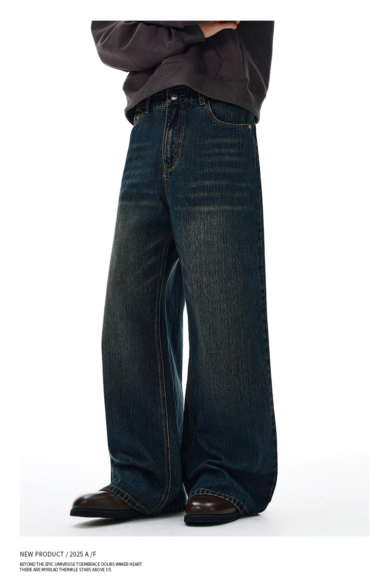 Quần jean kiểu Mỹ OMZM dành cho nam, quần ống đứng dày có họa tiết cổ điển mùa đông, quần ống rộng dài đến sàn