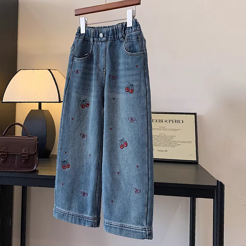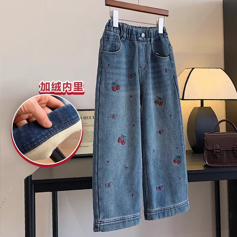 - Quần jean lót lông cừu cho bé gái, màu xanh nhạt thêu hình quả anh đào, lưng thun, quần ống rộng, quần dày dặn và ấm áp mùa đông dành cho trẻ lớn.